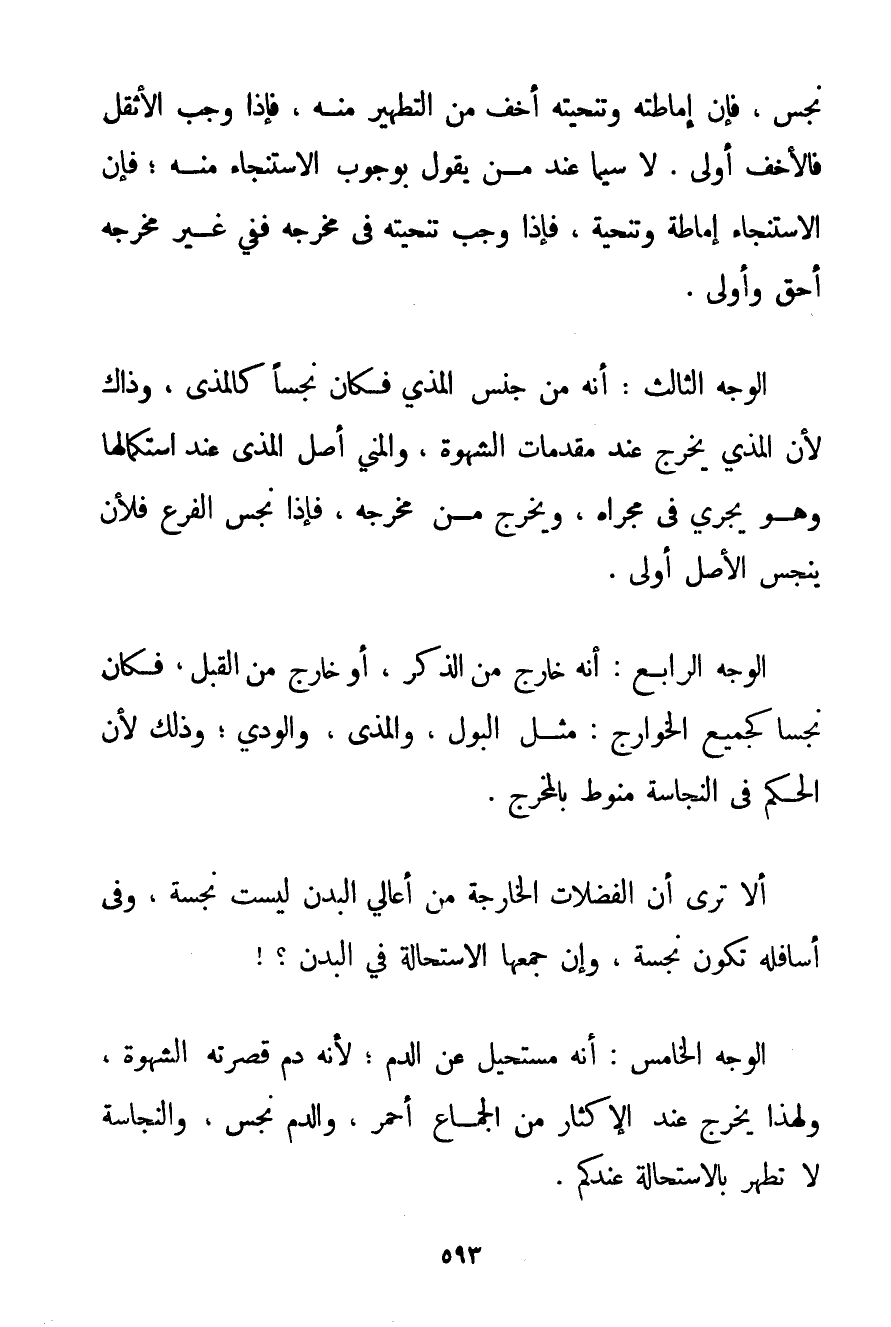 نَجِسٌ فَإِنَّ إمَاطَتَهُ وَتَنْحِيَتَهُ أَخَفُّ مِنْ التَّطَيُّرِ مِنْهُ فَإِذَا وَجَبَ الْأَثْقَلُ فَالْأَخَفُّ أَوْلَى. لَا سِيَّمَا عِنْدَ مَنْ يَقُولُ بِوُجُوبِ الِاسْتِنْجَاءِ مِنْهُ؛ فَإِنَّ الِاسْتِنْجَاءَ إمَاطَةٌ وَتَنْحِيَةٌ فَإِذَا وَجَبَ تَنْحِيَتُهُ فِي مَخْرَجِهِ فَفِي غَيْرِ مَخْرَجِهِ أَحَقُّ وَأَوْلَى. الْوَجْهُ الثَّالِثُ: أَنَّهُ مِنْ جِنْسِ الْمَذْيِ فَكَانَ نَجِسًا كَالْمَذْيِ وَذَاكَ لِأَنَّ الْمَذْيَ يَخْرُجُ عِنْدَ مُقَدِّمَاتِ الشَّهْوَةِ وَالْمَنِيُّ أَصْلُ الْمَذْيِ عِنْدَ اسْتِكْمَالِهَا وَهُوَ يَجْرِي فِي مَجْرَاهُ وَيَخْرُجُ مِنْ مَخْرَجِهِ فَإِذَا نُجِّسَ الْفَرْعُ فَلَأَنْ يُنَجَّسَ الْأَصْلُ أَوْلَى. الْوَجْهُ الرَّابِعُ: أَنَّهُ خَارِجٌ مِنْ الذَّكَرِ أَوْ خَارِجٌ مِنْ الْقُبُلِ فَكَانَ نَجِسًا كَجَمِيعِ الْخَوَارِجِ: مِثْلُ الْبَوْلِ وَالْمَذْيِ وَالْوَدْيِ؛ وَذَلِكَ لِأَنَّ الْحُكْمَ فِي النَّجَاسَةِ مَنُوطٌ بِالْمَخْرَجِ. أَلَا تَرَى أَنَّ الْفَضَلَاتِ الْخَارِجَةَ مِنْ أَعَالِي الْبَدَنِ لَيْسَتْ نَجِسَةً وَفِي أَسَافِلِهِ تَكُونُ نَجِسَةً وَإِنْ جَمَعَهَا الِاسْتِحَالَةُ فِي الْبَدَنِ؟ الْوَجْهُ الْخَامِسُ: أَنَّهُ مُسْتَحِيلٌ عَنْ الدَّمِ؛ لِأَنَّهُ دَمٌ قَصَرَتْهُ الشَّهْوَةُ وَلِهَذَا يَخْرُجُ عِنْدَ الْإِكْثَارِ مِنْ الْجِمَاعِ أَحْمَرَ وَالدَّمُ نَجِسٌ وَالنَّجَاسَةُ لَا تَطْهُرُ بِالِاسْتِحَالَةِ عِنْدَكُمْ.