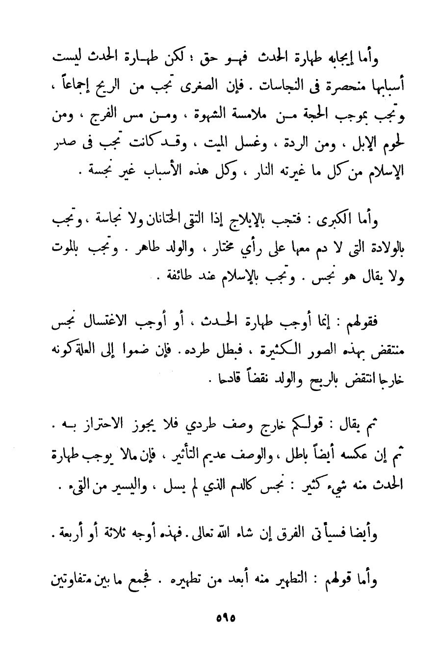 وَأَمَّا إيجَابُهُ طَهَارَةَ الْحَدَثِ فَهُوَ حَقٌّ؛ لَكِنَّ طَهَارَةَ الْحَدَثِ لَيْسَتْ أَسْبَابُهَا مُنْحَصِرَةً فِي النَّجَاسَاتِ. فَإِنَّ الصُّغْرَى تَجِبُ مِنْ الرِّيحِ إجْمَاعًا وَتَجِبُ بِمُوجَبِ الْحُجَّةِ مِنْ مُلَامَسَةِ الشَّهْوَةِ وَمِنْ مَسِّ الْفَرْجِ وَمِنْ لُحُومِ الْإِبِلِ وَمِنْ الرِّدَّةِ وَغَسْلِ الْمَيِّتِ وَقَدْ كَانَتْ تَجِبُ فِي صَدْرِ الْإِسْلَامِ مِنْ كُلِّ مَا غَيَّرَتْهُ النَّارُ وَكُلُّ هَذِهِ الْأَسْبَابُ غَيْرُ نَجِسَةٍ. وَأَمَّا الْكُبْرَى: فَتَجِبُ بِالْإِيلَاجِ إذَا الْتَقَى الْخِتَانَانِ وَلَا نَجَاسَةَ وَتَجِبُ بِالْوِلَادَةِ الَّتِي لَا دَمَ مَعَهَا عَلَى رَأْيٍ مُخْتَارٍ وَالْوَلَدُ طَاهِرٌ. وَتَجِبُ بِالْمَوْتِ وَلَا يُقَالُ هُوَ نَجِسٌ. وَتَجِبُ بِالْإِسْلَامِ عِنْدَ طَائِفَةٍ. فَقَوْلُهُمْ: إنَّمَا أَوْجَبَ طَهَارَةَ الْحَدَثِ أَوْ أَوْجَبَ الِاغْتِسَالَ نَجِسٌ مُنْتَقِضٌ بِهَذِهِ الصُّوَرِ الْكَثِيرَةِ فَبَطَلَ طَرْدُهُ. فَإِنْ ضَمُّوا إلَى الْعِلَّةِ كَوْنَهُ خَارِجًا انْتَقَضَ بِالرِّيحِ وَالْوَلَدِ نَقْضًا قَادِحًا. ثُمَّ يُقَالُ: قَوْلُكُمْ خَارِجٌ وَصْفٌ طَرْدِيٌّ فَلَا يَجُوزُ الِاحْتِرَازُ بِهِ. ثُمَّ إنَّ عَكْسَهُ أَيْضًا بَاطِلٌ وَالْوَصْفُ عَدِيمُ التَّأْثِيرِ فَإِنَّ مَا لَا يُوجِبُ طَهَارَةَ الْحَدَثِ مِنْهُ شَيْءٌ كَثِيرٌ: نَجِسٌ كَالدَّمِ الَّذِي لَمْ يُسَلَّ وَالْيَسِيرِ مِنْ الْقَيْءِ. وَأَيْضًا فَسَيَأْتِي الْفَرْقُ إنْ شَاءَ اللَّهُ تَعَالَى. فَهَذِهِ أَوْجُهٌ ثَلَاثَةٌ أَوْ أَرْبَعَةٌ. وَأَمَّا قَوْلُهُمْ: التَّطْهِيرُ مِنْهُ أَبْعَدُ مِنْ تَطْهِيرِهِ. فَجَمَعَ مَا بَيْنَ مُتَفَاوِتَيْنِ