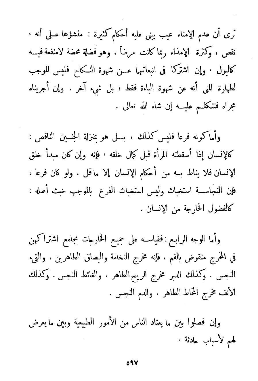 تَرَى أَنَّ عَدَمَ الْإِمْنَاءِ عَيْبٌ يُبْنَى عَلَيْهِ أَحْكَامٌ كَثِيرَةٌ: مَنْشَؤُهَا عَلَى أَنَّهُ نَقْصٌ وَكَثْرَةُ الْإِمْذَاءِ رُبَّمَا كَانَتْ مَرَضًا وَهُوَ فَضْلَةٌ مَحْضَةٌ لَا مَنْفَعَةَ فِيهِ كَالْبَوْلِ وَإِنْ اشْتَرَكَا فِي انْبِعَاثِهِمَا عَنْ شَهْوَةِ النِّكَاحِ فَلَيْسَ الْمُوجِبُ لِطَهَارَةِ الْمَنِيِّ أَنَّهُ عَنْ شَهْوَةِ الْبَاءَةِ فَقَطْ؛ بَلْ شَيْءٌ آخَرُ. وَإِنْ أَجْرَيْنَاهُ مَجْرَاهُ فَنَتَكَلَّمُ عَلَيْهِ إنْ شَاءَ اللَّهُ تَعَالَى. وَأَمَّا كَوْنُهُ فَرْعًا فَلَيْسَ كَذَلِكَ؛ بَلْ هُوَ بِمَنْزِلَةِ الْجَنِينِ النَّاقِصِ: كَالْإِنْسَانِ إذَا أَسْقَطَتْهُ الْمَرْأَةُ قَبْلَ كَمَالِ خَلْقِهِ فَإِنَّهُ وَإِنْ كَانَ مَبْدَأَ خَلْقِ الْإِنْسَانِ فَلَا يُنَاطُ بِهِ مِنْ أَحْكَامِ الْإِنْسَانِ إلَّا مَا قَلَّ وَلَوْ كَانَ فَرْعًا؛ فَإِنَّ النَّجَاسَةَ اسْتِخْبَاثٌ وَلَيْسَ اسْتِخْبَاثُ الْفَرْعِ بِالْمُوجِبِ خُبْثَ أَصْلِهِ: كَالْفُضُولِ الْخَارِجَةِ مِنْ الْإِنْسَانِ. وَأَمَّا الْوَجْهُ الرَّابِعُ: فَقِيَاسُهُ عَلَى جَمِيعِ الْخَارِجَاتِ بِجَامِعِ اشْتِرَاكِهِنَّ فِي الْمَخْرَجِ مَنْقُوضٌ بِالْفَمِ فَإِنَّهُ مَخْرَجُ النُّخَامَةِ وَالْبُصَاقِ الطَّاهِرَيْنِ وَالْقَيْءِ النَّجِسِ. وَكَذَلِكَ الدُّبُرُ مَخْرَجُ الرِّيحِ الطَّاهِرِ وَالْغَائِطِ النَّجِسِ. وَكَذَلِكَ الْأَنْفُ مَخْرَجُ الْمُخَاطِ الطَّاهِرِ وَالدَّمِ النَّجِسِ. وَإِنْ فَصَلُوا بَيْنَ مَا يَعْتَادُ النَّاسُ مِنْ الْأُمُورِ الطَّبِيعِيَّةِ وَبَيْنَ مَا يَعْرِضُ لَهُمْ لِأَسْبَابِ حَادِثَةٍ.