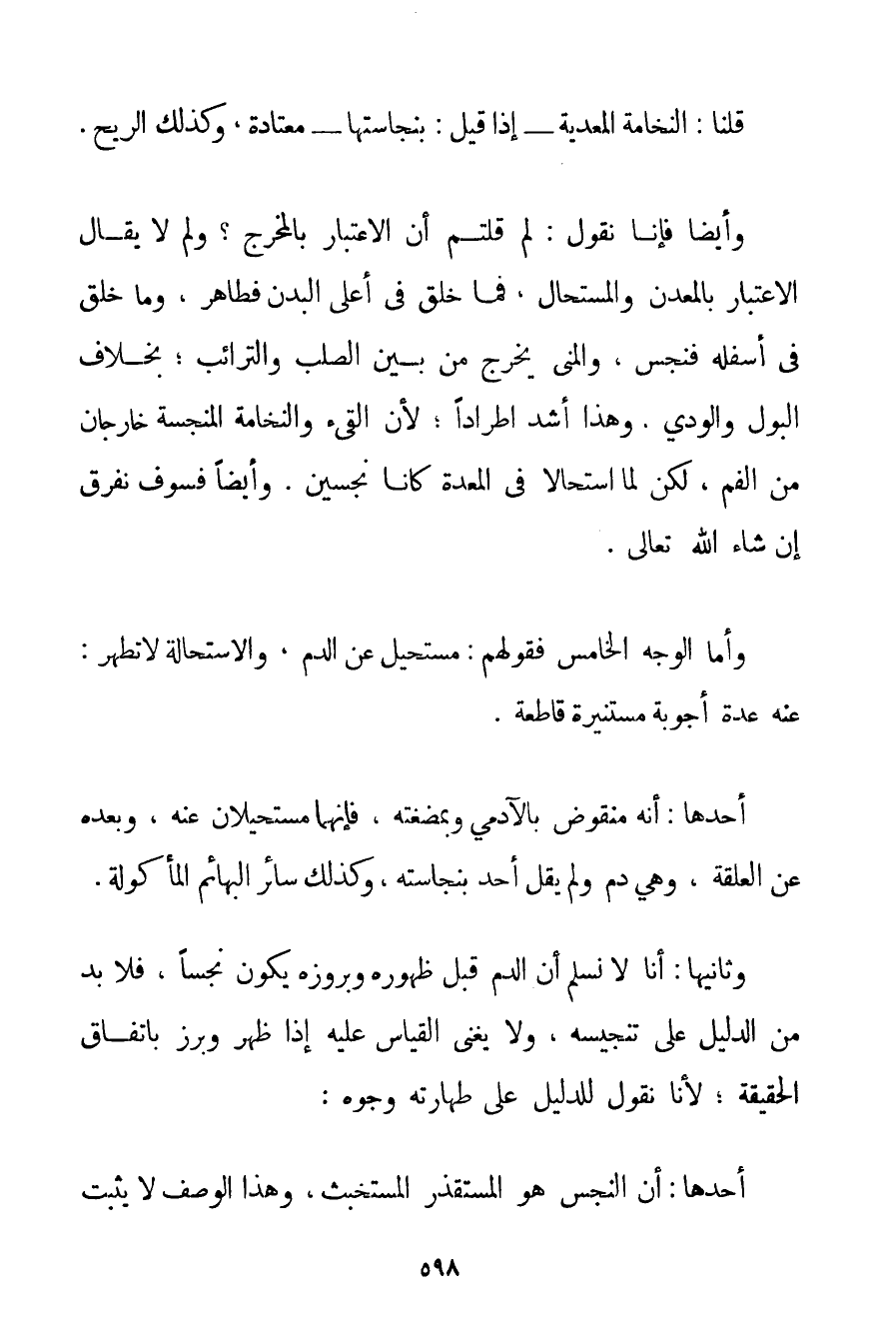 قُلْنَا: النُّخَامَةُ الْمُعْدِيَةُ - إذَا قِيلَ: بِنَجَاسَتِهَا - مُعْتَادَةٌ وَكَذَلِكَ الرِّيحُ. وَأَيْضًا فَإِنَّا نَقُولُ: لِمَ قُلْتُمْ إنَّ الِاعْتِبَارَ بِالْمَخْرَجِ؟ وَلِمَ لَا يُقَالُ الِاعْتِبَارُ بِالْمَعْدِنِ والمستحال فَمَا خُلِقَ فِي أَعْلَى الْبَدَنِ فَطَاهِرٌ وَمَا خُلِقَ فِي أَسْفَلِهِ فَنَجِسٌ وَالْمَنِيُّ يَخْرُجُ مِنْ بَيْنَ الصُّلْبِ وَالتَّرَائِبِ؛ بِخِلَافِ الْبَوْلِ وَالْوَدْيِ. وَهَذَا أَشَدُّ اطِّرَادًا؛ لِأَنَّ الْقَيْءَ وَالنُّخَامَةَ الْمُنَجَّسَةَ خَارِجَانِ مِنْ الْفَمِ لَكِنْ لَمَّا اسْتَحَالَا فِي الْمَعِدَةِ كَانَا نَجِسَيْنِ. وَأَيْضًا فَسَوْفَ نُفَرِّقُ إنْ شَاءَ اللَّهُ تَعَالَى. وَأَمَّا الْوَجْهُ الْخَامِسُ فَقَوْلُهُمْ: مُسْتَحِيلٌ عَنْ الدَّمِ وَالِاسْتِحَالَةُ لَا تُطَهِّرُ: عَنْهُ عِدَّةُ أَجْوِبَةٍ مُسْتَنِيرَةٍ قَاطِعَةٍ. أَحَدُهَا: أَنَّهُ مَنْقُوضٌ بِالْآدَمِيِّ وَبِمُضْغَتِهِ فَإِنَّهُمَا مُسْتَحِيلَانِ عَنْهُ وَبَعْدَهُ عَنْ الْعَلَقَةِ وَهِيَ دَمٌ وَلَمْ يَقُلْ أَحَدٌ بِنَجَاسَتِهِ وَكَذَلِكَ سَائِرُ الْبَهَائِمِ الْمَأْكُولَةِ. وَثَانِيهَا: أَنَّا لَا نُسَلِّمُ أَنَّ الدَّمَ قَبْلَ ظُهُورِهِ وَبُرُوزِهِ يَكُونُ نَجِسًا فَلَا بُدَّ مِنْ الدَّلِيلِ عَلَى تَنْجِيسِهِ وَلَا يُغْنِي الْقِيَاسُ عَلَيْهِ إذَا ظَهَرَ وَبَرَزَ بِاتِّفَاقِ الْحَقِيقَةِ؛ لِأَنَّا نَقُولُ لِلدَّلِيلِ عَلَى طَهَارَتِهِ وُجُوهٌ: أَحَدُهَا: أَنَّ النَّجِسَ هُوَ الْمُسْتَقْذَرُ الْمُسْتَخْبَثُ وَهَذَا الْوَصْفُ لَا يَثْبُتُ