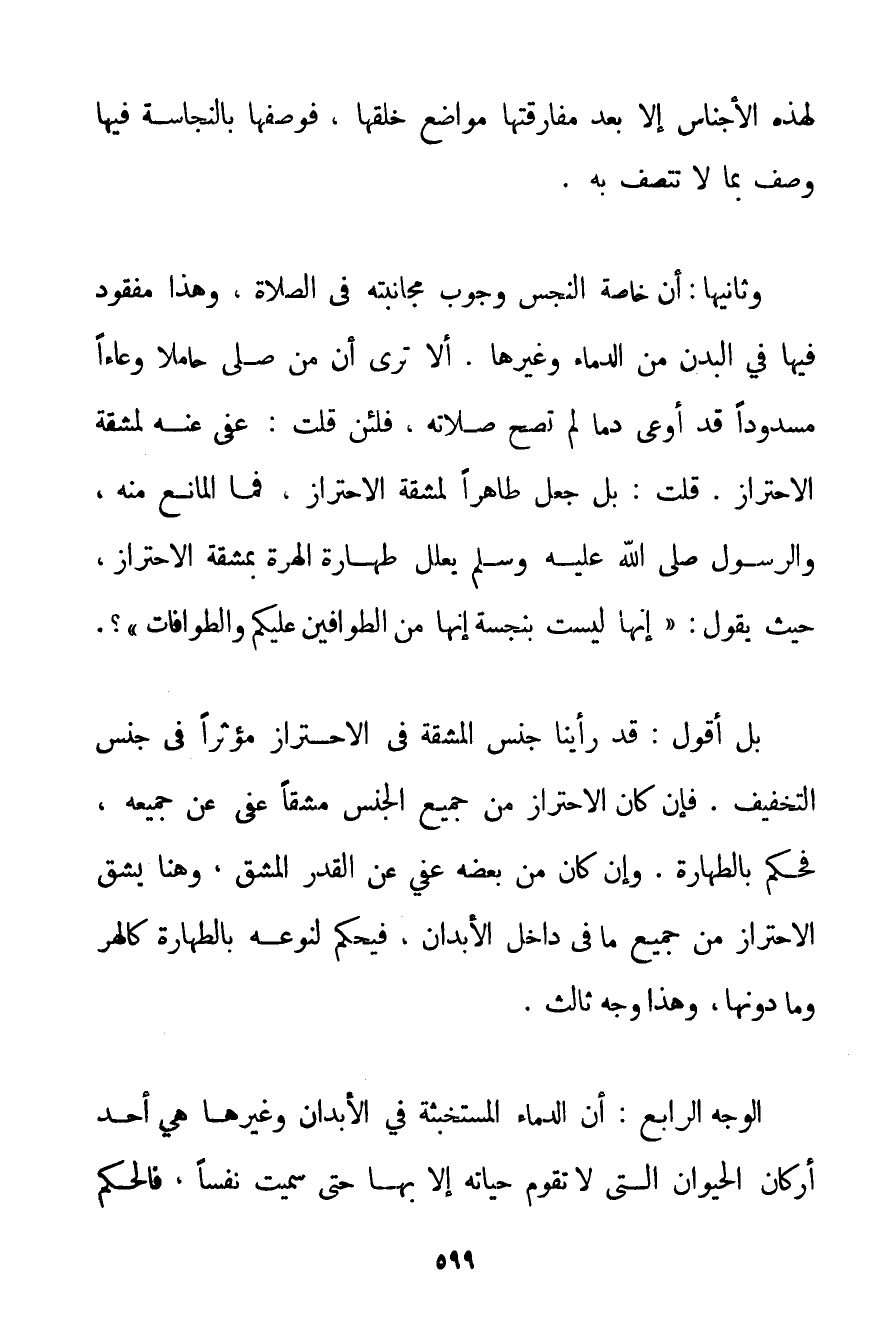 لِهَذِهِ الْأَجْنَاسِ إلَّا بَعْدَ مُفَارَقَتِهَا مَوَاضِعَ خَلْقِهَا فَوَصْفُهَا بِالنَّجَاسَةِ فِيهَا وَصْفٌ بِمَا لَا تَتَّصِفُ بِهِ. وَثَانِيهَا: أَنَّ خَاصَّةَ النَّجِسِ وُجُوبُ مُجَانَبَتِهِ فِي الصَّلَاةِ. وَهَذَا مَفْقُودٌ فِيهَا فِي الْبَدَنِ مِنْ الدِّمَاءِ وَغَيْرِهَا. أَلَا تَرَى أَنَّ مَنْ صَلَّى حَامِلًا وِعَاءً مَسْدُودًا قَدْ أُوعِيَ دَمًا لَمْ تَصِحَّ صَلَاتُهُ فَلَئِنْ قُلْت: عُفِيَ عَنْهُ لِمَشَقَّةِ الِاحْتِرَازِ. قُلْت: بَلْ جُعِلَ طَاهِرًا لِمَشَقَّةِ الِاحْتِرَازِ. فَمَا الْمَانِعُ مِنْهُ وَالرَّسُولُ صَلَّى اللَّهُ عَلَيْهِ وَسَلَّمَ يُعَلِّلُ طَهَارَةَ الْهِرَّةِ بِمَشَقَّةِ الِاحْتِرَازِ حَيْثُ يَقُولُ: {إنَّهَا لَيْسَتْ بِنَجِسَةٍ إنَّهَا مِنْ الطَّوَّافِينَ عَلَيْكُمْ وَالطَّوَّافَاتِ} ؟ . بَلْ أَقُولُ: قَدْ رَأَيْنَا جِنْسَ الْمَشَقَّةِ فِي الِاحْتِرَازِ مُؤَثِّرًا فِي جِنْسِ التَّخْفِيفِ. فَإِنْ كَانَ الِاحْتِرَازُ مِنْ جَمِيعِ الْجِنْسِ مشقا عُفِيَ عَنْ جَمِيعِهِ فَحُكِمَ بِالطَّهَارَةِ. وَإِنْ كَانَ مِنْ بَعْضِهِ عُفِيَ عَنْ الْقَدْرِ المشق وَهُنَا يَشُقُّ الِاحْتِرَازُ مِنْ جَمِيعِ مَا فِي دَاخِلِ الْأَبْدَانِ فَيُحْكَمُ لِنَوْعِهِ بِالطَّهَارَةِ كَالْهِرِّ وَمَا دُونَهَا وَهَذَا وَجْهٌ ثَالِثٌ. الْوَجْهُ الرَّابِعُ: أَنَّ الدِّمَاءَ الْمُسْتَخْبَثَةَ فِي الْأَبْدَانِ وَغَيْرِهَا هِيَ أَحَدُ أَرْكَانِ الْحَيَوَانِ الَّتِي لَا تَقُومُ حَيَاتُهُ إلَّا بِهَا حَتَّى سُمِّيَتْ نَفْسًا فَالْحُكْمُ