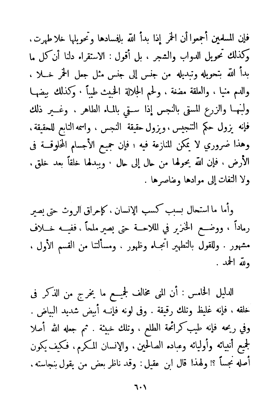 فَإِنَّ الْمُسْلِمِينَ أَجْمَعُوا أَنَّ الْخَمْرَ إذَا بَدَأَ اللَّهُ بِإِفْسَادِهَا وَتَحْوِيلِهَا خَلًّا طَهُرَتْ وَكَذَلِكَ تَحْوِيلُ الدَّوَابِّ وَالشَّجَرِ بَلْ أَقُولُ: الِاسْتِقْرَاءُ دَلَّنَا أَنَّ كُلَّ مَا بَدَأَ اللَّهُ بِتَحْوِيلِهِ وَتَبْدِيلِهِ مِنْ جِنْسٍ إلَى جِنْسٍ مِثْلُ جَعْلِ الْخَمْرِ خَلًّا وَالدَّمِ مَنِيًّا وَالْعَلَقَةِ مُضْغَةً وَلَحْمِ الْجَلَّالَةِ الْخَبِيثِ طَيِّبًا وَكَذَلِكَ بَيْضُهَا وَلَبَنُهَا وَالزَّرْعُ الْمَسْقِيُّ بِالنَّجِسِ إذَا سُقِيَ بِالْمَاءِ الطَّاهِرِ وَغَيْرِ ذَلِكَ فَإِنَّهُ يَزُولُ حُكْمُ التَّنْجِيسِ وَيَزُولُ حَقِيقَةُ النَّجِسِ وَاسْمُهُ التَّابِعُ لِلْحَقِيقَةِ وَهَذَا ضَرُورِيٌّ لَا يُمْكِنُ الْمُنَازَعَةُ فِيهِ؛ فَإِنَّ جَمِيعَ الْأَجْسَامِ الْمَخْلُوقَةِ فِي الْأَرْضِ فَإِنَّ اللَّهَ يُحَوِّلُهَا مِنْ حَالٍ إلَى حَالٍ وَيُبَدِّلُهَا خَلْقًا بَعْدَ خَلْقٍ وَلَا الْتِفَاتَ إلَى مَوَادِّهَا وَعَنَاصِرِهَا. وَأَمَّا مَا اسْتَحَالَ بِسَبَبِ كَسْبِ الْإِنْسَانِ كَإِحْرَاقِ الرَّوْثِ حَتَّى يَصِيرَ رَمَادًا وَوَضْعِ الْخِنْزِيرِ فِي الْمَلَّاحَةِ حَتَّى يَصِيرَ مِلْحًا فَفِيهِ خِلَافٌ مَشْهُورٌ. وَلِلْقَوْلِ بِالتَّطْهِيرِ اتِّجَاهٌ وَظُهُورُ وَمَسْأَلَتِنَا مِنْ الْقِسْمِ الْأَوَّلِ وَلِلَّهِ الْحَمْدُ. الدَّلِيلُ الْخَامِسُ: أَنَّ الْمَنِيَّ مُخَالِفٌ لِجَمِيعِ مَا يَخْرُجُ مِنْ الذَّكَرِ فِي خَلْقِهِ فَإِنَّهُ غَلِيظٌ وَتِلْكَ رَقِيقَةٌ. وَفِي لَوْنِهِ فَإِنَّهُ أَبْيَضُ شَدِيدُ الْبَيَاضِ. وَفِي رِيحِهِ فَإِنَّهُ طَيِّبٌ كَرَائِحَةِ الطَّلْعِ وَتِلْكَ خَبِيثَةٌ. ثُمَّ جَعَلَهُ اللَّهُ أَصْلًا لِجَمِيعِ أَنْبِيَائِهِ وَأَوْلِيَائِهِ وَعِبَادِهِ الصَّالِحِينَ وَالْإِنْسَانِ الْمُكَرَّمِ فَكَيْفَ يَكُونُ أَصْلُهُ نَجِسًا وَلِهَذَا قَالَ ابْنُ عَقِيلٍ: وَقَدْ نَاظَرَ بَعْضَ مَنْ يَقُولُ بِنَجَاسَتِهِ
