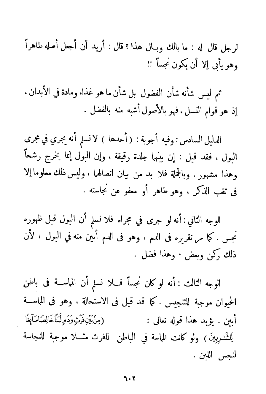 لِرَجُلِ قَالَ لَهُ: مَا بَالُك وَبَالُ هَذَا؟ قَالَ: أُرِيدَ أَنْ أَجْعَلَ أَصْلَهُ طَاهِرًا وَهُوَ يَأْبَى إلَّا أَنْ يَكُونَ نَجِسًا ثُمَّ لَيْسَ شَأْنُهُ شَأْنَ الْفُضُولِ بَلْ شَأْنَ مَا هُوَ غِذَاءٌ وَمَادَّةٌ فِي الْأَبْدَانِ إذْ هُوَ قِوَامُ النَّسْلِ فَهُوَ بِالْأُصُولِ أَشْبَهُ مِنْهُ بِالْفَضْلِ. الدَّلِيلُ السَّادِسُ: وَفِيهِ أَجْوِبَةٌ: (أَحَدُهَا لَا نُسَلِّمُ أَنَّهُ يَجْرِي فِي مَجْرَى الْبَوْلِ فَقَدْ قِيلَ: إنَّ بَيْنَهُمَا جِلْدَةٌ رَقِيقَةٌ وَإِنَّ الْبَوْلَ إنَّمَا يَخْرُجُ رَشْحًا وَهَذَا مَشْهُورٌ. وَبِالْجُمْلَةِ فَلَا بُدَّ مِنْ بَيَانِ اتِّصَالِهِمَا وَلَيْسَ ذَلِكَ مَعْلُومًا إلَّا فِي ثُقْبِ الذَّكَرِ وَهُوَ طَاهِرٌ أَوْ مَعْفُوٌّ عَنْ نَجَاسَتِهِ. الْوَجْهُ الثَّانِي: أَنَّهُ لَوْ جَرَى فِي مَجْرَاهُ فَلَا نُسَلِّمُ أَنَّ الْبَوْلَ قَبْلَ ظُهُورِهِ نَجِسٌ. كَمَا مَرَّ تَقْرِيرُهُ فِي الدَّمِ وَهُوَ فِي الدَّمِ أَبْيَنُ مِنْهُ فِي الْبَوْلِ؛ لِأَنَّ ذَلِكَ رُكْنٌ وَبَعْضُ وَهَذَا فَضْلٌ. الْوَجْهُ الثَّالِثُ: أَنَّهُ لَوْ كَانَ نَجِسًا فَلَا نُسَلِّمُ أَنَّ الْمُمَاسَّةَ فِي بَاطِنِ الْحَيَوَانِ مُوجِبَةٌ لِلتَّنْجِيسِ. كَمَا قَدْ قِيلَ فِي الِاسْتِحَالَةِ وَهُوَ فِي الْمُمَاسَّةِ أَبْيَنُ. يُؤَيِّدُ هَذَا قَوْله تَعَالَى {مِنْ بَيْنِ فَرْثٍ وَدَمٍ لَبَنًا خَالِصًا سَائِغًا لِلشَّارِبِينَ} وَلَوْ كَانَتْ الْمُمَاسَّةُ فِي الْبَاطِنِ لِلْفَرْثِ مَثَلًا مُوجِبَةً لِلنَّجَاسَةِ لَنُجِّسَ اللَّبَنُ.