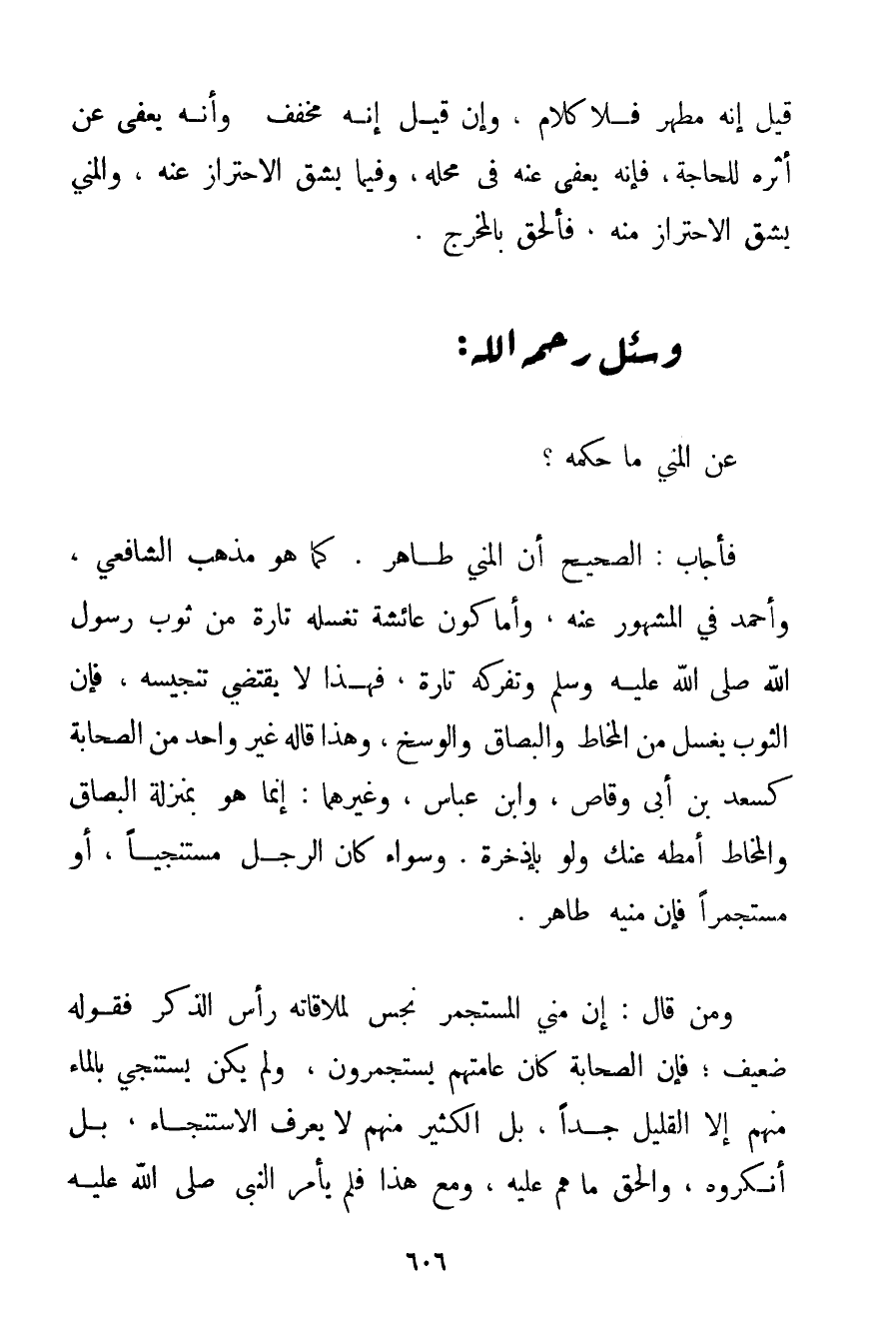 الصَّحِيحُ أَنَّ الْمَنِيَّ طَاهِرٌ. كَمَا هُوَ مَذْهَبُ الشَّافِعِيِّ وَأَحْمَد فِي الْمَشْهُورِ عَنْهُ وَأَمَّا كَوْنُ عَائِشَةَ تَغْسِلُهُ تَارَةً مِنْ ثَوْبِ رَسُولِ اللَّهِ صَلَّى اللَّهُ عَلَيْهِ وَسَلَّمَ وَتَفْرُكُهُ تَارَةً فَهَذَا لَا يَقْتَضِي تَنْجِيسَهُ فَإِنَّ الثَّوْبَ يُغْسَلُ مِنْ الْمُخَاطِ وَالْبُصَاقِ وَالْوَسَخِ وَهَذَا قَالَهُ غَيْرُ وَاحِدٍ مِنْ الصَّحَابَةِ كَسَعْدِ بْن أَبِي وَقَّاصٍ وَابْنِ عَبَّاسٍ وَغَيْرِهِمَا: إنَّمَا هُوَ بِمَنْزِلَةِ الْبُصَاقِ وَالْمُخَاطِ أَمِطْهُ عَنْك وَلَوْ بإذخرة. وَسَوَاءٌ كَانَ الرَّجُلُ مُسْتَنْجِيًا أَوْ مُسْتَجْمِرًا فَإِنَّ مَنِيَّهُ طَاهِرٌ. وَمَنْ قَالَ: إنَّ مَنِيَّ الْمُسْتَجْمِرِ نَجِسٌ لِمُلَاقَاتِهِ رَأْسَ الذَّكَرِ فَقَوْلُهُ ضَعِيفٌ فَإِنَّ الصَّحَابَةَ كَانَ عَامَّتُهُمْ يَسْتَجْمِرُونَ وَلَمْ يَكُنْ يَسْتَنْجِي بِالْمَاءِ مِنْهُمْ إلَّا الْقَلِيلُ جِدًّا بَلْ الْكَثِيرُ مِنْهُمْ لَا يَعْرِفُ الِاسْتِنْجَاءَ بَلْ أَنْكَرُوهُ وَالْحَقُّ مَا هُمْ عَلَيْهِ وَمَعَ هَذَا فَلَمْ يَأْمُرْ النَّبِيُّ صَلَّى اللَّهُ عَلَيْهِ وَسَلَّمَ