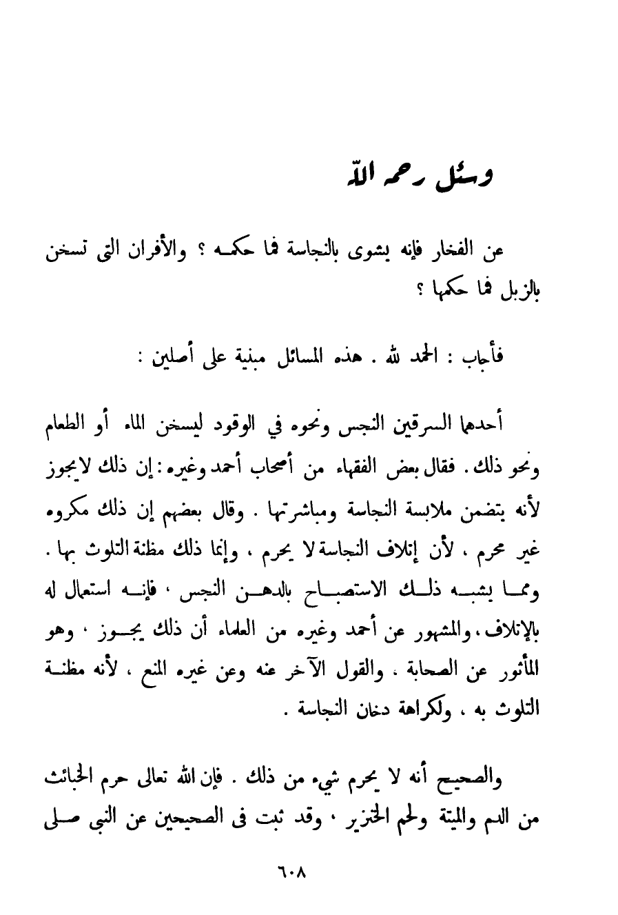 الْحَمْدُ لِلَّهِ، هَذِهِ الْمَسَائِلُ مَبْنِيَّةٌ عَلَى أَصْلَيْنِ: أَحَدُهُمَا السِّرْقِينُ النَّجِسُ وَنَحْوُهُ فِي الْوَقُودِ لِيُسَخِّنَ الْمَاءَ أَوْ الطَّعَامَ وَنَحْوَ ذَلِكَ. فَقَالَ بَعْضُ الْفُقَهَاءِ مِنْ أَصْحَابِ أَحْمَد وَغَيْرِهِ: إنَّ ذَلِكَ لَا يَجُوزُ لِأَنَّهُ يَتَضَمَّنُ مُلَابَسَةَ النَّجَاسَةِ وَمُبَاشَرَتَهَا. وَقَالَ بَعْضُهُمْ إنَّ ذَلِكَ مَكْرُوهٌ غَيْرُ مُحَرَّمٍ لِأَنَّ إتْلَافَ النَّجَاسَةِ لَا يَحْرُمُ وَإِنَّمَا ذَلِكَ مَظِنَّةُ التَّلَوُّثِ بِهَا. وَمِمَّا يُشْبِهُ ذَلِكَ الِاسْتِصْبَاحُ بِالدُّهْنِ النَّجِسِ فَإِنَّهُ اسْتِعْمَالٌ لَهُ بِالْإِتْلَافِ وَالْمَشْهُورُ عَنْ أَحْمَد وَغَيْرِهِ مِنْ الْعُلَمَاءِ أَنَّ ذَلِكَ يَجُوزُ وَهُوَ الْمَأْثُورُ عَنْ الصَّحَابَةِ وَالْقَوْلُ الْآخَرُ عَنْهُ وَعَنْ غَيْرِهِ الْمَنْعُ لِأَنَّهُ مَظِنَّةُ التَّلَوُّثِ بِهِ وَلِكَرَاهَةِ دُخَّانِ النَّجَاسَةِ. وَالصَّحِيحُ أَنَّهُ لَا يَحْرُمُ شَيْءٌ مِنْ ذَلِكَ. فَإِنَّ اللَّهَ تَعَالَى حَرَّمَ الْخَبَائِثَ مِنْ الدَّمِ وَالْمَيْتَةِ وَلَحْمِ الْخِنْزِيرِ وَقَدْ ثَبَتَ فِي الصَّحِيحَيْنِ عَنْ النَّبِيِّ صَلَّى اللَّهُ عَلَيْهِ وَسَلَّمَ