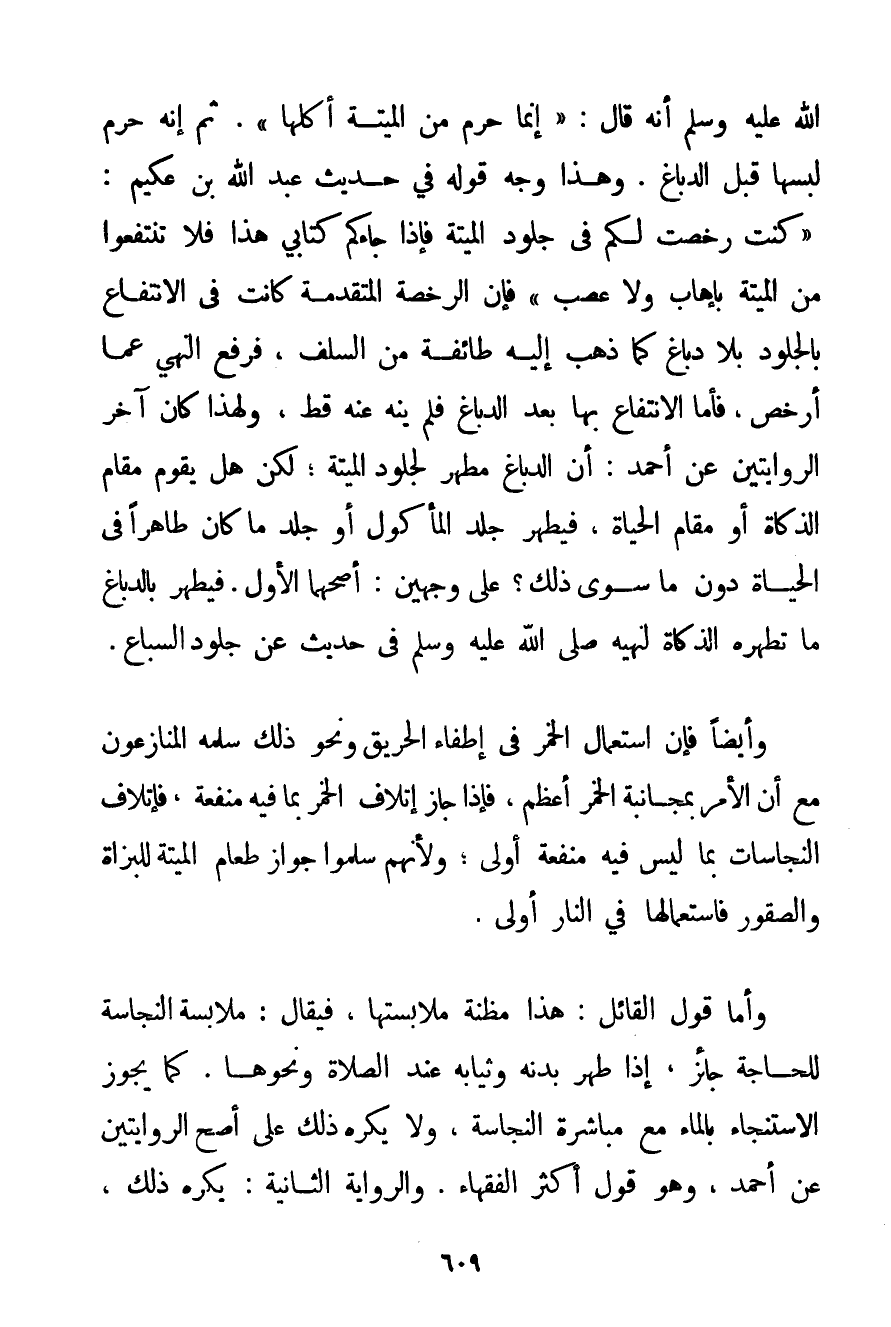 أَنَّهُ قَالَ: {إنَّمَا حُرِّمَ مِنْ الْمَيْتَةِ أَكْلُهَا} . ثُمَّ إنَّهُ حَرَّمَ لُبْسَهَا قَبْلَ الدِّبَاغِ. وَهَذَا وَجْهٌ قَوْلُهُ فِي حَدِيثِ عَبْدِ اللَّهِ بْنِ عكيم: {كُنْت رَخَّصْت لَكُمْ فِي جُلُودِ الْمَيْتَةِ فَإِذَا جَاءَكُمْ كِتَابِي هَذَا فَلَا تَنْتَفِعُوا مِنْ الْمَيْتَةِ بِإِهَابِ وَلَا عَصَبٍ} فَإِنَّ الرُّخْصَةَ الْمُتَقَدِّمَةَ كَانَتْ فِي الِانْتِفَاعِ بِالْجُلُودِ بِلَا دِبَاغٍ كَمَا ذَهَبَ إلَيْهِ طَائِفَةٌ مِنْ السَّلَفِ فَرَفَعَ النَّهْيَ عَمَّا أَرْخَصَ فَأَمَّا الِانْتِفَاعُ بِهَا بَعْدَ الدِّبَاغِ فَلَمْ يَنْهَ عَنْهُ قَطُّ وَلِهَذَا كَانَ آخِرُ الرِّوَايَتَيْنِ عَنْ أَحْمَد: أَنَّ الدِّبَاغَ مُطَهِّرٌ لِجُلُودِ الْمَيْتَةِ: لَكِنْ هَلْ يَقُومُ مَقَامَ الذَّكَاةِ أَوْ مَقَامَ الْحَيَاةِ فَيُطَهِّرُ جِلْدَ الْمَأْكُولِ أَوْ جِلْدَ مَا كَانَ طَاهِرًا فِي الْحَيَاةِ دُونَ مَا سِوَى ذَلِكَ؟ عَلَى وَجْهَيْنِ: أَصَحُّهُمَا الْأَوَّلُ. فَيَطْهُرُ بِالدِّبَاغِ مَا تُطَهِّرُهُ الذَّكَاةُ لِنَهْيِهِ صَلَّى اللَّهُ عَلَيْهِ وَسَلَّمَ فِي حَدِيثٍ عَنْ جُلُودِ السِّبَاعِ. وَأَيْضًا فَإِنَّ اسْتِعْمَالَ الْخَمْرِ فِي إطْفَاءِ الْحَرِيقِ وَنَحْوِ ذَلِكَ سَلَّمَهُ الْمُنَازِعُونَ مَعَ أَنَّ الْأَمْرَ بِمُجَانَبَةِ الْخَمْرِ أَعْظَمُ فَإِذَا جَازَ إتْلَافُ الْخَمْرِ بِمَا فِيهِ مَنْفَعَةٌ فَإِتْلَافُ النَّجَاسَاتِ بِمَا لَيْسَ فِيهِ مَنْفَعَةٌ أَوْلَى؛ وَلِأَنَّهُمْ سَلَّمُوا جَوَازَ طَعَامِ الْمَيْتَةِ لِلْبُزَاةِ وَالصُّقُورِ فَاسْتِعْمَالُهَا فِي النَّارِ أَوْلَى. وَأَمَّا قَوْلُ الْقَائِلِ: هَذَا مَظِنَّةُ مُلَابَسَتِهَا فَيُقَالُ: مُلَابَسَةُ النَّجَاسَةِ لِلْحَاجَةِ جَائِزٌ إذَا طَهَّرَ بَدَنَهُ وَثِيَابَهُ عِنْدَ الصَّلَاةِ وَنَحْوِهَا. كَمَا يَجُوزُ الِاسْتِنْجَاءُ بِالْمَاءِ مَعَ مُبَاشَرَةِ النَّجَاسَةِ وَلَا يُكْرَهُ ذَلِكَ عَلَى أَصَحِّ الرِّوَايَتَيْنِ عَنْ أَحْمَد وَهُوَ قَوْلُ أَكْثَرِ الْفُقَهَاءِ. وَالرِّوَايَةُ الثَّانِيَةُ: يُكْرَهُ ذَلِكَ.
