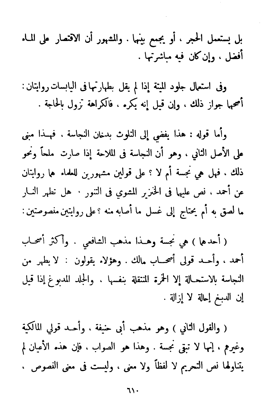 بَلْ يُسْتَعْمَلُ الْحَجَرُ أَوْ يَجْمَعُ بَيْنَهُمَا. وَالْمَشْهُورُ أَنَّ الِاقْتِصَارَ عَلَى الْمَاءِ أَفْضَلُ وَإِنْ كَانَ فِيهِ مُبَاشَرَتُهَا. وَفِي اسْتِعْمَالِ جُلُودِ الْمَيْتَةِ إذَا لَمْ يَقُلْ بِطَهَارَتِهَا فِي الْيَابِسَاتِ رِوَايَتَانِ: أَصَحُّهُمَا جَوَازُ ذَلِكَ وَإِنْ قِيلَ إنَّهُ يُكْرَهُ فَالْكَرَاهَةُ تَزُولُ بِالْحَاجَةِ. وَأَمَّا قَوْلُهُ: هَذَا يُفْضِي إلَى التَّلَوُّثِ بِدُخَّانِ النَّجَاسَةِ فَهَذَا مَبْنِيٌّ عَلَى الْأَصْلِ الثَّانِي وَهُوَ أَنَّ النَّجَاسَةَ فِي الْمَلَّاحَةِ إذَا صَارَتْ مِلْحًا وَنَحْوَ ذَلِكَ فَهَلْ هِيَ نَجِسَةٌ أَمْ لَا؟ عَلَى قَوْلَيْنِ مَشْهُورَيْنِ لِلْعُلَمَاءِ هُمَا رِوَايَتَانِ عَنْ أَحْمَد نَصَّ عَلَيْهِمَا فِي الْخِنْزِيرِ الْمَشْوِيِّ فِي التَّنُّورِ هَلْ تُطَهِّرُ النَّارُ مَا لَصِقَ بِهِ أَمْ يَحْتَاجُ إلَى غَسْلِ مَا أَصَابَهُ مِنْهُ؟ عَلَى رِوَايَتَيْنِ مَنْصُوصَتَيْنِ: