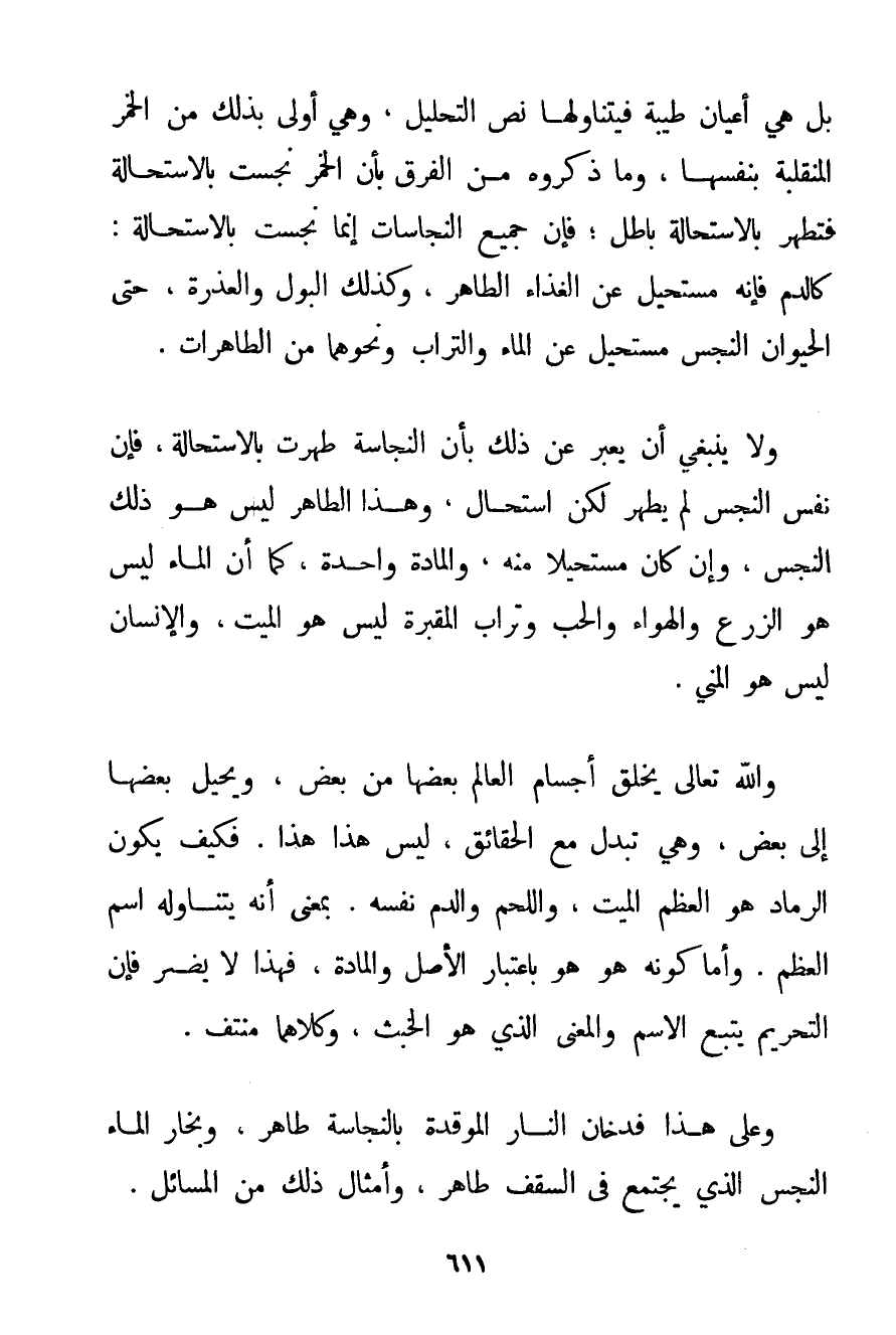 بَلْ هِيَ أَعْيَانٌ طَيِّبَةٌ فَيَتَنَاوَلُهَا نَصُّ التَّحْلِيلِ وَهِيَ أَوْلَى بِذَلِكَ مِنْ الْخَمْرِ الْمُنْقَلِبَةِ بِنَفْسِهَا وَمَا ذَكَرُوهُ مِنْ الْفَرْقِ بِأَنَّ الْخَمْرَ نَجُسَتْ بِالِاسْتِحَالَةِ فَتَطْهُرُ بِالِاسْتِحَالَةِ بَاطِلٌ؛ فَإِنَّ جَمِيعَ النَّجَاسَاتِ إنَّمَا نَجُسَتْ بِالِاسْتِحَالَةِ: كَالدَّمِ فَإِنَّهُ مُسْتَحِيلٌ عَنْ الْغِذَاءِ الطَّاهِرِ وَكَذَلِكَ الْبَوْلُ وَالْعَذِرَةُ حَتَّى الْحَيَوَانُ النَّجِسُ مُسْتَحِيلٌ عَنْ الْمَاءِ وَالتُّرَابِ وَنَحْوِهِمَا مِنْ الطَّاهِرَاتِ. وَلَا يَنْبَغِي أَنْ يُعَبَّرَ عَنْ ذَلِكَ بِأَنَّ النَّجَاسَةَ طَهُرَتْ بِالِاسْتِحَالَةِ فَإِنَّ نَفْسَ النَّجِسِ لَمْ يَطْهُرْ لَكِنْ اسْتَحَالَ وَهَذَا الطَّاهِرُ لَيْسَ هُوَ ذَلِكَ النَّجِسَ وَإِنْ كَانَ مُسْتَحِيلًا مِنْهُ وَالْمَادَّةُ وَاحِدَةٌ كَمَا أَنَّ الْمَاءَ لَيْسَ هُوَ الزَّرْعَ وَالْهَوَاءَ وَالْحَبَّ وَتُرَابُ الْمَقْبَرَةِ لَيْسَ هُوَ الْمَيِّتَ وَالْإِنْسَانُ لَيْسَ هُوَ الْمَنِيَّ. وَاَللَّهُ تَعَالَى يَخْلُقُ أَجْسَامَ الْعَالَمِ بَعْضَهَا مِنْ بَعْضٍ وَيُحِيلُ بَعْضَهَا إلَى بَعْضٍ وَهِيَ تُبَدَّلُ مَعَ الْحَقَائِقِ لَيْسَ هَذَا هَذَا. فَكَيْفَ يَكُونُ الرَّمَادُ هُوَ الْعَظْمَ الْمَيِّتَ وَاللَّحْمَ وَالدَّمَ نَفْسَهُ. بِمَعْنَى أَنَّهُ يَتَنَاوَلُهُ اسْمُ الْعَظْمِ. وَأَمَّا كَوْنُهُ هُوَ هُوَ بِاعْتِبَارِ الْأَصْلِ وَالْمَادَّةِ فَهَذَا لَا يَضُرُّ فَإِنَّ التَّحْرِيمَ يَتْبَعُ الِاسْمَ وَالْمَعْنَى الَّذِي هُوَ الْخَبَثُ وَكِلَاهُمَا مُنْتَفٍ. وَعَلَى هَذَا فَدُخَانُ النَّارِ الْمُوقَدَةِ بِالنَّجَاسَةِ طَاهِرٌ وَبُخَارُ الْمَاءِ النَّجِسِ الَّذِي يَجْتَمِعُ فِي السَّقْفِ طَاهِرٌ وَأَمْثَالُ ذَلِكَ مِنْ الْمَسَائِلِ