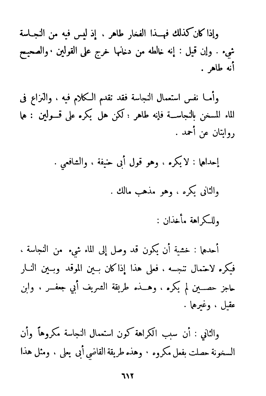 وَإِذَا كَانَ كَذَلِكَ فَهَذَا الْفَخَّارُ طَاهِرٌ إذْ لَيْسَ فِيهِ مِنْ النَّجَاسَةِ شَيْءٌ. وَإِنْ قِيلَ: إنَّهُ خَالَطَهُ مِنْ دُخَانِهَا خَرَجَ عَلَى الْقَوْلَيْنِ وَالصَّحِيحُ أَنَّهُ طَاهِرٌ. وَأَمَّا نَفْسُ اسْتِعْمَالِ النَّجَاسَةِ فَقَدْ تَقَدَّمَ الْكَلَامُ فِيهِ وَالنِّزَاعُ فِي الْمَاءِ الْمُسَخَّنِ بِالنَّجَاسَةِ فَإِنَّهُ طَاهِرٌ؛ لَكِنْ هَلْ يُكْرَهُ عَلَى قَوْلَيْنِ: هُمَا رِوَايَتَانِ عَنْ أَحْمَد. إحْدَاهُمَا: لَا يُكْرَهُ وَهُوَ قَوْلُ أَبِي حَنِيفَةَ وَالشَّافِعِيِّ. وَالثَّانِي يُكْرَهُ وَهُوَ مَذْهَبُ مَالِكٍ. وَلِلْكَرَاهَةِ مَأْخَذَانِ: أَحَدُهُمَا: خَشْيَةُ أَنْ يَكُونَ قَدْ وَصَلَ إلَى الْمَاءِ شَيْءٌ مِنْ النَّجَاسَةِ فَيُكْرَهُ لِاحْتِمَالِ تَنَجُّسِهِ فَعَلَى هَذَا إذَا كَانَ بَيْنَ الْمَوْقِدِ وَبَيْنَ النَّارِ حَاجِزٌ حَصِينٌ لَمْ يُكْرَهْ وَهَذِهِ طَرِيقَةُ الشَّرِيفِ أَبِي جَعْفَرٍ وَابْنِ عَقِيلٍ وَغَيْرِهِمَا. وَالثَّانِي: أَنَّ سَبَبَ الْكَرَاهَةِ كَوْنُ اسْتِعْمَالِ النَّجَاسَةِ مَكْرُوهًا وَأَنَّ السُّخُونَةَ حَصَلَتْ بِفِعْلِ مَكْرُوهٍ وَهَذِهِ طَرِيقَةُ الْقَاضِي أَبِي يَعْلَى وَمِثْلُ هَذَا