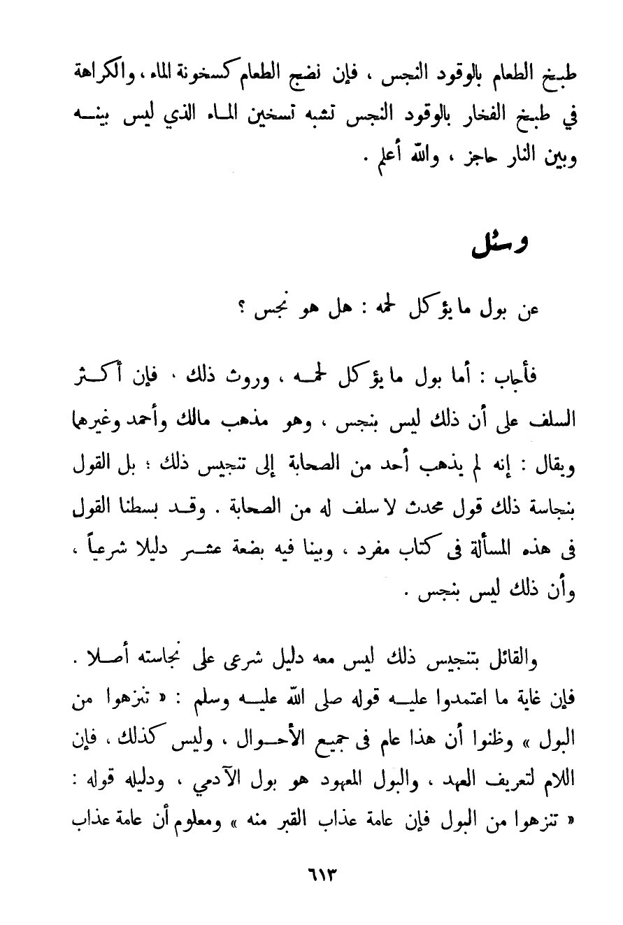 أَمَّا بَوْلُ مَا يُؤْكَلُ لَحْمُهُ وَرَوْثُ ذَلِكَ فَإِنَّ أَكْثَرَ السَّلَفِ عَلَى أَنَّ ذَلِكَ لَيْسَ بِنَجِسِ وَهُوَ مَذْهَبُ مَالِكٍ وَأَحْمَد وَغَيْرِهِمَا وَيُقَالُ: إنَّهُ لَمْ يَذْهَبْ أَحَدٌ مِنْ الصَّحَابَةِ إلَى تَنْجِيسِ ذَلِكَ. بَلْ الْقَوْلُ بِنَجَاسَةِ ذَلِكَ قَوْلٌ مُحْدَثٌ لَا سَلَفَ لَهُ مِنْ الصَّحَابَةِ. وَقَدْ بَسَطْنَا الْقَوْلَ فِي هَذِهِ الْمَسْأَلَةِ فِي كِتَابٍ مُفْرَدٍ وَبَيَّنَّا فِيهِ بِضْعَةَ عَشَرَ دَلِيلًا شَرْعِيًّا وَأَنَّ ذَلِكَ لَيْسَ بِنَجِسِ. وَالْقَائِلُ بِتَنْجِيسِ ذَلِكَ لَيْسَ مَعَهُ دَلِيلٌ شَرْعِيٌّ عَلَى نَجَاسَتِهِ أَصْلًا. فَإِنَّ غَايَةَ مَا اعْتَمَدُوا عَلَيْهِ قَوْلُهُ صَلَّى اللَّهُ عَلَيْهِ وَسَلَّمَ {تَنَزَّهُوا مِنْ الْبَوْلِ} وَظَنُّوا أَنَّ هَذَا عَامٌّ فِي جَمِيعِ الْأَحْوَالِ وَلَيْسَ كَذَلِكَ فَإِنَّ اللَّامَ لِتَعْرِيفِ الْعَهْدِ وَالْبَوْلُ الْمَعْهُودُ هُوَ بَوْلُ الْآدَمِيِّ وَدَلِيلُهُ قَوْلُهُ: {تَنَزَّهُوا مِنْ الْبَوْلِ فَإِنَّ عَامَّةَ عَذَابِ الْقَبْرِ مِنْهُ} وَمَعْلُومٌ أَنَّ عَامَّةَ عَذَابِ