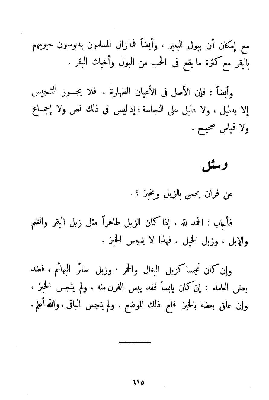 مَعَ إمْكَانِ أَنْ يَبُولَ الْبَعِيرُ وَأَيْضًا فَمَا زَالَ الْمُسْلِمُونَ يَدُوسُونَ حُبُوبَهُمْ بِالْبَقَرِ مَعَ كَثْرَةِ مَا يَقَعُ فِي الْحَبِّ مِنْ الْبَوْلِ وَأَخْبَاثِ الْبَقَرِ. وَأَيْضًا: فَإِنَّ الْأَصْلَ فِي الْأَعْيَانِ الطَّهَارَةُ فَلَا يَجُوزُ التَّنْجِيسُ إلَّا بِدَلِيلِ وَلَا دَلِيلَ عَلَى النَّجَاسَةِ؛ إذْ لَيْسَ فِي ذَلِكَ نَصٌّ وَلَا إجْمَاعٌ وَلَا قِيَاسٌ صَحِيحٌ.