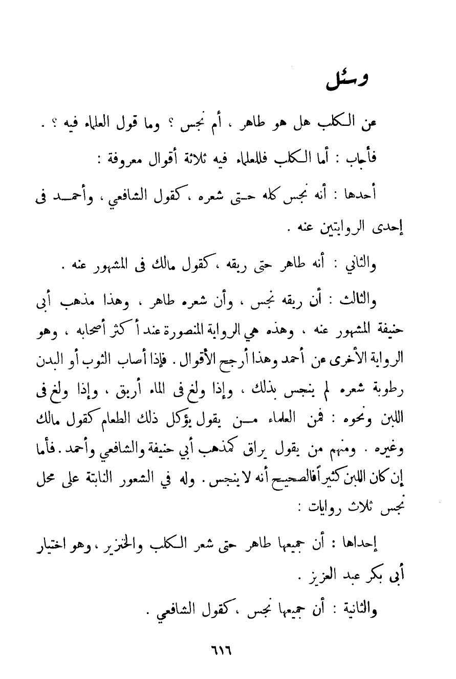 أَمَّا الْكَلْبُ فَلِلْعُلَمَاءِ فِيهِ ثَلَاثَةُ أَقْوَالٍ مَعْرُوفَةٍ: أَحَدُهَا: أَنَّهُ نَجِسٌ كُلُّهُ حَتَّى شَعْرُهُ كَقَوْلِ الشَّافِعِيِّ وَأَحْمَد فِي إحْدَى الرِّوَايَتَيْنِ عَنْهُ. وَالثَّانِي: أَنَّهُ طَاهِرٌ حَتَّى رِيقُهُ كَقَوْلِ مَالِكٍ فِي الْمَشْهُورِ عَنْهُ. وَالثَّالِثُ: أَنَّ رِيقَهُ نَجِسٌ وَأَنَّ شَعْرَهُ طَاهِرٌ وَهَذَا مَذْهَبُ أَبِي حَنِيفَةَ الْمَشْهُورُ عَنْهُ وَهَذِهِ هِيَ الرِّوَايَةُ الْمَنْصُورَةُ عِنْدَ أَكْثَرِ أَصْحَابِهِ وَهُوَ الرِّوَايَةُ الْأُخْرَى عَنْ أَحْمَد وَهَذَا أَرْجَحُ الْأَقْوَالِ. فَإِذَا أَصَابَ الثَّوْبَ أَوْ الْبَدَنَ رُطُوبَةُ شَعْرِهِ لَمْ يَنْجُسْ بِذَلِكَ وَإِذَا وَلَغَ فِي الْمَاءِ أُرِيقَ وَإِذَا وَلَغَ فِي اللَّبَنِ وَنَحْوِهِ: فَمِنْ الْعُلَمَاءِ مَنْ يَقُولُ يُؤْكَلُ ذَلِكَ الطَّعَامُ كَقَوْلِ مَالِكٍ وَغَيْرِهِ. وَمِنْهُمْ مَنْ يَقُولُ يُرَاقُ كَمَذْهَبِ أَبِي حَنِيفَةَ وَالشَّافِعِيِّ وَأَحْمَد. فَأَمَّا إنْ كَانَ اللَّبَنُ كَثِيرًا فَالصَّحِيحُ أَنَّهُ لَا يَنْجُسُ. وَلَهُ فِي الشُّعُورِ النَّابِتَةِ عَلَى مَحَلٍّ نَجِسٍ ثَلَاثُ رِوَايَاتٍ: إحْدَاهَا: أَنَّ جَمِيعَهَا طَاهِرٌ حَتَّى شَعْرُ الْكَلْبِ وَالْخِنْزِيرِ وَهُوَ اخْتِيَارُ أَبِي بَكْرٍ عَبْدُ الْعَزِيزِ. وَالثَّانِيَةُ: أَنَّ جَمِيعَهَا نَجِسٌ كَقَوْلِ الشَّافِعِيِّ.