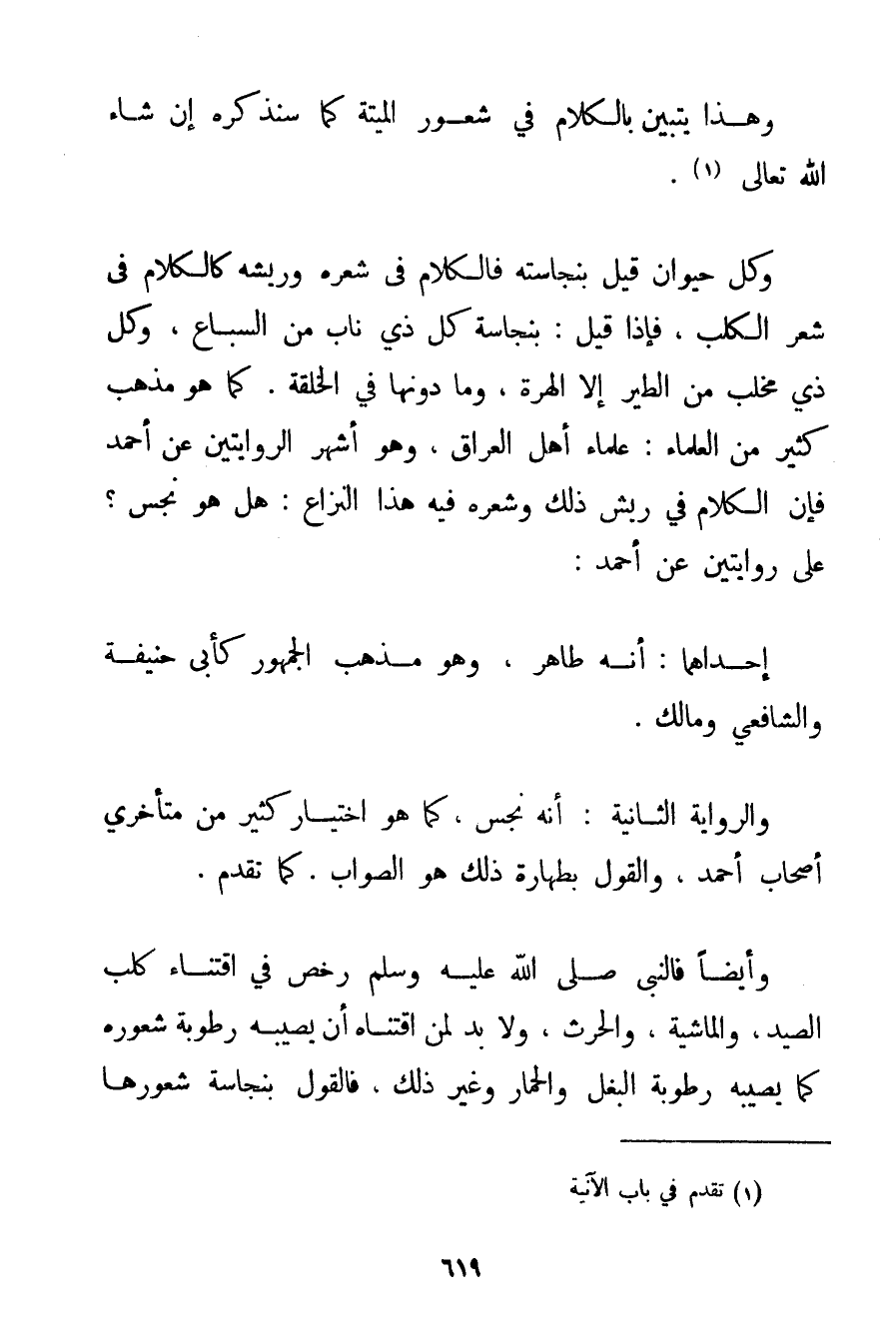 وَهَذَا يَتَبَيَّنُ بِالْكَلَامِ فِي شُعُورِ الْمَيْتَةِ كَمَا سَنَذْكُرُهُ إنْ شَاءَ اللَّهُ تَعَالَى. وَكُلُّ حَيَوَانٍ قِيلَ بِنَجَاسَتِهِ فَالْكَلَامُ فِي شَعْرِهِ وَرِيشِهِ كَالْكَلَامِ فِي شَعْرِ الْكَلْبِ فَإِذَا قِيلَ: بِنَجَاسَةِ كُلِّ ذِي نَابٍ مِنْ السِّبَاعِ وَكُلِّ ذِي مِخْلَبٍ مِنْ الطَّيْرِ إلَّا الْهِرَّةَ وَمَا دُونَهَا فِي الْخِلْقَةِ. كَمَا هُوَ مَذْهَبُ كَثِيرٍ مِنْ الْعُلَمَاءِ: عُلَمَاءِ أَهْلِ الْعِرَاقِ وَهُوَ أَشْهَرُ الرِّوَايَتَيْنِ عَنْ أَحْمَد فَإِنَّ الْكَلَامَ فِي رِيشِ ذَلِكَ وَشَعْرِهِ فِيهِ هَذَا النِّزَاعُ: هَلْ هُوَ نَجِسٌ؟ عَلَى رِوَايَتَيْنِ عَنْ أَحْمَد: إحْدَاهُمَا: أَنَّهُ طَاهِرٌ وَهُوَ مَذْهَبُ الْجُمْهُورِ كَأَبِي حَنِيفَةَ وَالشَّافِعِيِّ وَمَالِكٍ. وَالرِّوَايَةُ الثَّانِيَةُ: أَنَّهُ نَجِسٌ كَمَا هُوَ اخْتِيَارُ كَثِيرٍ مِنْ مُتَأَخِّرِي أَصْحَابِ أَحْمَد وَالْقَوْلُ بِطَهَارَةِ ذَلِكَ هُوَ الصَّوَابُ. كَمَا تَقَدَّمَ. وَأَيْضًا فَالنَّبِيُّ صَلَّى اللَّهُ عَلَيْهِ وَسَلَّمَ رَخَّصَ فِي اقْتِنَاءِ كَلْبِ الصَّيْدِ وَالْمَاشِيَةِ وَالْحَرْثِ وَلَا بُدَّ لِمَنْ اقْتَنَاهُ أَنْ يُصِيبَهُ رُطُوبَةُ شُعُورِهِ كَمَا يُصِيبُهُ رُطُوبَةُ الْبَغْلِ وَالْحِمَارِ وَغَيْرِ ذَلِكَ فَالْقَوْلُ بِنَجَاسَةِ شُعُورِهَا