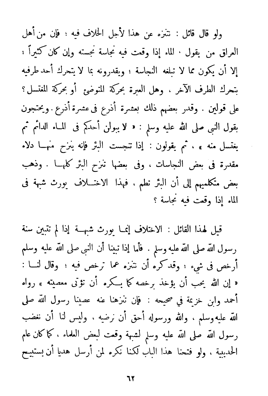 وَلَوْ قَالَ قَائِلٌ: نَتَنَزَّهُ عَنْ هَذَا لِأَجْلِ الْخِلَافِ فِيهِ؛ فَإِنَّ مِنْ أَهْلِ الْعِرَاقِ مَنْ يَقُولُ الْمَاءُ إذَا وَقَعَتْ فِيهِ نَجَاسَةٌ نَجَّسَتْهُ وَإِنْ كَانَ كَثِيرًا؛ إلَّا أَنْ يَكُونَ مِمَّا لَا تَبْلُغُهُ النَّجَاسَةُ؛ وَيُقَدِّرُونَهُ بِمَا لَا يَتَحَرَّكُ أَحَدُ طَرَفَيْهِ بِتَحَرُّكِ الطَّرَفِ الْآخَرِ وَهَلْ الْعِبْرَةُ بِحَرَكَةِ الْمُتَوَضِّئِ أَوْ بِحَرَكَةِ الْمُغْتَسِلِ؟ عَلَى قَوْلَيْنِ. وَقَدَّرَ بَعْضُهُمْ ذَلِكَ بِعَشَرَةِ أَذْرُعٍ فِي عَشَرَةِ أَذْرُعٍ. وَيَحْتَجُّونَ بِقَوْلِ النَّبِيِّ صَلَّى اللَّهُ عَلَيْهِ وَسَلَّمَ {لَا يَبُولَنَّ أَحَدُكُمْ فِي الْمَاءِ الدَّائِمِ ثُمَّ يَغْتَسِلُ مِنْهُ} ثُمَّ يَقُولُونَ: إذَا تَنَجَّسَتْ الْبِئْرُ فَإِنَّهُ يُنْزَحُ مِنْهَا دِلَاءٌ مُقَدَّرَةٌ فِي بَعْضِ النَّجَاسَاتِ وَفِي بَعْضِهَا تُنْزَحُ الْبِئْرُ كُلُّهَا. وَذَهَبَ بَعْضُ مُتَكَلِّمِيهِمْ إلَى أَنَّ الْبِئْرَ تُطَمُّ فَهَذَا الِاخْتِلَافُ يُورِثُ شُبْهَةً فِي الْمَاءِ إذَا وَقَعَتْ فِيهِ نَجَاسَةٌ؟ قِيلَ لِهَذَا الْقَائِلِ: الِاخْتِلَافُ إنَّمَا يُورِثُ شُبْهَةً إذَا لَمْ تَتَبَيَّنْ سُنَّةُ رَسُولِ اللَّهِ صَلَّى اللَّهُ عَلَيْهِ وَسَلَّمَ. فَأَمَّا إذَا تَبَيَّنَّا أَنَّ النَّبِيَّ صَلَّى اللَّهُ عَلَيْهِ وَسَلَّمَ أَرْخَصَ فِي شَيْءٍ؛ وَقَدْ كَرِهَ أَنْ نَتَنَزَّهَ عَمَّا تَرَخَّصَ فِيهِ؛ وَقَالَ لَنَا: {إنَّ اللَّهَ يُحِبُّ أَنْ يُؤْخَذَ بِرُخَصِهِ كَمَا يَكْرَهُ أَنْ تُؤْتَى مَعْصِيَتُهُ} رَوَاهُ أَحْمَد وَابْنُ خُزَيْمَة فِي صَحِيحِهِ: فَإِنْ تَنَزَّهْنَا عَنْهُ عَصَيْنَا رَسُولَ اللَّهِ صَلَّى اللَّهُ عَلَيْهِ وَسَلَّمَ وَاَللَّهُ وَرَسُولُهُ أَحَقُّ أَنْ نُرْضِيَهُ وَلَيْسَ لَنَا أَنْ نُغْضِبَ رَسُولَ اللَّهِ صَلَّى اللَّهُ عَلَيْهِ وَسَلَّمَ لِشُبْهَةِ وَقَعَتْ لِبَعْضِ الْعُلَمَاءِ كَمَا كَانَ عَامَ الْحُدَيْبِيَةِ وَلَوْ فَتَحْنَا هَذَا الْبَابَ لَكُنَّا نَكْرَهُ لِمَنْ أَرْسَلَ هَدْيًا أَنْ يَسْتَبِيحَ