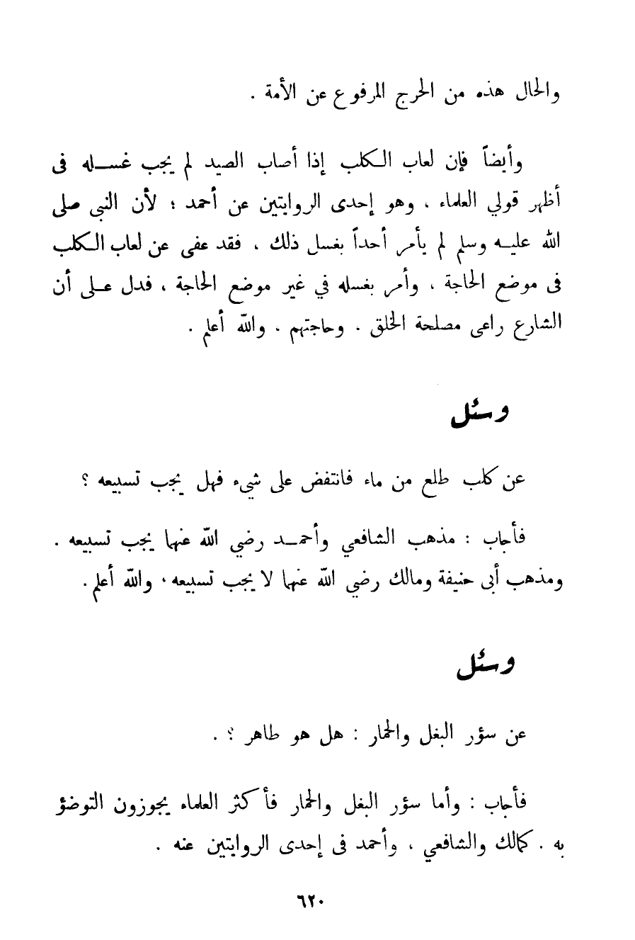 وَالْحَالُ هَذِهِ مِنْ الْحَرَجِ الْمَرْفُوعِ عَنْ الْأُمَّةِ. وَأَيْضًا فَإِنَّ لُعَابَ الْكَلْبِ إذَا أَصَابَ الصَّيْدَ لَمْ يَجِبْ غَسْلُهُ فِي أَظْهَرِ قَوْلَيْ الْعُلَمَاءِ وَهُوَ إحْدَى الرِّوَايَتَيْنِ عَنْ أَحْمَد؛ لِأَنَّ النَّبِيَّ صَلَّى اللَّهُ عَلَيْهِ وَسَلَّمَ لَمْ يَأْمُرْ أَحَدًا بِغَسْلِ ذَلِكَ فَقَدْ عفى عَنْ لُعَابِ الْكَلْبِ فِي مَوْضِعِ الْحَاجَةِ وَأَمَرَ بِغَسْلِهِ فِي غَيْرِ مَوْضِعِ الْحَاجَةِ فَدَلَّ عَلَى أَنَّ الشَّارِعَ رَاعَى مَصْلَحَةَ الْخَلْقِ وَحَاجَتَهُمْ وَاَللَّهُ أَعْلَمُ.