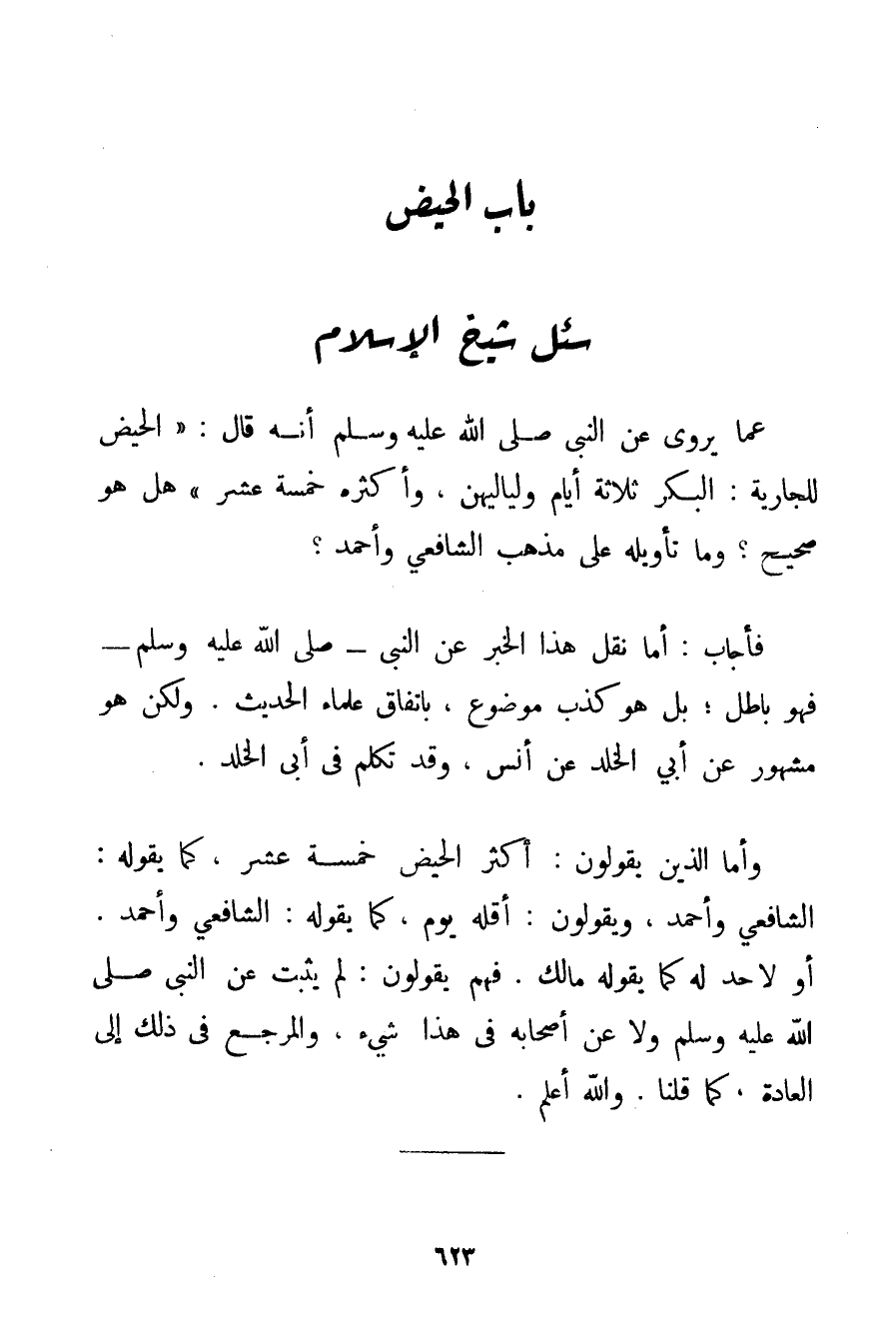 أَمَّا نَقْلُ هَذَا الْخَبَرِ عَنْ النَّبِيِّ - صَلَّى اللَّهُ عَلَيْهِ وَسَلَّمَ - فَهُوَ بَاطِلٌ؛ بَلْ هُوَ كَذِبٌ مَوْضُوعٌ بِاتِّفَاقِ عُلَمَاءِ الْحَدِيثِ. وَلَكِنْ هُوَ مَشْهُورٌ عَنْ أَبِي الْخُلْدِ عَنْ أَنَسٍ وَقَدْ تُكُلِّمَ فِي أَبِي الْخُلْدِ. وَأَمَّا الَّذِينَ يَقُولُونَ: أَكْثَرُ الْحَيْضِ خَمْسَةَ عَشَرَ كَمَا يَقُولُهُ: الشَّافِعِيُّ وَأَحْمَد وَيَقُولُونَ: أَقَلُّهُ يَوْمٌ كَمَا يَقُولُهُ: الشَّافِعِيُّ وَأَحْمَد. أَوْ لَا حَدَّ لَهُ كَمَا يَقُولُهُ مَالِكٌ. فَهُمْ يَقُولُونَ: لَمْ يَثْبُتْ عَنْ النَّبِيِّ صَلَّى اللَّهُ عَلَيْهِ وَسَلَّمَ وَلَا عَنْ أَصْحَابِهِ فِي هَذَا شَيْءٌ وَالْمَرْجِعُ فِي ذَلِكَ إلَى الْعَادَةِ كَمَا قُلْنَا. وَاَللَّهُ أَعْلَمُ.