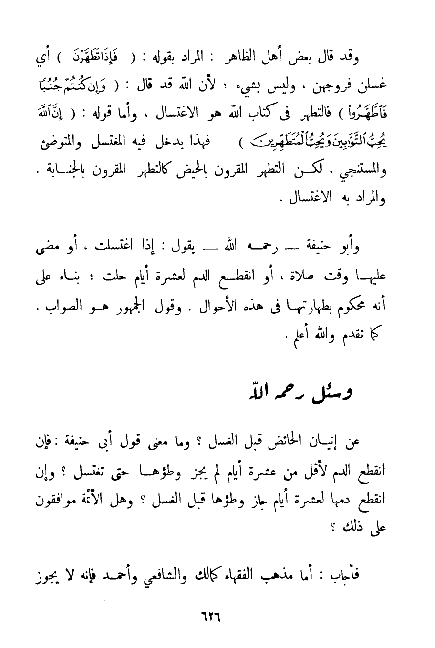 وَقَدْ قَالَ بَعْضُ أَهْلِ الظَّاهِرِ: الْمُرَادُ بِقَوْلِهِ: {فَإِذَا تَطَهَّرْنَ} أَيْ غَسَلْنَ فُرُوجَهُنَّ وَلَيْسَ بِشَيْءِ؛ لِأَنَّ اللَّهَ قَدْ قَالَ: {وَإِنْ كُنْتُمْ جُنُبًا فَاطَّهَّرُوا} فَالتَّطَهُّرُ فِي كِتَابِ اللَّهِ هُوَ الِاغْتِسَالُ وَأَمَّا قَوْلُهُ: {إنَّ اللَّهَ يُحِبُّ التَّوَّابِينَ وَيُحِبُّ الْمُتَطَهِّرِينَ} فَهَذَا يَدْخُلُ فِيهِ الْمُغْتَسِلُ وَالْمُتَوَضِّئُ وَالْمُسْتَنْجِي لَكِنَّ التَّطَهُّرَ الْمَقْرُونَ بِالْحَيْضِ كَالتَّطَهُّرِ الْمَقْرُونِ بِالْجَنَابَةِ. وَالْمُرَادُ بِهِ الِاغْتِسَالُ. وَأَبُو حَنِيفَةَ - رَحِمَهُ اللَّهُ - يَقُولُ: إذَا اغْتَسَلَتْ أَوْ مَضَى عَلَيْهَا وَقْتُ صَلَاةٍ أَوْ انْقَطَعَ الدَّمُ لِعَشَرَةِ أَيَّامٍ حَلَّتْ؛ بِنَاءً عَلَى أَنَّهُ مَحْكُومٌ بِطَهَارَتِهَا فِي هَذِهِ الْأَحْوَالِ. وَقَوْلُ الْجُمْهُورِ هُوَ الصَّوَابُ. كَمَا تَقَدَّمَ وَاَللَّهُ أَعْلَمُ.