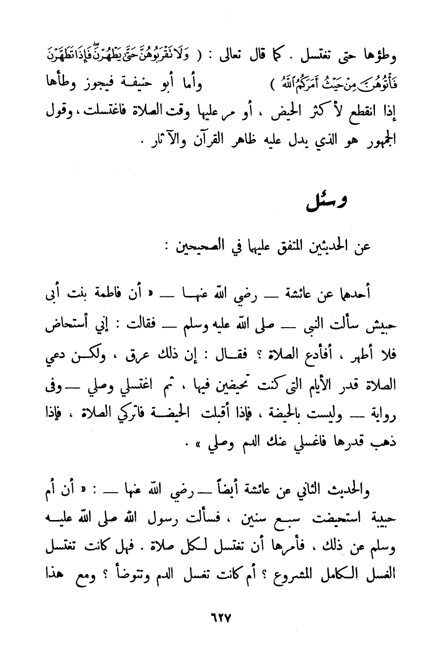 أَحَدُهُمَا عَنْ عَائِشَةَ - رَضِيَ اللَّهُ عَنْهَا - {أَنَّ فَاطِمَةَ بِنْتَ أَبِي حبيش سَأَلَتْ النَّبِيَّ - صَلَّى اللَّهُ عَلَيْهِ وَسَلَّمَ - فَقَالَتْ: إنِّي أُسْتَحَاضُ فَلَا أَطْهُرُ أَفَأَدَعُ الصَّلَاةَ؟ فَقَالَ: إنَّ ذَلِكَ عِرْقٌ وَلَكِنْ دَعِي الصَّلَاةَ قَدْرَ الْأَيَّامِ الَّتِي كُنْت تَحِيضِينَ فِيهَا ثُمَّ اغْتَسِلِي وَصَلِّي} - وَفِي رِوَايَةٍ - {وَلَيْسَتْ بِالْحَيْضَةِ فَإِذَا أَقْبَلَتْ الْحَيْضَةُ فَاتْرُكِي الصَّلَاةَ فَإِذَا ذَهَبَ قَدْرُهَا فَاغْسِلِي عَنْك الدَّمَ وَصَلِّي} . وَالْحَدِيثُ الثَّانِي عَنْ عَائِشَةَ أَيْضًا - رَضِيَ اللَّهُ عَنْهَا -: {أَنَّ أُمَّ حَبِيبَةَ اُسْتُحِيضَتْ سَبْعَ سِنِينَ فَسَأَلَتْ رَسُولَ اللَّهِ صَلَّى اللَّهُ عَلَيْهِ وَسَلَّمَ عَنْ ذَلِكَ فَأَمَرَهَا أَنْ تَغْتَسِلَ لِكُلِّ صَلَاةٍ} . فَهَلْ كَانَتْ تَغْتَسِلُ الْغُسْلَ الْكَامِلَ الْمَشْرُوعَ؟ أَمْ كَانَتْ تَغْسِلُ الدَّمَ وَتَتَوَضَّأُ؟ وَمَعَ هَذَا