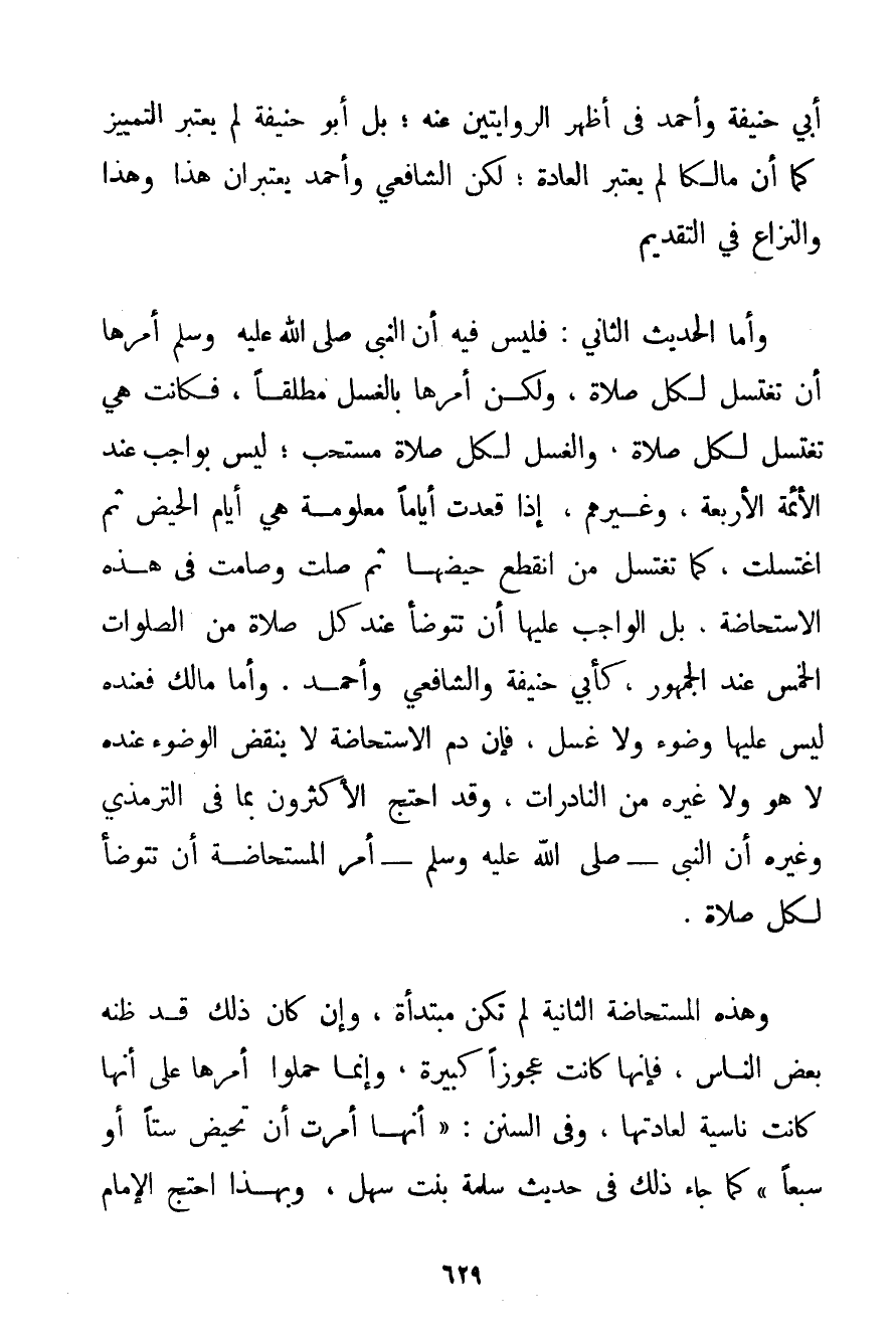 أَبِي حَنِيفَةَ وَأَحْمَد فِي أَظْهَرِ الرِّوَايَتَيْنِ عَنْهُ؛ بَلْ أَبُو حَنِيفَةَ لَمْ يَعْتَبِرْ التَّمْيِيزَ كَمَا أَنَّ مَالِكًا لَمْ يَعْتَبِرْ الْعَادَةَ. لَكِنَّ الشَّافِعِيَّ وَأَحْمَد يَعْتَبِرَانِ هَذَا وَهَذَا وَالنِّزَاعُ فِي التَّقْدِيمِ. وَأَمَّا الْحَدِيثُ الثَّانِي: فَلَيْسَ فِيهِ أَنَّ النَّبِيَّ صَلَّى اللَّهُ عَلَيْهِ وَسَلَّمَ أَمَرَهَا أَنْ تَغْتَسِلَ لِكُلِّ صَلَاةٍ وَلَكِنْ أَمَرَهَا بِالْغُسْلِ مُطْلَقًا فَكَانَتْ هِيَ تَغْتَسِلُ لِكُلِّ صَلَاةٍ وَالْغُسْلُ لِكُلِّ صَلَاةٍ مُسْتَحَبٌّ؛ لَيْسَ بِوَاجِبِ عِنْدَ الْأَئِمَّةِ الْأَرْبَعَةِ وَغَيْرِهِمْ إذَا قَعَدَتْ أَيَّامًا مَعْلُومَةً هِيَ أَيَّامُ الْحَيْضِ ثُمَّ اغْتَسَلَتْ كَمَا تَغْتَسِلُ مَنْ انْقَطَعَ حَيْضُهَا ثُمَّ صَلَّتْ وَصَامَتْ فِي هَذِهِ الِاسْتِحَاضَةِ بَلْ الْوَاجِبُ عَلَيْهَا أَنْ تَتَوَضَّأَ عِنْدَ كُلِّ صَلَاةٍ مِنْ الصَّلَوَاتِ الْخَمْسِ عِنْدَ الْجُمْهُورِ كَأَبِي حَنِيفَةَ وَالشَّافِعِيِّ وَأَحْمَد. وَأَمَّا مَالِكٌ فَعِنْدَهُ لَيْسَ عَلَيْهَا وُضُوءٌ وَلَا غُسْلٌ فَإِنَّ دَمَ الِاسْتِحَاضَةِ لَا يَنْقُضُ الْوُضُوءَ عِنْدَهُ لَا هُوَ وَلَا غَيْرُهُ مِنْ النَّادِرَاتِ وَقَدْ احْتَجَّ الْأَكْثَرُونَ بِمَا فِي التِّرْمِذِيِّ وَغَيْرِهِ {أَنَّ النَّبِيَّ - صَلَّى اللَّهُ عَلَيْهِ وَسَلَّمَ - أَمَرَ الْمُسْتَحَاضَةَ أَنْ تَتَوَضَّأَ لِكُلِّ صَلَاةٍ} . وَهَذِهِ الْمُسْتَحَاضَةُ الثَّانِيَةُ لَمْ تَكُنْ مُبْتَدَأَةً وَإِنْ كَانَ ذَلِكَ قَدْ ظَنَّهُ بَعْضُ النَّاسِ فَإِنَّهَا كَانَتْ عَجُوزًا كَبِيرَةً وَإِنَّمَا حَمَلُوا أَمْرَهَا عَلَى أَنَّهَا كَانَتْ نَاسِيَةً لِعَادَتِهَا وَفِي السُّنَنِ: {أَنَّهَا أُمِرَتْ أَنْ تَحِيضَ سِتًّا أَوْ سَبْعًا} كَمَا جَاءَ ذَلِكَ فِي حَدِيثِ سَلَمَةَ بِنْتِ سَهْلٍ وَبِهَذَا احْتَجَّ الْإِمَامُ