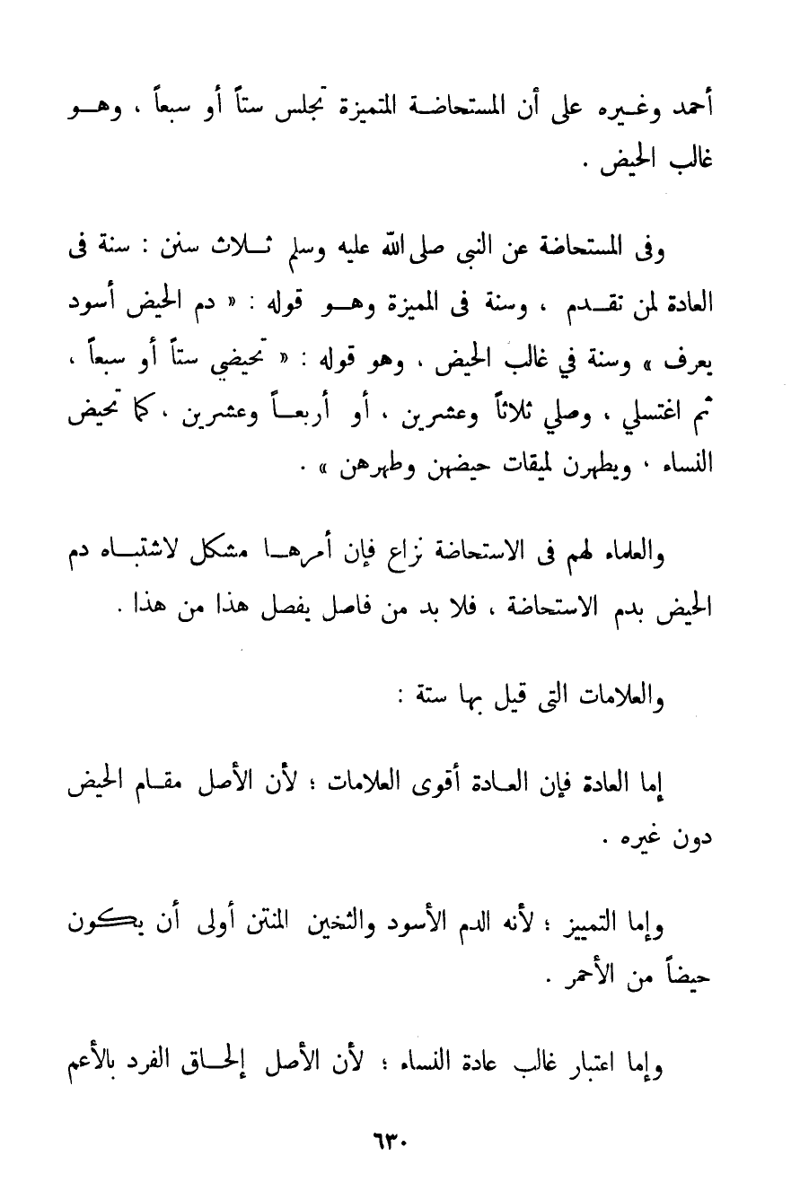 أَحْمَد وَغَيْرُهُ عَلَى أَنَّ الْمُسْتَحَاضَةَ الْمُتَمَيِّزَةَ تَجْلِسُ سِتًّا أَوْ سَبْعًا وَهُوَ غَالِبُ الْحَيْضِ. وَفِي الْمُسْتَحَاضَةِ عَنْ النَّبِيِّ صَلَّى اللَّهُ عَلَيْهِ وَسَلَّمَ ثَلَاثُ سُنَنٍ: سُنَّةٌ فِي الْعَادَةِ كَمَا تَقَدَّمَ وَسُنَّةٌ فِي الْمُمَيِّزَةِ وَهُوَ قَوْلُهُ: {دَمُ الْحَيْضِ أَسْوَدُ يُعْرَفُ} وَسُنَّةٌ فِي غَالِبِ الْحَيْضِ وَهُوَ قَوْلُهُ: {تَحَيَّضِي سِتًّا أَوْ سَبْعًا ثُمَّ اغْتَسِلِي وَصَلِّي ثَلَاثًا وَعِشْرِينَ أَوْ أَرْبَعًا وَعِشْرِينَ كَمَا تَحِيضُ النِّسَاءُ وَيَطْهُرْنَ لِمِيقَاتِ حَيْضِهِنَّ وَطُهْرِهِنَّ} . وَالْعُلَمَاءُ لَهُمْ فِي الِاسْتِحَاضَةِ نِزَاعٌ فَإِنَّ أَمْرَهَا مُشْكِلٌ لِاشْتِبَاهِ دَمِ الْحَيْضِ بِدَمِ الِاسْتِحَاضَةِ فَلَا بُدَّ مِنْ فَاصِلٍ يَفْصِلُ هَذَا مِنْ هَذَا. وَالْعَلَامَاتُ الَّتِي قِيلَ بِهَا سِتَّةٌ: إمَّا الْعَادَةُ فَإِنَّ الْعَادَةَ أَقْوَى الْعَلَامَاتِ؛ لِأَنَّ الْأَصْلَ مُقَامُ الْحَيْضِ دُونَ غَيْرِهِ. وَإِمَّا التَّمْيِيزُ؛ لِأَنَّهُ الدَّمُ الْأَسْوَدُ وَالثَّخِينُ الْمُنْتِنُ أَوْلَى أَنْ يَكُونَ حَيْضًا مِنْ الْأَحْمَرِ. وَإِمَّا اعْتِبَارُ غَالِبِ عَادَةِ النِّسَاءِ؛ لِأَنَّ الْأَصْلَ إلْحَاقُ الْفَرْدِ بِالْأَعَمِّ