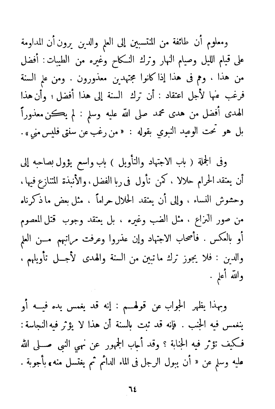 وَمَعْلُومٌ أَنَّ طَائِفَةً مِنْ الْمُنْتَسِبِينَ إلَى الْعِلْمِ وَالدِّينِ يَرَوْنَ أَنَّ الْمُدَاوَمَةَ عَلَى قِيَامِ اللَّيْلِ وَصِيَامِ النَّهَارِ وَتَرْكِ النِّكَاحِ وَغَيْرِهِ مِنْ الطَّيِّبَاتِ: أَفْضَلُ مِنْ هَذَا وَهُمْ فِي هَذَا إذَا كَانُوا مُجْتَهِدِينَ مَعْذُورُونَ. وَمَنْ عَلِمَ السُّنَّةَ فَرَغِبَ عَنْهَا لِأَجْلِ اعْتِقَادِ: أَنَّ تَرْكَ السُّنَّةِ إلَى هَذَا أَفْضَلُ؛ وَأَنَّ هَذَا الْهَدْيَ أَفْضَلُ مِنْ هَدْيِ مُحَمَّدٍ صَلَّى اللَّهُ عَلَيْهِ وَسَلَّمَ: لَمْ يَكُنْ مَعْذُورًا بَلْ هُوَ تَحْتَ الْوَعِيدِ النَّبَوِيِّ بِقَوْلِهِ: {مَنْ رَغِبَ عَنْ سُنَّتِي فَلَيْسَ مِنِّي} . وَفِي الْجُمْلَةِ (بَابٌ الِاجْتِهَادُ وَالتَّأْوِيلُ بَابٌ وَاسِعٌ يَئُولُ بِصَاحِبِهِ إلَى أَنْ يَعْتَقِدَ الْحَرَامَ حَلَالًا كَمَنْ تَأَوَّلَ فِي رِبَا الْفَضْلِ وَالْأَنْبِذَةِ الْمُتَنَازَعِ فِيهَا وَحُشُوشِ النِّسَاءِ وَإِلَى أَنْ يَعْتَقِدَ الْحَلَالَ حَرَامًا مِثْلُ بَعْضِ مَا ذَكَرْنَاهُ مِنْ صُوَرِ النِّزَاعِ مِثْلُ الضَّبِّ وَغَيْرِهِ بَلْ يَعْتَقِدُ وُجُوبَ قَتْلِ الْمَعْصُومِ أَوْ بِالْعَكْسِ. فَأَصْحَابُ الِاجْتِهَادِ وَإِنْ عُذِرُوا وَعُرِفَتْ مَرَاتِبُهُمْ مِنْ الْعِلْمِ وَالدِّينِ: فَلَا يَجُوزُ تَرْكُ مَا تَبَيَّنَ مِنْ السُّنَّةِ وَالْهَدْيِ لِأَجْلِ تَأْوِيلِهِمْ وَاَللَّهُ أَعْلَمُ. وَبِهَذَا يَظْهَرُ الْجَوَابُ عَنْ قَوْلِهِمْ: إنَّهُ قَدْ يَغْمِسُ يَدَهُ فِيهِ أَوْ يَنْغَمِسُ فِيهِ الْجُنُبُ. فَإِنَّهُ قَدْ ثَبَتَ بِالسُّنَّةِ أَنَّ هَذَا لَا يُؤَثِّرُ فِيهِ النَّجَاسَةُ: فَكَيْفَ تُؤَثِّرُ فِيهِ الْجَنَابَةُ؟ وَقَدْ أَجَابَ الْجُمْهُورُ عَنْ {نَهْيِ النَّبِيِّ صَلَّى اللَّهُ عَلَيْهِ وَسَلَّمَ عَنْ أَنْ يَبُولَ الرَّجُلُ فِي الْمَاءِ الدَّائِمِ ثُمَّ يَغْتَسِلُ مِنْهُ} بِأَجْوِبَةِ.