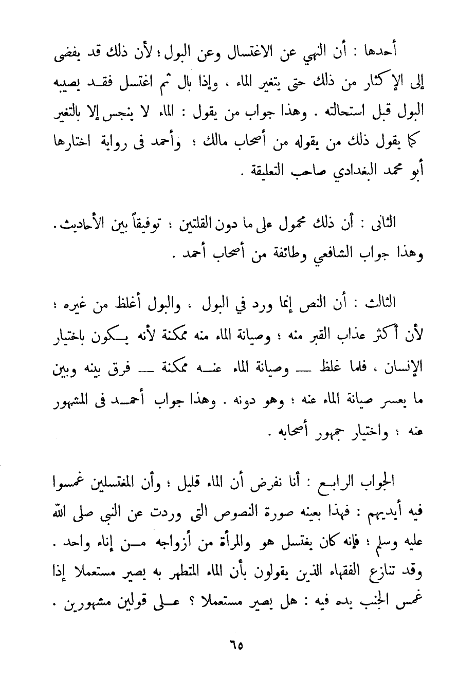 أَحَدُهَا: أَنَّ النَّهْيَ عَنْ الِاغْتِسَالِ وَعَنْ الْبَوْلِ؛ لِأَنَّ ذَلِكَ قَدْ يُفْضِي إلَى الْإِكْثَارِ مِنْ ذَلِكَ حَتَّى يَتَغَيَّرَ الْمَاءُ وَإِذَا بَالَ ثُمَّ اغْتَسَلَ فَقَدْ يُصِيبُهُ الْبَوْلُ قَبْلَ اسْتِحَالَتِهِ. وَهَذَا جَوَابُ مَنْ يَقُولُ: الْمَاءُ لَا يَنْجُسُ إلَّا بِالتَّغَيُّرِ كَمَا يَقُولُ ذَلِكَ مَنْ يَقُولُهُ مِنْ أَصْحَابِ مَالِكٍ؛ وَأَحْمَد فِي رِوَايَةٍ اخْتَارَهَا أَبُو مُحَمَّدٍ الْبَغْدَادِيُّ صَاحِبُ التَّعْلِيقَةِ. الثَّانِي: أَنَّ ذَلِكَ مَحْمُولٌ عَلَى مَا دُونَ الْقُلَّتَيْنِ؛ تَوْفِيقًا بَيْنَ الْأَحَادِيثِ. وَهَذَا جَوَابُ الشَّافِعِيِّ وَطَائِفَةٍ مِنْ أَصْحَابِ أَحْمَد. الثَّالِثُ: أَنَّ النَّصَّ إنَّمَا وَرَدَ فِي الْبَوْلِ وَالْبَوْلُ أَغْلَظُ مِنْ غَيْرِهِ؛ لِأَنَّ أَكْثَرَ عَذَابِ الْقَبْرِ مِنْهُ؛ وَصِيَانَةُ الْمَاءِ مِنْهُ مُمْكِنَةٌ لِأَنَّهُ يَكُونُ بِاخْتِيَارِ الْإِنْسَانِ فَلَمَّا غَلُظَ - وَصِيَانَةُ الْمَاءِ عَنْهُ مُمْكِنَةٌ - فُرِّقَ بَيْنَهُ وَبَيْنَ مَا يَعْسُرُ صِيَانَةُ الْمَاءِ عَنْهُ؛ وَهُوَ دُونُهُ. وَهَذَا جَوَابُ أَحْمَد فِي الْمَشْهُورِ عَنْهُ؛ وَاخْتِيَارُ جُمْهُورِ أَصْحَابِهِ. الْجَوَابُ الرَّابِعُ: أَنَّا نَفْرِضُ أَنَّ الْمَاءَ قَلِيلٌ؛ وَأَنَّ الْمُغْتَسِلِينَ غَمَسُوا فِيهِ أَيْدِيَهُمْ: فَهَذَا بِعَيْنِهِ صُورَةُ النُّصُوصِ الَّتِي وَرَدَتْ عَنْ النَّبِيِّ صَلَّى اللَّهُ عَلَيْهِ وَسَلَّمَ فَإِنَّهُ كَانَ يَغْتَسِلُ هُوَ وَالْمَرْأَةُ مِنْ أَزْوَاجِهِ مِنْ إنَاءٍ وَاحِدٍ.