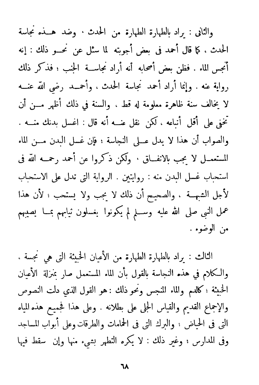 وَالثَّانِي: يُرَادُ بِالطَّهَارَةِ الطَّهَارَةُ مِنْ الْحَدَثِ وَضِدُّ هَذِهِ نَجَاسَةُ الْحَدَثِ كَمَا قَالَ أَحْمَد فِي بَعْضِ أَجْوِبَتِهِ لَمَّا سُئِلَ عَنْ نَحْوِ ذَلِكَ: إنَّهُ أَنْجَسُ الْمَاءِ. فَظَنَّ بَعْضُ أَصْحَابِهِ أَنَّهُ أَرَادَ نَجَاسَةَ الْجُنُبِ؛ فَذَكَرَ ذَلِكَ رِوَايَةً عَنْهُ. وَإِنَّمَا أَرَادَ أَحْمَد نَجَاسَةَ الْحَدَثِ وَأَحْمَد رَضِيَ اللَّهُ عَنْهُ لَا يُخَالِفُ سُنَّةً ظَاهِرَةً مَعْلُومَةً لَهُ قَطُّ وَالسُّنَّةُ فِي ذَلِكَ أَظْهَرُ مِنْ أَنْ تَخْفَى عَلَى أَقَلِّ أَتْبَاعِهِ لَكِنْ نُقِلَ عَنْهُ أَنَّهُ قَالَ: اغْسِلْ بَدَنَك مِنْهُ. وَالصَّوَابُ أَنَّ هَذَا لَا يَدُلُّ عَلَى النَّجَاسَةِ؛ فَإِنَّ غَسْلَ الْبَدَنِ مِنْ الْمَاءِ الْمُسْتَعْمَلِ لَا يَجِبُ بِالِاتِّفَاقِ وَلَكِنْ ذَكَرُوا عَنْ أَحْمَد رَحِمَهُ اللَّهُ فِي اسْتِحْبَابِ غَسْلِ الْبَدَنِ مِنْهُ: رِوَايَتَيْنِ. الرِّوَايَةُ الَّتِي تَدُلُّ عَلَى الِاسْتِحْبَابِ لِأَجْلِ الشُّبْهَةِ وَالصَّحِيحُ أَنَّ ذَلِكَ لَا يَجِبُ وَلَا يُسْتَحَبُّ؛ لِأَنَّ هَذَا عَمَلُ النَّبِيِّ صَلَّى اللَّهُ عَلَيْهِ وَسَلَّمَ لَمْ يَكُونُوا يَغْسِلُونَ ثِيَابَهُمْ بِمَا يُصِيبُهُمْ مِنْ الْوُضُوءِ. الثَّالِثُ: يُرَادُ بِالطَّهَارَةِ الطَّهَارَةُ مِنْ الْأَعْيَانِ الْخَبِيثَةِ الَّتِي هِيَ نَجِسَةٌ وَالْكَلَامُ فِي هَذِهِ النَّجَاسَةِ بِالْقَوْلِ بِأَنَّ الْمَاءَ الْمُسْتَعْمَلَ صَارَ بِمَنْزِلَةِ الْأَعْيَانِ الْخَبِيثَةِ؛ كَالدَّمِ وَالْمَاءِ الْمُنَجَّسِ وَنَحْوِ ذَلِكَ: هُوَ الْقَوْلُ الَّذِي دَلَّتْ النُّصُوصُ وَالْإِجْمَاعُ الْقَدِيمُ وَالْقِيَاسُ الْجَلِيُّ عَلَى بُطْلَانِهِ. وَعَلَى هَذَا فَجَمِيعُ هَذِهِ الْمِيَاهِ الَّتِي فِي الْحِيَاضِ؛ وَالْبِرَكِ الَّتِي فِي الْحَمَّامَاتِ وَالطُّرُقَاتِ وَعَلَى أَبْوَابِ الْمَسَاجِدِ وَفِي الْمَدَارِسِ؛ وَغَيْرِ ذَلِكَ: لَا يُكْرَهُ التَّطَهُّرُ بِشَيْءِ مِنْهَا وَإِنْ سَقَطَ فِيهَا