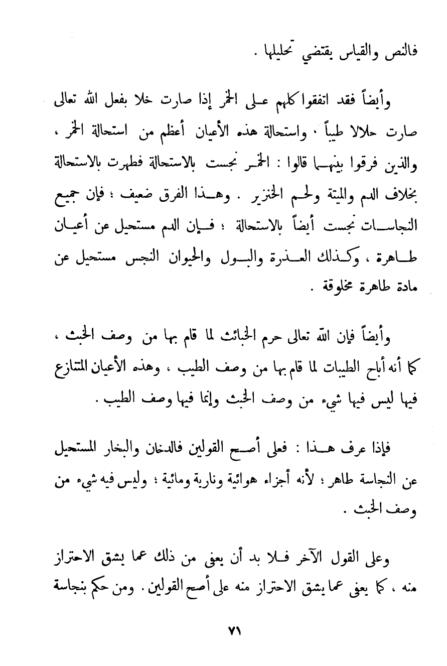 وَأَيْضًا فَقَدْ اتَّفَقُوا كُلُّهُمْ عَلَى الْخَمْرِ إذَا صَارَتْ خَلًّا بِفِعْلِ اللَّهِ تَعَالَى صَارَتْ حَلَالًا طَيِّبًا وَاسْتِحَالَةُ هَذِهِ الْأَعْيَانِ أَعْظَمُ مِنْ اسْتِحَالَةِ الْخَمْرِ وَاَلَّذِينَ فَرَّقُوا بَيْنَهُمَا قَالُوا: الْخَمْرُ نُجِّسَتْ بِالِاسْتِحَالَةِ فَطَهُرَتْ بِالِاسْتِحَالَةِ بِخِلَافِ الدَّمِ وَالْمَيْتَةِ وَلَحْمِ الْخِنْزِيرِ. وَهَذَا الْفَرْقُ ضَعِيفٌ؛ فَإِنَّ جَمِيعَ النَّجَاسَاتِ نُجِّسَتْ أَيْضًا بِالِاسْتِحَالَةِ. فَإِنَّ الدَّمَ مُسْتَحِيلٌ عَنْ أَعْيَانٍ طَاهِرَةٍ وَكَذَلِكَ الْعَذِرَةُ وَالْبَوْلُ وَالْحَيَوَانُ النَّجِسُ مُسْتَحِيلٌ عَنْ مَادَّةٍ طَاهِرَةٍ مَخْلُوقَةٍ. وَأَيْضًا فَإِنَّ اللَّهَ تَعَالَى حَرَّمَ الْخَبَائِثَ لِمَا قَامَ بِهَا مِنْ وَصْفِ الْخَبَثِ كَمَا أَنَّهُ أَبَاحَ الطَّيِّبَاتِ لِمَا قَامَ بِهَا مِنْ وَصْفِ الطِّيبِ وَهَذِهِ الْأَعْيَانُ الْمُتَنَازَعُ فِيهَا لَيْسَ فِيهَا شَيْءٌ مِنْ وَصْفِ الْخَبَثِ وَإِنَّمَا فِيهَا وَصْفُ الطِّيبِ. فَإِذَا عُرِفَ هَذَا: فَعَلَى أَصَحِّ الْقَوْلَيْنِ فَالدُّخَانُ وَالْبُخَارُ الْمُسْتَحِيلُ عَنْ النَّجَاسَةِ طَاهِرٌ؛ لِأَنَّهُ أَجْزَاءٌ هَوَائِيَّةٌ وَنَارِيَّةٌ وَمَائِيَّةٌ؛ وَلَيْسَ فِيهِ شَيْءٌ مِنْ وَصْفِ الْخَبَثِ. وَعَلَى الْقَوْلِ الْآخَرِ فَلَا بُدَّ أَنْ يُعْفَى مِنْ ذَلِكَ عَمَّا يَشُقُّ الِاحْتِرَازُ مِنْهُ كَمَا يُعْفَى عَمَّا يَشُقُّ الِاحْتِرَازُ مِنْهُ عَلَى أَصَحِّ الْقَوْلَيْنِ. وَمَنْ حَكَمَ بِنَجَاسَةِ
