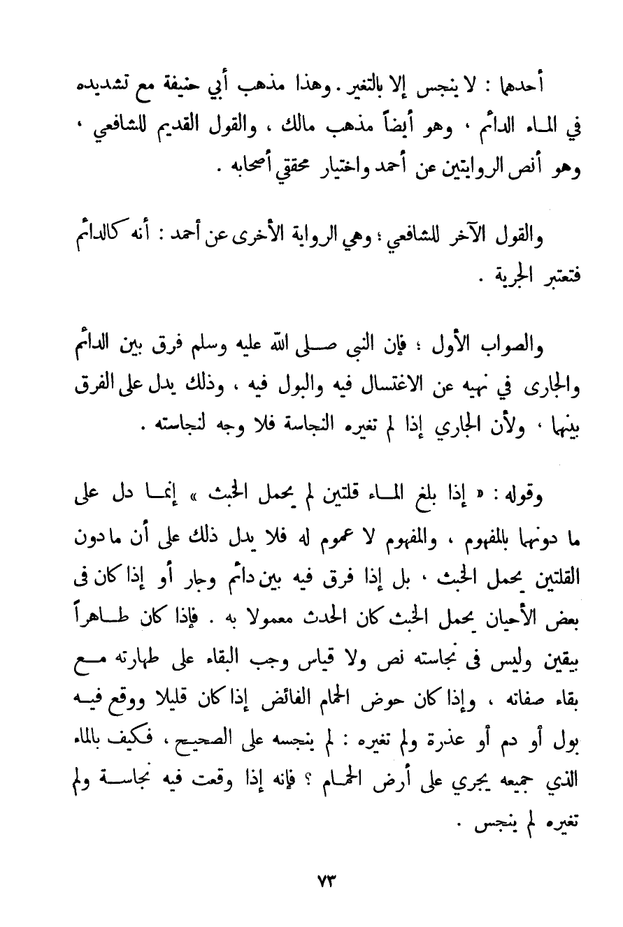 أَحَدُهُمَا: لَا يَنْجُسُ إلَّا بِالتَّغَيُّرِ. وَهَذَا مَذْهَبُ أَبِي حَنِيفَةَ مَعَ تَشْدِيدِهِ فِي الْمَاءِ الدَّائِمِ وَهُوَ أَيْضًا مَذْهَبُ مَالِكٍ وَالْقَوْلُ الْقَدِيمُ لِلشَّافِعِيِّ وَهُوَ أَنَصُّ الرِّوَايَتَيْنِ عَنْ أَحْمَد وَاخْتِيَارُ مُحَقِّقِي أَصْحَابِهِ. وَالْقَوْلُ الْآخَرُ لِلشَّافِعِيِّ؛ وَهِيَ الرِّوَايَةُ الْأُخْرَى عَنْ أَحْمَد: أَنَّهُ كَالدَّائِمِ فَتُعْتَبَرُ الْجَرْيَةُ. وَالصَّوَابُ الْأَوَّلُ؛ فَإِنَّ النَّبِيَّ صَلَّى اللَّهُ عَلَيْهِ وَسَلَّمَ فَرَّقَ بَيْنَ الدَّائِمِ وَالْجَارِي فِي نَهْيِهِ عَنْ الِاغْتِسَالِ فِيهِ وَالْبَوْلِ فِيهِ وَذَلِكَ يَدُلُّ عَلَى الْفَرْقِ بَيْنَهُمَا وَلِأَنَّ الْجَارِيَ إذَا لَمْ تُغَيِّرْهُ النَّجَاسَةُ فَلَا وَجْهَ لِنَجَاسَتِهِ. وَقَوْلُهُ: {إذَا بَلَغَ الْمَاءُ قُلَّتَيْنِ لَمْ يَحْمِلْ الْخَبَثَ} إنَّمَا دَلَّ عَلَى مَا دُونَهُمَا بِالْمَفْهُومِ وَالْمَفْهُومُ لَا عُمُومَ لَهُ فَلَا يَدُلُّ ذَلِكَ عَلَى أَنَّ مَا دُونُ الْقُلَّتَيْنِ يَحْمِلُ الْخَبَثَ بَلْ إذَا فُرِّقَ فِيهِ بَيْنَ دَائِمٍ وَجَارٍ أَوْ إذَا كَانَ فِي بَعْضِ الْأَحْيَانِ يَحْمِلُ الْخَبَثَ كَانَ الْحَدَثُ مَعْمُولًا بِهِ. فَإِذَا كَانَ طَاهِرًا بِيَقِينِ وَلَيْسَ فِي نَجَاسَتِهِ نَصٌّ وَلَا قِيَاسٌ وَجَبَ الْبَقَاءُ عَلَى طَهَارَتِهِ مَعَ بَقَاءِ صِفَاتِهِ وَإِذَا كَانَ حَوْضُ الْحَمَّامِ الْفَائِضِ إذَا كَانَ قَلِيلًا وَوَقَعَ فِيهِ بَوْلٌ أَوْ دَمٌ أَوْ عَذِرَةٌ وَلَمْ تُغَيِّرْهُ: لِمَ يُنَجِّسْهُ عَلَى الصَّحِيحِ فَكَيْفَ بِالْمَاءِ الَّذِي جَمِيعُهُ يَجْرِي عَلَى أَرْضِ الْحَمَّامِ؟ فَإِنَّهُ إذَا وَقَعَتْ فِيهِ نَجَاسَةٌ وَلَمْ تُغَيِّرْهُ لَمْ يَنْجُسْ.