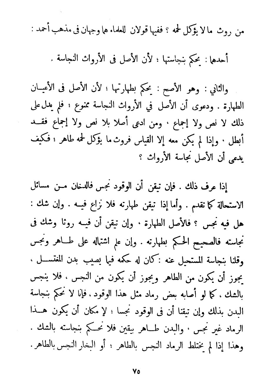 مِنْ رَوْثِ مَا لَا يُؤْكَلُ لَحْمُهُ؟ فَفِيهَا قَوْلَانِ لِلْعُلَمَاءِ هُمَا وَجْهَانِ فِي مَذْهَبِ أَحْمَد: أَحَدُهُمَا: يُحْكَمُ بِنَجَاسَتِهَا؛ لِأَنَّ الْأَصْلَ فِي الْأَرْوَاثِ النَّجَاسَةُ. وَالثَّانِي: وَهُوَ الْأَصَحُّ: يُحْكَمُ بِطَهَارَتِهَا؛ لِأَنَّ الْأَصْلَ فِي الْأَعْيَانِ الطَّهَارَةُ. وَدَعْوَى أَنَّ الْأَصْلَ فِي الْأَرْوَاثِ النَّجَاسَةُ مَمْنُوعٌ؛ فَلَمْ يَدُلَّ عَلَى ذَلِكَ لَا نَصٌّ وَلَا إجْمَاعٌ وَمَنْ ادَّعَى أَصْلًا بِلَا نَصٍّ وَلَا إجْمَاعٍ فَقَدْ أَبْطَلَ وَإِذَا لَمْ يَكُنْ مَعَهُ إلَّا الْقِيَاسُ فَرَوْثُ مَا يُؤْكَلُ لَحْمُهُ طَاهِرٌ؛ فَكَيْفَ يُدَّعَى أَنَّ الْأَصْلَ نَجَاسَةُ الْأَرْوَاثِ؟ إذَا عُرِفَ ذَلِكَ. فَإِنَّ تَيَقُّنَ أَنَّ الْوَقُودَ نَجِسٌ فَالدُّخَانُ مِنْ مَسَائِلِ الِاسْتِحَالَةِ كَمَا تَقَدَّمَ. وَأَمَّا إذَا تَيَقَّنَ طَهَارَتَهُ فَلَا نِزَاعَ فِيهِ. وَإِنْ شَكَّ: هَلْ فِيهِ نَجَسٌ؟ فَالْأَصْلُ الطَّهَارَةُ وَإِنْ تَيَقَّنَ أَنَّ فِيهِ رَوْثًا وَشَكَّ فِي نَجَاسَتِهِ فَالصَّحِيحُ الْحُكْمُ بِطَهَارَتِهِ. وَإِنْ عَلِمَ اشْتِمَالَهُ عَلَى طَاهِرٍ وَنَجِسٍ وَقُلْنَا بِنَجَاسَةِ الْمُسْتَحِيلِ عَنْهُ: كَانَ لَهُ حُكْمُهُ فِيمَا يُصِيبُ بَدَنَ الْمُغْتَسِلِ يَجُوزُ أَنْ يَكُونَ مِنْ الطَّاهِرِ وَيَجُوزُ أَنْ يَكُونَ مِنْ النَّجِسِ فَلَا يَنْجُسُ بِالشَّكِّ كَمَا لَوْ أَصَابَهُ بَعْضُ رَمَادٍ مِثْلَ هَذَا الْوَقُودِ فَإِنَّا لَا نَحْكُمُ بِنَجَاسَةِ الْبَدَنِ بِذَلِكَ وَإِنْ تَيَقَّنَّا أَنَّ فِي الْوَقُودِ نَجَسًا؛ لِإِمْكَانِ أَنْ يَكُونَ هَذَا الرَّمَادُ غَيْرَ نَجِسٍ وَالْبَدَنُ طَاهِرٌ بِيَقِينِ فَلَا نَحْكُمُ بِنَجَاسَتِهِ بِالشَّكِّ. وَهَذَا إذَا لَمْ يَخْتَلِطْ الرَّمَادُ النَّجِسُ بِالطَّاهِرِ؛ أَوْ الْبُخَارُ النَّجِسُ بِالطَّاهِرِ.