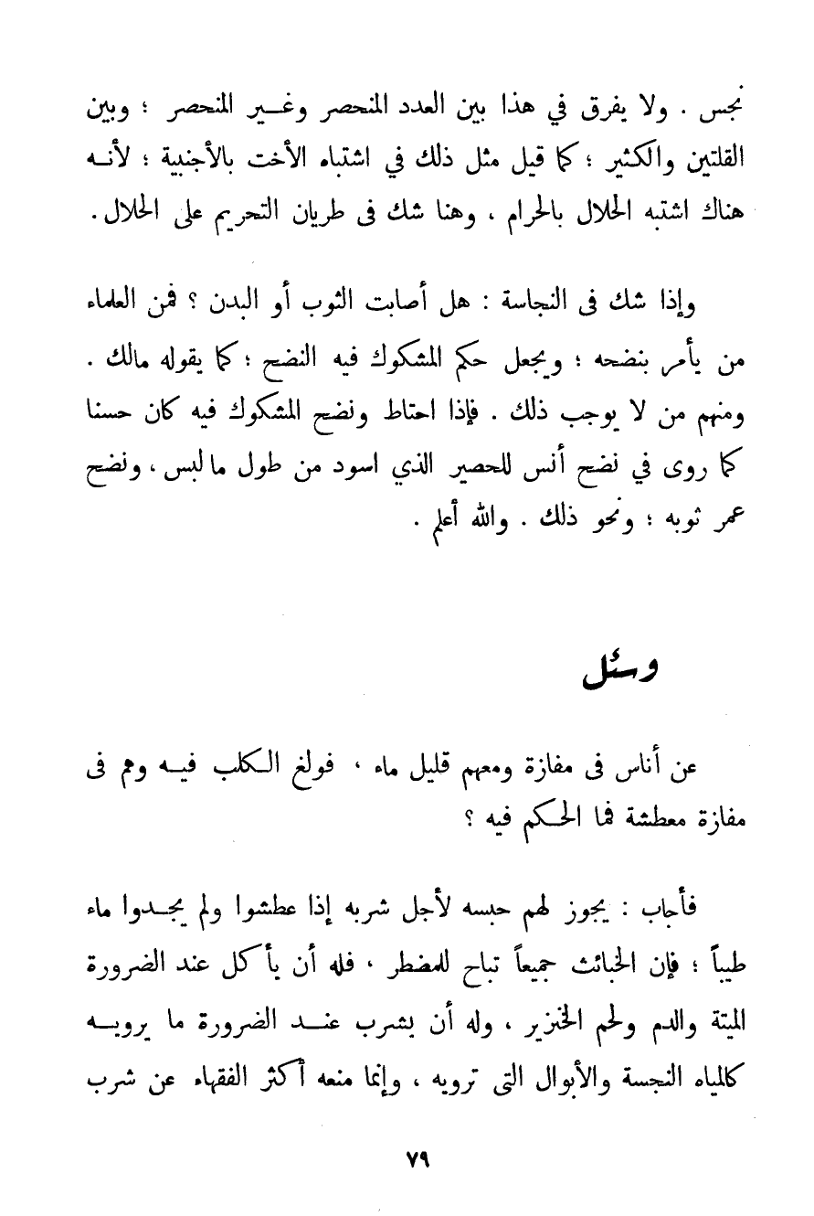 نَجِسٌ، وَلَا يُفَرَّقُ فِي هَذَا بَيْنَ الْعَدَدِ الْمُنْحَصِرِ وَغَيْرِ الْمُنْحَصِرِ؛ وَبَيْنَ الْقُلَّتَيْنِ وَالْكَثِيرِ؛ كَمَا قِيلَ مِثْلُ ذَلِكَ فِي اشْتِبَاهِ الْأُخْتِ بِالْأَجْنَبِيَّةِ؛ لِأَنَّهُ هُنَاكَ اشْتَبَهَ الْحَلَالُ بِالْحَرَامِ وَهُنَا شَكَّ فِي طريان التَّحْرِيمِ عَلَى الْحَلَالِ. وَإِذَا شَكَّ فِي النَّجَاسَةِ: هَلْ أَصَابَتْ الثَّوْبَ أَوْ الْبَدَنَ؟ فَمِنْ الْعُلَمَاءِ مَنْ يَأْمُرُ بِنَضَحِهِ؛ وَيَجْعَلُ حُكْمَ الْمَشْكُوكِ فِيهِ النَّضْحَ؛ كَمَا يَقُولُهُ مَالِكٌ. وَمِنْهُمْ مَنْ لَا يُوجِبُ ذَلِكَ. فَإِذَا احْتَاطَ وَنَضَحَ الْمَشْكُوكَ فِيهِ كَانَ حَسَنًا كَمَا رُوِيَ فِي نَضْحِ أَنَسٍ لِلْحَصِيرِ الَّذِي اسْوَدَّ مِنْ طُولِ مَا لُبِسَ وَنَضْحِ عُمَرَ ثَوْبَهُ؛ وَنَحْوَ ذَلِكَ. وَاَللَّهُ أَعْلَمُ.