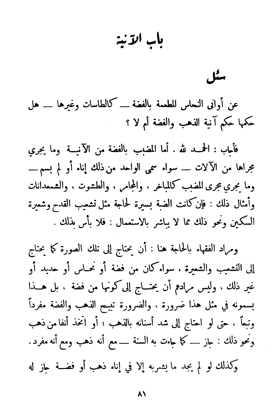 الْحَمْدُ لِلَّهِ، أَمَّا الْمُضَبَّبُ بِالْفِضَّةِ مِنْ الْآنِيَةِ وَمَا يَجْرِي مَجْرَاهَا مِنْ الْآلَاتِ - سَوَاءٌ سُمِّيَ الْوَاحِدُ مِنْ ذَلِكَ إنَاءً أَوْ لَمْ يُسَمَّ - وَمَا يَجْرِي مَجْرَى الْمُضَبَّبِ كَالْمَبَاخِرِ وَالْمَجَامِرِ وَالطُّشُوتِ والشمعدانات وَأَمْثَالِ ذَلِكَ: فَإِنْ كَانَتْ الضَّبَّةُ يَسِيرَةً لِحَاجَةِ مِثْلَ تَشْعِيبِ الْقَدَحِ وَشُعَيْرَةِ السِّكِّينِ وَنَحْوِ ذَلِكَ مِمَّا لَا يُبَاشَرُ بِالِاسْتِعْمَالِ: فَلَا بَأْسَ بِذَلِكَ. وَمُرَادُ الْفُقَهَاءِ بِالْحَاجَةِ هنا: أَنْ يَحْتَاجَ إلَى تِلْكَ الصُّورَةِ كَمَا يَحْتَاجُ إلَى التَّشْعِيبِ وَالشُّعَيْرَةِ سَوَاءٌ كَانَ مِنْ فِضَّةٍ أَوْ نُحَاسٍ أَوْ حَدِيدٍ أَوْ غَيْرِ ذَلِكَ وَلَيْسَ مُرَادُهُمْ أَنْ يَحْتَاجَ إلَى كَوْنِهَا مِنْ فِضَّةٍ بَلْ هَذَا يُسَمُّونَهُ فِي مِثْلِ هَذَا ضَرُورَةً وَالضَّرُورَةُ تُبِيحُ الذَّهَبَ وَالْفِضَّةَ مُفْرَدًا وَتَبَعًا حَتَّى لَوْ احْتَاجَ إلَى شَدِّ أَسْنَانِهِ بِالذَّهَبِ؛ أَوْ اتَّخَذَ أَنْفًا مِنْ ذَهَبٍ وَنَحْوَ ذَلِكَ: جَازَ - كَمَا جَاءَتْ بِهِ السُّنَّةُ - مَعَ أَنَّهُ ذَهَبٌ وَمَعَ أَنَّهُ مُفْرَدٌ. وَكَذَلِكَ لَوْ لَمْ يَجِدْ مَا يَشْرَبُهُ إلَّا فِي إنَاءِ ذَهَبٍ أَوْ فِضَّةٍ جَاز لَهُ