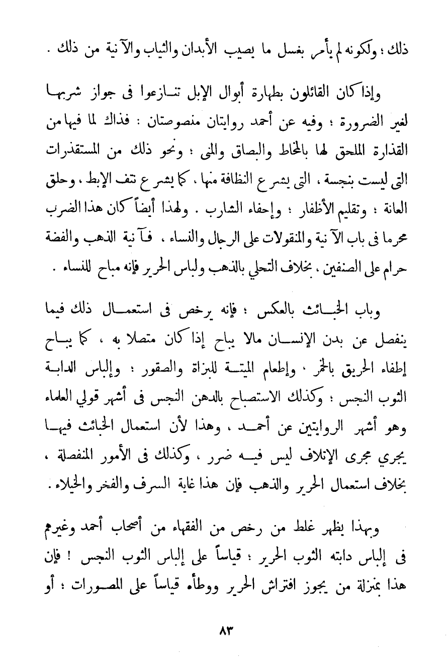 ذَلِكَ؛ وَلِكَوْنِهِ لَمْ يَأْمُرْ بِغَسْلِ مَا يُصِيبُ الْأَبْدَانَ وَالثِّيَابَ وَالْآنِيَةَ مِنْ ذَلِكَ. وَإِذَا كَانَ الْقَائِلُونَ بِطَهَارَةِ أَبْوَالِ الْإِبِلِ تَنَازَعُوا فِي جَوَازِ شُرْبِهَا لِغَيْرِ الضَّرُورَةِ؛ وَفِيهِ عَنْ أَحْمَد رِوَايَتَانِ مَنْصُوصَتَانِ: فَذَاكَ لِمَا فِيهَا مِنْ الْقَذَارَةِ الْمُلْحَقِ لَهَا بِالْمُخَاطِ وَالْبُصَاقِ وَالْمَنِيِّ؛ وَنَحْوِ ذَلِكَ مِنْ الْمُسْتَقْذَرَاتِ الَّتِي لَيْسَتْ بِنَجِسَةٍ الَّتِي يُشْرَعُ النَّظَافَةُ مِنْهَا كَمَا يُشْرَعُ نَتْفُ الْإِبِطِ وَحَلْقُ الْعَانَةِ؛ وَتَقْلِيمُ الْأَظْفَارِ؛ وَإِحْفَاءُ الشَّارِبِ. وَلِهَذَا أَيْضًا كَانَ هَذَا الضَّرْبُ مُحَرَّمًا فِي بَابِ الْآنِيَةِ وَالْمَنْقُولَاتِ عَلَى الرِّجَالِ وَالنِّسَاءِ فَآنِيَةُ الذَّهَبِ وَالْفِضَّةِ حَرَامٌ عَلَى الصِّنْفَيْنِ بِخِلَافِ التَّحَلِّي بِالذَّهَبِ وَلِبَاسِ الْحَرِيرِ فَإِنَّهُ مُبَاحٌ لِلنِّسَاءِ. وَبَابُ الْخَبَائِثِ بِالْعَكْسِ؛ فَإِنَّهُ يُرَخَّصُ فِي اسْتِعْمَالِ ذَلِكَ فِيمَا يَنْفَصِلُ عَنْ بَدَنِ الْإِنْسَانِ مَا لَا يُبَاحُ إذَا كَانَ مُتَّصِلًا بِهِ كَمَا يُبَاحُ إطْفَاءُ الْحَرِيقِ بِالْخَمْرِ وَإِطْعَامُ الْمَيْتَةِ لِلْبُزَاةِ وَالصُّقُورِ؛ وَإِلْبَاسُ الدَّابَّةِ الثَّوْبَ النَّجِسَ؛ وَكَذَلِكَ الِاسْتِصْبَاحُ بِالدُّهْنِ النَّجِسِ فِي أَشْهَرِ قَوْلَيْ الْعُلَمَاءِ وَهُوَ أَشْهَرُ الرِّوَايَتَيْنِ عَنْ أَحْمَد وَهَذَا لِأَنَّ اسْتِعْمَالَ الْخَبَائِثِ فِيهَا يَجْرِي مَجْرَى الْإِتْلَافِ لَيْسَ فِيهِ ضَرَرٌ وَكَذَلِكَ فِي الْأُمُورِ الْمُنْفَصِلَةِ بِخِلَافِ اسْتِعْمَالِ الْحَرِيرِ وَالذَّهَبِ فَإِنَّ هَذَا غَايَةُ السَّرَفِ وَالْفَخْرِ وَالْخُيَلَاءِ. وَبِهَذَا يَظْهَرُ غَلَطُ مَنْ رَخَّصَ مِنْ الْفُقَهَاءِ مِنْ أَصْحَابِ أَحْمَد وَغَيْرِهِمْ فِي إلْبَاسِ دَابَّتِهِ الثَّوْبَ الْحَرِيرَ؛ قِيَاسًا عَلَى إلْبَاسِ الثَّوْبِ النَّجِسِ فَإِنَّ هَذَا بِمَنْزِلَةِ مَنْ يُجَوِّزُ افْتِرَاشَ الْحَرِيرِ وَوَطْأَهُ قِيَاسًا عَلَى الْمُصَوَّرَاتِ؛ أَوْ
