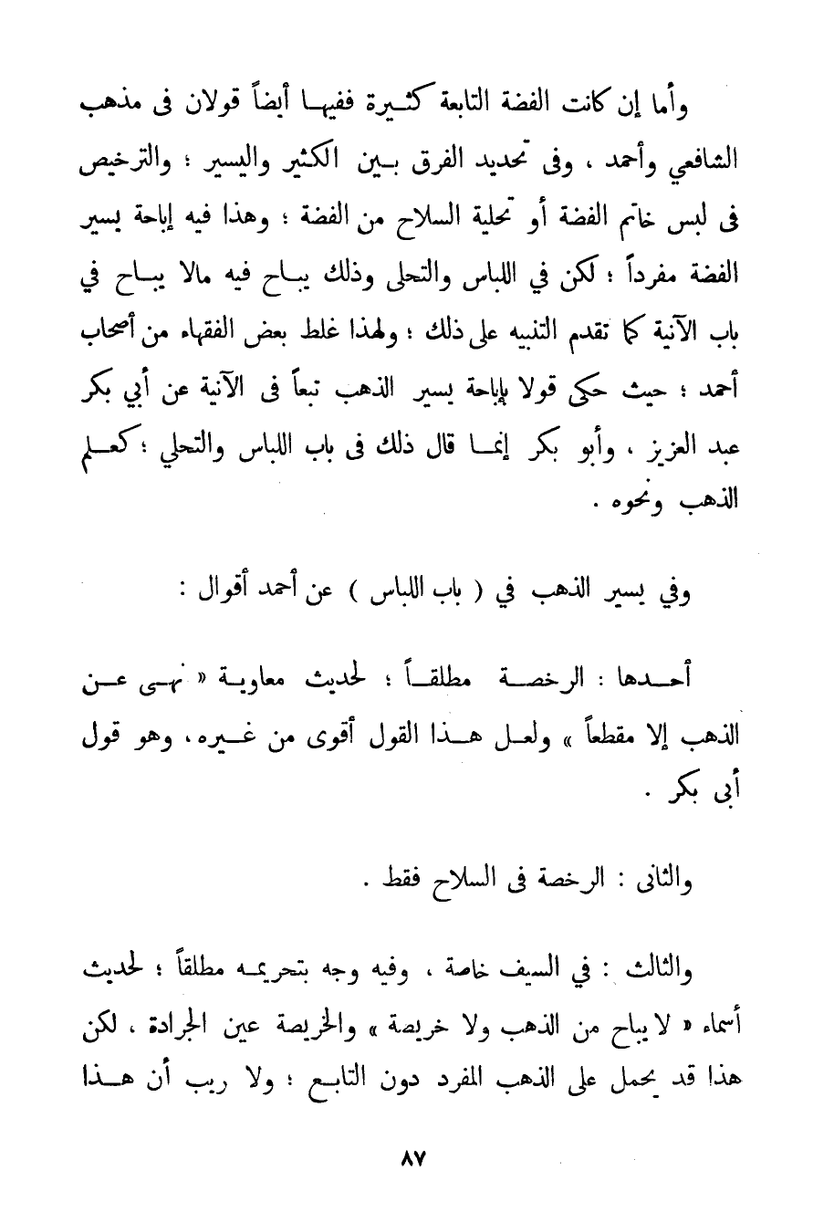وَأَمَّا إنْ كَانَتْ الْفِضَّةُ التَّابِعَةُ كَثِيرَةً فَفِيهَا أَيْضًا قَوْلَانِ فِي مَذْهَبِ الشَّافِعِيِّ وَأَحْمَد وَفِي تَحْدِيدِ الْفَرْقِ بَيْنَ الْكَثِيرِ وَالْيَسِيرِ؛ وَالتَّرْخِيصِ فِي لُبْسِ خَاتَمِ الْفِضَّةِ أَوْ تَحْلِيَةِ السِّلَاحِ مِنْ الْفِضَّةِ؛ وَهَذَا فِيهِ إبَاحَةُ يَسِيرِ الْفِضَّةِ مُفْرَدًا؛ لَكِنْ فِي اللِّبَاسِ وَالتَّحَلِّي وَذَلِكَ يُبَاحُ فِيهِ مَا لَا يُبَاحُ فِي بَاب الْآنِيَةِ كَمَا تَقَدَّمَ التَّنْبِيهُ عَلَى ذَلِكَ؛ وَلِهَذَا غَلِطَ بَعْضُ الْفُقَهَاءِ مِنْ أَصْحَابِ أَحْمَد؛ حَيْثُ حَكَى قَوْلًا بِإِبَاحَةِ يَسِيرِ الذَّهَبِ تَبَعًا فِي الْآنِيَةِ عَنْ أَبِي بَكْرٍ عَبْدِ الْعَزِيزِ وَأَبُو بَكْرٍ إنَّمَا قَالَ ذَلِكَ فِي بَابِ اللِّبَاسِ وَالتَّحَلِّي؛ كَعَلَمِ الذَّهَبِ وَنَحْوِهِ. وَفِي يَسِيرِ الذَّهَبِ فِي (بَابِ اللِّبَاسِ) عَنْ أَحْمَد أَقْوَالٌ: أَحَدُهَا: الرُّخْصَةُ مُطْلَقًا؛ لِحَدِيثِ مُعَاوِيَةَ {نَهَى عَنْ الذَّهَبِ إلَّا مُقَطَّعًا} وَلَعَلَّ هَذَا الْقَوْلَ أَقْوَى مِنْ غَيْرِهِ وَهُوَ قَوْلُ أَبِي بَكْرٍ. وَالثَّانِي: الرُّخْصَةُ فِي السِّلَاحِ فَقَطْ. وَالثَّالِثُ: فِي السَّيْفِ خَاصَّةً وَفِيهِ وَجْهٌ بِتَحْرِيمِهِ مُطْلَقًا؛ لِحَدِيثِ أَسْمَاءَ {لَا يُبَاحُ الذَّهَبُ وَلَا خَرِيصَةٌ} وَالْخَرِيصَةُ عَيْنُ الْجَرَادَةِ لَكِنَّ هَذَا قَدْ يُحْمَلُ عَلَى الذَّهَبِ الْمُفْرَدِ دُونَ التَّابِعِ؛ وَلَا رَيْبَ أَنَّ هَذَا