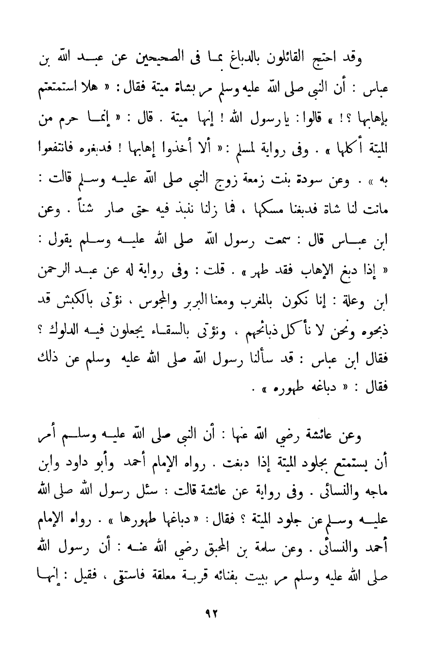 وَقَدْ احْتَجَّ الْقَائِلُونَ بِالدِّبَاغِ بِمَا فِي الصَّحِيحَيْنِ عَنْ عَبْدِ اللَّهِ بْنِ عَبَّاسٍ: {أَنَّ النَّبِيَّ صَلَّى اللَّهُ عَلَيْهِ وَسَلَّمَ مَرَّ بِشَاةِ مَيِّتَةٍ فَقَالَ: هَلَّا اسْتَمْتَعْتُمْ بِإِهَابِهَا قَالُوا: يَا رَسُولَ اللَّهِ إنَّهَا مَيِّتَةٌ. قَالَ: إنَّمَا حُرِّمَ مِنْ الْمَيْتَةِ أَكْلُهَا} . وَفِي رِوَايَةٍ لِمُسْلِمِ: {أَلَا أَخَذُوا إهَابَهَا فَدَبَغُوهُ فَانْتَفَعُوا بِهِ} . وَعَنْ {سَوْدَةَ بِنْتِ زمعة زَوْجِ النَّبِيِّ صَلَّى اللَّهُ عَلَيْهِ وَسَلَّمَ قَالَتْ: مَاتَتْ لَنَا شَاةٌ فَدَبَغْنَا مِسْكَهَا فَمَا زِلْنَا نَنْبِذُ فِيهِ حَتَّى صَارَ شَنًّا} . وَعَنْ ابْنِ عَبَّاسٍ قَالَ: سَمِعْت رَسُولَ اللَّهِ صَلَّى اللَّهُ عَلَيْهِ وَسَلَّمَ يَقُولُ: {إذَا دُبِغَ الْإِهَابُ فَقَدْ طَهُرَ} . قُلْت: وَفِي رِوَايَةٍ لَهُ عَنْ {عَبْدِ الرَّحْمَنِ بْنِ وَعْلَةَ: إنَّا نَكُونُ بِالْمَغْرِبِ وَمَعَنَا الْبَرْبَرُ وَالْمَجُوسُ نُؤْتَى بِالْكَبْشِ قَدْ ذَبَحُوهُ وَنَحْنُ لَا نَأْكُلُ ذَبَائِحَهُمْ وَنُؤْتَى بِالسِّقَاءِ يَجْعَلُونَ فِيهِ الدَّلُوكَ؟ فَقَالَ ابْنُ عَبَّاسٍ: قَدْ سَأَلْنَا رَسُولَ اللَّهِ صَلَّى اللَّهُ عَلَيْهِ وَسَلَّمَ عَنْ ذَلِكَ فَقَالَ: دِبَاغُهُ طَهُورُهُ} . وَعَنْ عَائِشَةَ رَضِيَ اللَّهُ عَنْهَا {أَنَّ النَّبِيَّ صَلَّى اللَّهُ عَلَيْهِ وَسَلَّمَ أَمَرَ أَنْ يُسْتَمْتَعَ بِجُلُودِ الْمَيْتَةِ إذَا دُبِغَتْ} . رَوَاهُ الْإِمَامُ أَحْمَد وَأَبُو دَاوُد وَابْنُ مَاجَه وَالنِّسَائِيّ. وَفِي رِوَايَةٍ عَنْ عَائِشَةَ قَالَتْ: {سُئِلَ رَسُولُ اللَّهِ صَلَّى اللَّهُ عَلَيْهِ وَسَلَّمَ عَنْ جُلُودِ الْمَيْتَةِ؟ فَقَالَ: دِبَاغُهَا طَهُورُهَا} . رَوَاهُ الْإِمَامُ أَحْمَد وَالنَّسَائِي. وَعَنْ سَلَمَةَ بْنِ الْمُحَبِّقِ رَضِيَ اللَّهُ عَنْهُ {أَنَّ رَسُولَ اللَّهِ صَلَّى اللَّهُ عَلَيْهِ وَسَلَّمَ مَرَّ بِبَيْتِ بِفِنَائِهِ قِرْبَةٌ مُعَلَّقَةٌ فَاسْتَقَى فَقِيلَ: إنَّهَا