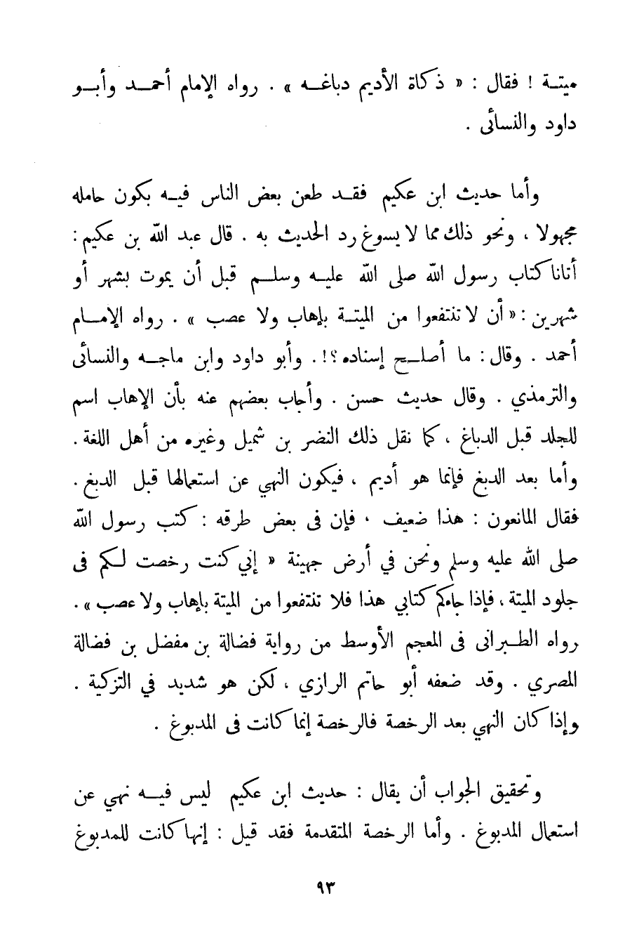 مَيْتَةٌ فَقَالَ: ذَكَاةُ الْأَدِيمِ دِبَاغُهُ} . رَوَاهُ الْإِمَامُ أَحْمَد وَأَبُو دَاوُد وَالنَّسَائِي. وَأَمَّا حَدِيثُ بْنِ عكيم فَقَدْ طَعَنَ بَعْضُ النَّاسِ فِيهِ بِكَوْنِ حَامِلِهِ مَجْهُولًا وَنَحْوِ ذَلِكَ مِمَّا لَا يَسُوغُ رَدُّ الْحَدِيثِ بِهِ. قَالَ {عَبْدُ اللَّهِ بْنُ عكيم: أَتَانَا كِتَابُ رَسُولِ اللَّهِ صَلَّى اللَّهُ عَلَيْهِ وَسَلَّمَ قَبْلَ أَنْ يَمُوتَ بِشَهْرِ أَوْ شَهْرَيْنِ: أَنْ لَا تَنْتَفِعُوا مِنْ الْمَيْتَةِ بِإِهَابِ وَلَا عَصَبٍ} . رَوَاهُ الْإِمَامُ أَحْمَد. وَقَالَ: مَا أَصْلَحَ إسْنَادَهُ. وَأَبُو دَاوُد وَابْنُ مَاجَه وَالنَّسَائِي وَالتِّرْمِذِي. وَقَالَ حَدِيثٌ حَسَنٌ. وَأَجَابَ بَعْضُهُمْ عَنْهُ بِأَنَّ الْإِهَابَ اسْمٌ لِلْجِلْدِ قَبْلَ الدِّبَاغِ كَمَا نَقَلَ ذَلِكَ النَّضْرُ بْنُ شميل وَغَيْرُهُ مِنْ أَهْلِ اللُّغَةِ. وَأَمَّا بَعْدَ الدَّبْغِ فَإِنَّمَا هُوَ أَدِيمٌ فَيَكُونُ النَّهْيُ عَنْ اسْتِعْمَالِهَا قَبْلَ الدَّبْغِ. فَقَالَ الْمَانِعُونَ: هَذَا ضَعِيفٌ فَإِنَّ فِي بَعْضِ طُرُقِهِ: {كَتَبَ رَسُولُ اللَّهِ صَلَّى اللَّهُ عَلَيْهِ وَسَلَّمَ وَنَحْنُ فِي أَرْضِ جُهَيْنَةَ إنِّي كُنْت رَخَّصْت لَكُمْ فِي جُلُودِ الْمَيْتَةِ فَإِذَا جَاءَكُمْ كِتَابِي هَذَا فَلَا تَنْتَفِعُوا مِنْ الْمَيْتَةِ بِإِهَابِ وَلَا عَصَبٍ} . رَوَاهُ الطَّبَرَانِي فِي الْمُعْجَمِ الْأَوْسَطِ مِنْ رِوَايَةِ فَضَالَةَ بْنِ مُفَضَّلِ بْنِ فَضَالَةَ الْمِصْرِيِّ. وَقَدْ ضَعَّفَهُ أَبُو حَاتِمٍ الرَّازِيَّ لَكِنْ هُوَ شَدِيدٌ فِي التَّزْكِيَةِ. وَإِذَا كَانَ النَّهْيُ بَعْدَ الرُّخْصَةِ فَالرُّخْصَةُ إنَّمَا كَانَتْ فِي الْمَدْبُوغِ. وَتَحْقِيقُ الْجَوَابِ أَنْ يُقَالَ: حَدِيثُ ابْنِ عكيم لَيْسَ فِيهِ نَهْيٌ عَنْ اسْتِعْمَالِ الْمَدْبُوغِ. وَأَمَّا الرُّخْصَةُ الْمُتَقَدِّمَةُ فَقَدْ قِيلَ: إنَّهَا كَانَتْ لِلْمَدْبُوغِ