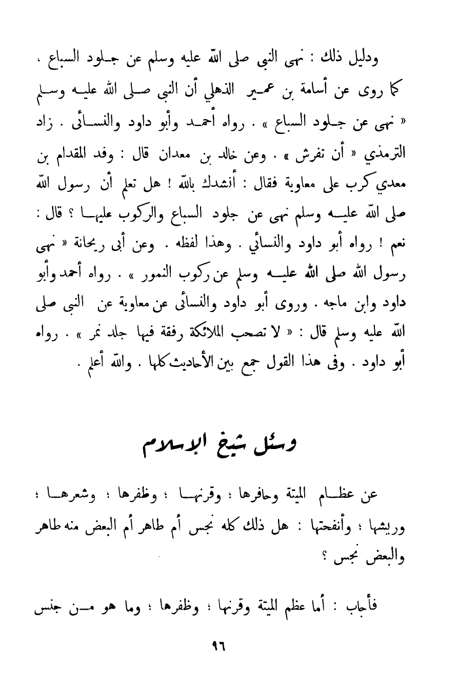 وَدَلِيلُ ذَلِكَ: نَهْيُ النَّبِيِّ صَلَّى اللَّهُ عَلَيْهِ وَسَلَّمَ عَنْ جُلُودِ السِّبَاعِ كَمَا رُوِيَ عَنْ أُسَامَةَ بْنِ عُمَيْرٍ الذهلي أَنَّ {النَّبِيَّ صَلَّى اللَّهُ عَلَيْهِ وَسَلَّمَ نَهَى عَنْ جُلُودِ السِّبَاعِ} . رَوَاهُ أَحْمَد وَأَبُو دَاوُد وَالنَّسَائِي. زَادَ التِّرْمِذِيُّ " أَنْ تُفْرَشَ ". وَعَنْ خَالِدِ بْنِ معدان قَالَ: {وَفَدَ الْمِقْدَامُ بْنُ مَعْدِي كرب عَلَى مُعَاوِيَةَ فَقَالَ: أَنْشُدُك بِاَللَّهِ هَلْ تَعْلَمُ أَنَّ رَسُولَ اللَّهِ صَلَّى اللَّهُ عَلَيْهِ وَسَلَّمَ نَهَى عَنْ جُلُودِ السِّبَاعِ وَالرُّكُوبِ عَلَيْهَا؟ قَالَ: نَعَمْ} رَوَاهُ أَبُو دَاوُد وَالنَّسَائِي. وَهَذَا لَفْظُهُ. وَعَنْ أَبِي رَيْحَانَةَ {نَهَى رَسُولُ اللَّهِ صَلَّى اللَّهُ عَلَيْهِ وَسَلَّمَ عَنْ رُكُوبِ النُّمُورِ} . رَوَاهُ أَحْمَد وَأَبُو دَاوُد وَابْنُ مَاجَه. وَرَوَى أَبُو دَاوُد وَالنَّسَائِي عَنْ مُعَاوِيَةَ عَنْ النَّبِيِّ صَلَّى اللَّهُ عَلَيْهِ وَسَلَّمَ قَالَ: {لَا تَصْحَبُ الْمَلَائِكَةُ رُفْقَةً فِيهَا جِلْدُ نَمِرٍ} . رَوَاهُ أَبُو دَاوُد. وَفِي هَذَا الْقَوْلِ جَمْعٌ بَيْنَ الْأَحَادِيثِ كُلِّهَا. وَاَللَّهُ أَعْلَمُ.