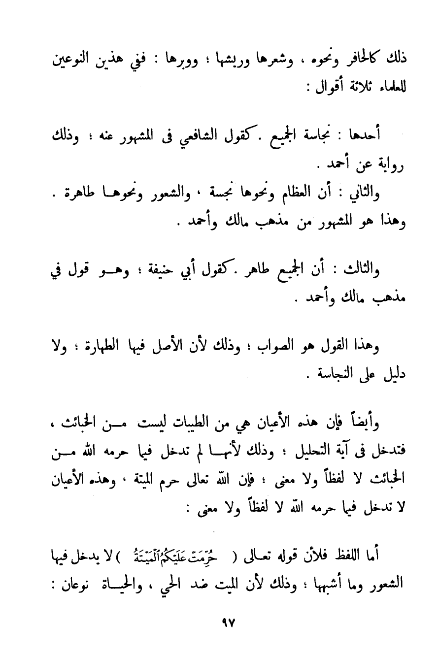 ذَلِكَ كَالْحَافِرِ وَنَحْوِهِ وَشَعْرِهَا وَرِيشِهَا؛ وَوَبَرِهَا: فَفِي هَذَيْنَ النَّوْعَيْنِ لِلْعُلَمَاءِ ثَلَاثَةُ أَقْوَالٍ: أَحَدُهَا: نَجَاسَةُ الْجَمِيعِ. كَقَوْلِ الشَّافِعِيِّ فِي الْمَشْهُورِ عَنْهُ؛ وَذَلِكَ رِوَايَةٌ عَنْ أَحْمَد. وَالثَّانِي: أَنَّ الْعِظَامَ وَنَحْوَهَا نَجِسَةٌ وَالشُّعُورَ وَنَحْوَهَا طَاهِرَةٌ. وَهَذَا هُوَ الْمَشْهُورُ مِنْ مَذْهَبِ مَالِكٍ وَأَحْمَد. وَالثَّالِثُ: أَنَّ الْجَمِيعَ طَاهِرٌ. كَقَوْلِ أَبِي حَنِيفَةَ؛ وَهُوَ قَوْلٌ فِي مَذْهَبِ مَالِكٍ وَأَحْمَد. وَهَذَا الْقَوْلُ هُوَ الصَّوَابُ؛ وَذَلِكَ لِأَنَّ الْأَصْلَ فِيهَا الطَّهَارَةُ؛ وَلَا دَلِيلَ عَلَى النَّجَاسَةِ. وَأَيْضًا فَإِنَّ هَذِهِ الْأَعْيَانَ هِيَ مِنْ الطَّيِّبَاتِ لَيْسَتْ مِنْ الْخَبَائِثِ فَتَدْخُلُ فِي آيَةِ التَّحْلِيلِ؛ وَذَلِكَ لِأَنَّهَا لَمْ تَدْخُلْ فِيمَا حَرَّمَهُ اللَّهُ مِنْ الْخَبَائِثِ لَا لَفْظًا وَلَا مَعْنًى؛ فَإِنَّ اللَّهَ تَعَالَى حَرَّمَ الْمَيْتَةَ وَهَذِهِ الْأَعْيَانُ لَا تَدْخُلُ فِيمَا حَرَّمَهُ اللَّهُ لَا لَفْظًا وَلَا مَعْنًى: أَمَّا اللَّفْظُ فَلِأَنَّ قَوْله تَعَالَى {حُرِّمَتْ عَلَيْكُمُ الْمَيْتَةُ} لَا يَدْخُلُ فِيهَا الشُّعُورُ وَمَا أَشْبَهَهَا؛ وَذَلِكَ لِأَنَّ الْمَيِّتَ ضِدُّ الْحَيِّ وَالْحَيَاةُ نَوْعَانِ: