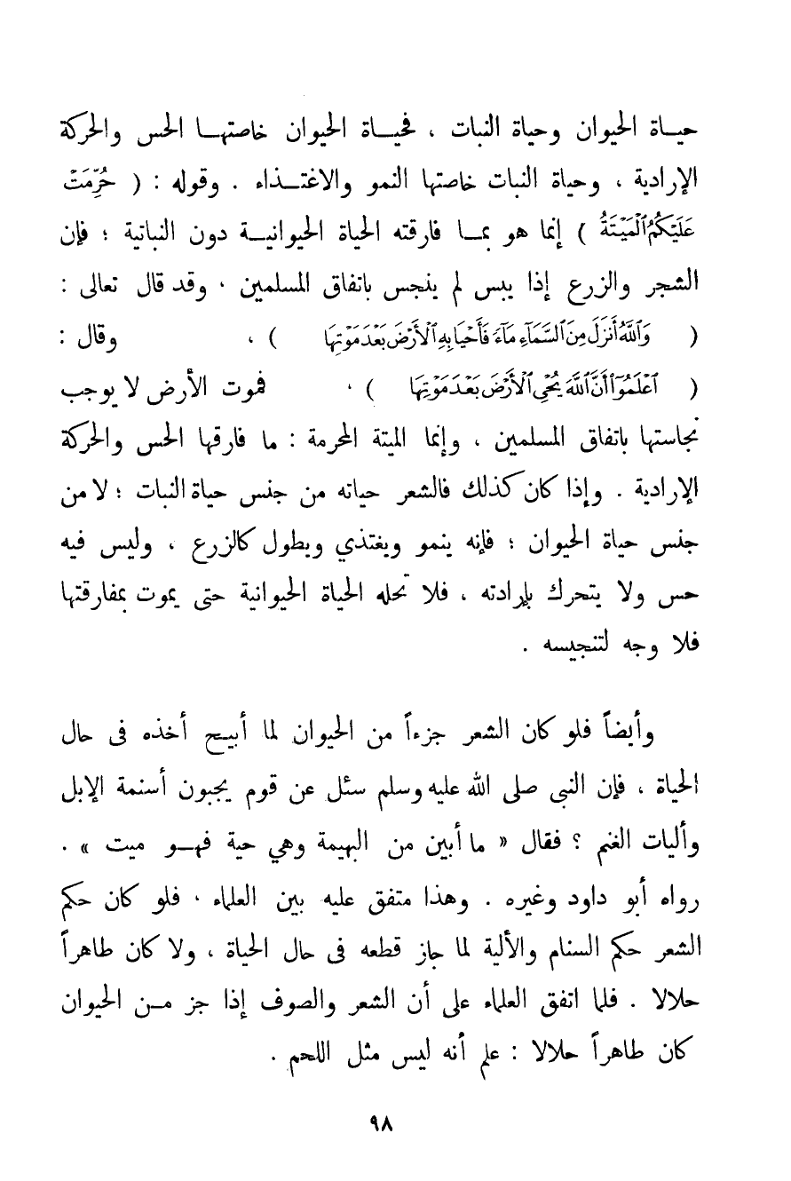 حَيَاةُ الْحَيَوَانِ وَحَيَاةُ النَّبَاتِ فَحَيَاةُ الْحَيَوَانِ خَاصَّتُهَا الْحِسُّ وَالْحَرَكَةُ الْإِرَادِيَّةُ وَحَيَاةُ النَّبَاتِ خَاصَّتُهَا النُّمُوُّ وَالِاغْتِذَاءُ. وَقَوْلُهُ: {حُرِّمَتْ عَلَيْكُمُ الْمَيْتَةُ} إنَّمَا هُوَ بِمَا فَارَقَتْهُ الْحَيَاةُ الْحَيَوَانِيَّةُ دُونَ النَّبَاتِيَّةِ؛ فَإِنَّ الشَّجَرَ وَالزَّرْعَ إذَا يَبِسَ لَمْ يَنْجُسْ بِاتِّفَاقِ الْمُسْلِمِينَ وَقَدْ قَالَ تَعَالَى: {وَاللَّهُ أَنْزَلَ مِنَ السَّمَاءِ مَاءً فَأَحْيَا بِهِ الْأَرْضَ بَعْدَ مَوْتِهَا} وَقَالَ: {اعْلَمُوا أَنَّ اللَّهَ يُحْيِي الْأَرْضَ بَعْدَ مَوْتِهَا} فَمَوْتُ الْأَرْضِ لَا يُوجِبُ نَجَاسَتَهَا بِاتِّفَاقِ الْمُسْلِمِينَ وَإِنَّمَا الْمَيْتَةُ الْمُحَرَّمَةُ: مَا فَارَقَهَا الْحِسُّ وَالْحَرَكَةُ الْإِرَادِيَّةُ. وَإِذَا كَانَ كَذَلِكَ فَالشَّعْرُ حَيَاتُهُ مَنْ جِنْسِ حَيَاةِ النَّبَاتِ؛ لَا مِنْ جِنْسِ حَيَاةِ الْحَيَوَانِ؛ فَإِنَّهُ يَنْمُو وَيَغْتَذِي وَيَطُولُ كَالزَّرْعِ وَلَيْسَ فِيهِ حِسٌّ وَلَا يَتَحَرَّكُ بِإِرَادَتِهِ فَلَا تَحِلُّهُ الْحَيَاةُ الْحَيَوَانِيَّةُ حَتَّى يَمُوتَ بِمُفَارَقَتِهَا فَلَا وَجْهَ لِتَنْجِيسِهِ. وَأَيْضًا فَلَوْ كَانَ الشَّعْرُ جُزْءًا مِنْ الْحَيَوَانِ لَمَا أُبِيحَ أَخْذُهُ فِي حَالِ الْحَيَاةِ فَإِنَّ {النَّبِيَّ صَلَّى اللَّهُ عَلَيْهِ وَسَلَّمَ سُئِلَ عَنْ قَوْمٍ يُحِبُّونَ أَسْنِمَةَ الْإِبِلِ وَأَلْيَاتِ الْغَنَمِ؟ فَقَالَ مَا أُبِينَ مِنْ الْبَهِيمَةِ وَهِيَ حَيَّةٌ فَهُوَ مَيِّتٌ} . رَوَاهُ أَبُو دَاوُد وَغَيْرُهُ. وَهَذَا مُتَّفَقٌ عَلَيْهِ بَيْنَ الْعُلَمَاءِ فَلَوْ كَانَ حُكْمُ الشَّعْرِ حُكْمَ السَّنَامِ وَالْأَلْيَةِ لَمَا جَازَ قَطْعُهُ فِي حَالِ الْحَيَاةِ وَلَا كَانَ طَاهِرًا حَلَالًا. فَلَمَّا اتَّفَقَ الْعُلَمَاءُ عَلَى أَنَّ الشَّعْرَ وَالصُّوفَ إذَا جُزَّ مِنْ الْحَيَوَانِ كَانَ طَاهِرًا حَلَالًا: عُلِمَ أَنَّهُ لَيْسَ مِثْلَ اللَّحْمِ.