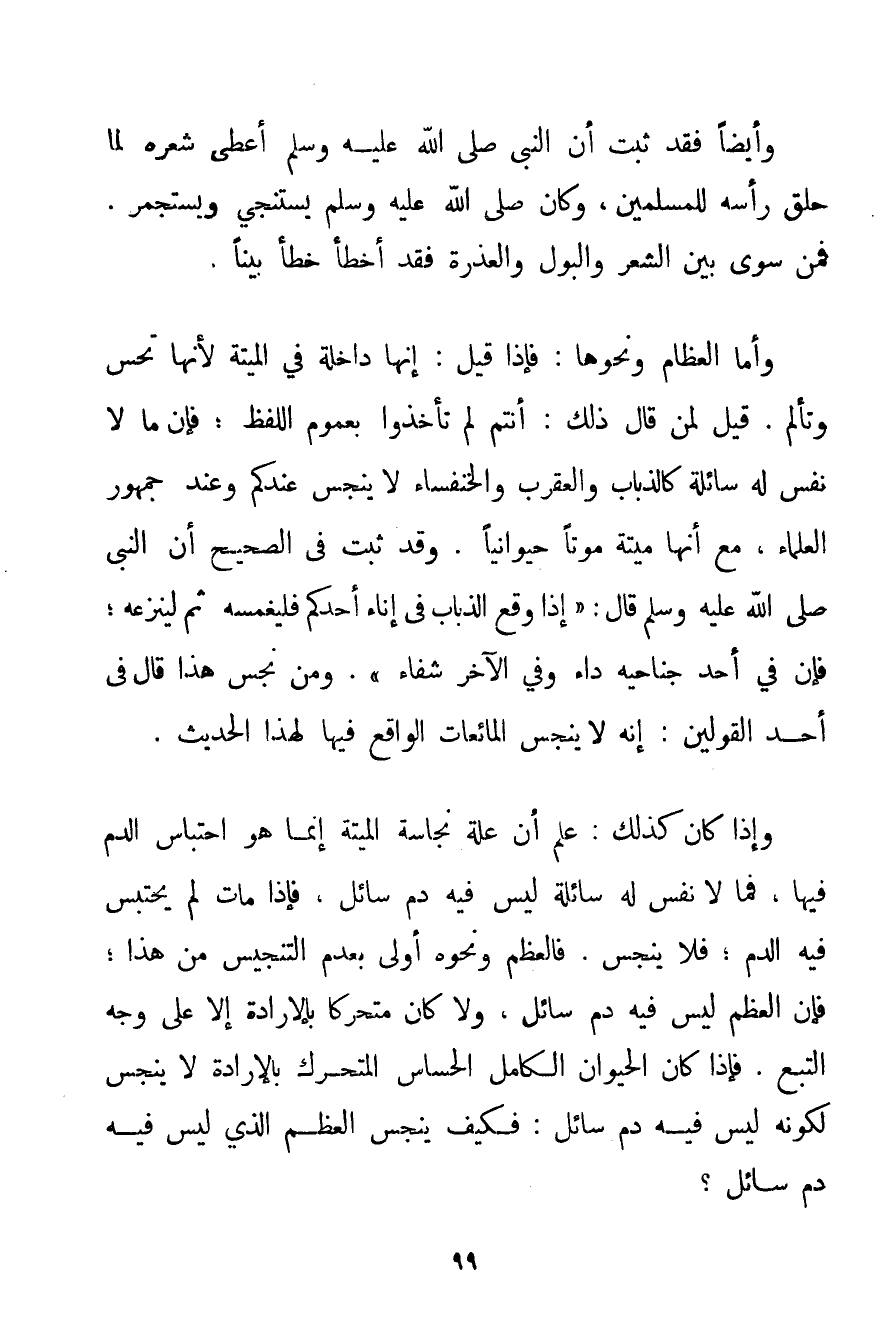 وَأَيْضًا فَقَدْ ثَبَتَ أَنَّ {النَّبِيَّ صَلَّى اللَّهُ عَلَيْهِ وَسَلَّمَ أَعْطَى شَعْرَهُ لَمَّا حَلَقَ رَأْسَهُ لِلْمُسْلِمِينَ} {وَكَانَ صَلَّى اللَّهُ عَلَيْهِ وَسَلَّمَ يَسْتَنْجِي وَيَسْتَجْمِرُ} . فَمَنْ سَوَّى بَيْنَ الشَّعْرِ وَالْبَوْلِ وَالْعَذِرَةِ فَقَدْ أَخْطَأَ خَطَأً بَيِّنًا. وَأَمَّا الْعِظَامُ وَنَحْوُهَا: فَإِذَا قِيلَ: إنَّهَا دَاخِلَةٌ فِي الْمَيْتَةِ لِأَنَّهَا تُحِسُّ وَتَأْلَمُ. قِيلَ لِمَنْ قَالَ ذَلِكَ: أَنْتُمْ لَمْ تَأْخُذُوا بِعُمُومِ اللَّفْظِ؛ فَإِنَّ مَا لَا نَفْسَ لَهُ سَائِلَةٌ كَالذُّبَابِ وَالْعَقْرَبِ وَالْخُنْفُسَاءِ لَا يُنَجِّسُ عِنْدَكُمْ وَعِنْدَ جُمْهُورِ الْعُلَمَاءِ مَعَ أَنَّهَا مَيِّتَةٌ مَوْتًا حَيَوَانِيًّا. وَقَدْ ثَبَتَ فِي الصَّحِيحِ أَنَّ النَّبِيَّ صَلَّى اللَّهُ عَلَيْهِ وَسَلَّمَ قَالَ: {إذَا وَقَعَ الذُّبَابُ فِي إنَاءِ أَحَدِكُمْ فَلْيَغْمِسْهُ ثُمَّ لِيَنْزِعْهُ؛ فَإِنَّ فِي أَحَدِ جَنَاحَيْهِ دَاءٌ وَفِي الْآخَرِ شِفَاءٌ} . وَمَنْ نَجَّسَ هَذَا قَالَ فِي أَحَدِ الْقَوْلَيْنِ: إنَّهُ لَا يُنَجِّسُ الْمَائِعَاتِ الْوَاقِعَ فِيهَا لِهَذَا الْحَدِيثِ. وَإِذَا كَانَ كَذَلِكَ: عُلِمَ أَنَّ عِلَّةَ نَجَاسَةِ الْمَيْتَةِ إنَّمَا هُوَ احْتِبَاسُ الدَّمِ فِيهَا فَمَا لَا نَفْسَ لَهُ سَائِلَةٌ لَيْسَ فِيهِ دَمٌ سَائِلٌ فَإِذَا مَاتَ لَمْ يَحْتَبِسْ فِيهِ الدَّمُ؛ فَلَا يُنَجِّسُ. فَالْعَظْمُ وَنَحْوُهُ أَوْلَى بِعَدَمِ التَّنْجِيسِ مِنْ هَذَا؛ فَإِنَّ الْعَظْمَ لَيْسَ فِيهِ دَمٌ سَائِلٌ وَلَا كَانَ مُتَحَرِّكًا بِالْإِرَادَةِ إلَّا عَلَى وَجْهِ التَّبَعِ. فَإِذَا كَانَ الْحَيَوَانُ الْكَامِلُ الْحَسَّاسُ الْمُتَحَرِّكُ بِالْإِرَادَةِ لَا يُنَجِّسُ لِكَوْنِهِ لَيْسَ فِيهِ دَمٌ سَائِلٌ: فَكَيْفَ يُنَجِّسُ الْعَظْمُ الَّذِي لَيْسَ فِيهِ دَمٌ سَائِلٌ؟