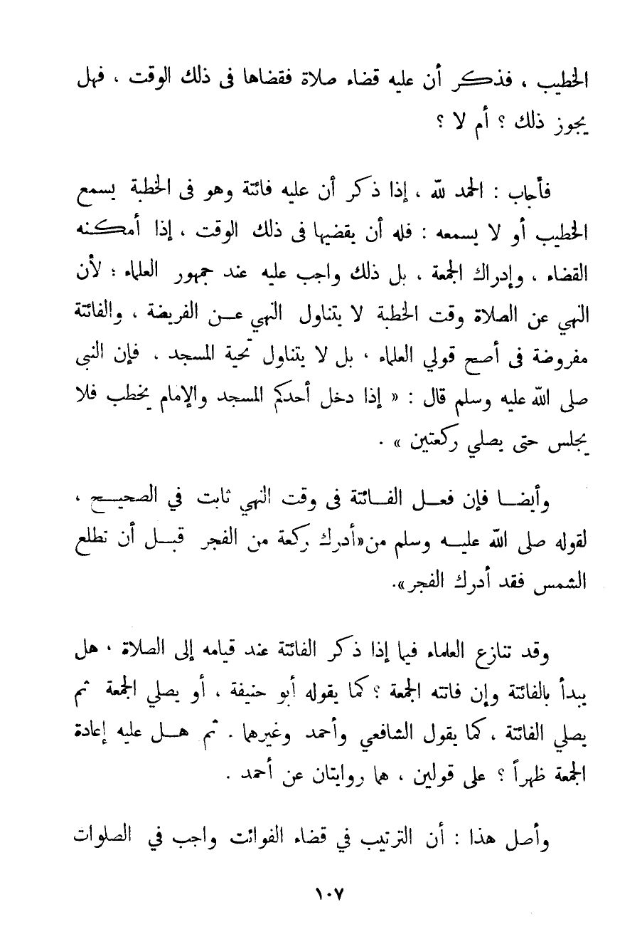 الْحَمْدُ لِلَّهِ، إذَا ذَكَرَ أَنَّ عَلَيْهِ فَائِتَةً وَهُوَ فِي الْخُطْبَةِ يَسْمَعُ الْخَطِيبَ أَوْ لَا يَسْمَعُهُ: فَلَهُ أَنْ يَقْضِيَهَا فِي ذَلِكَ الْوَقْتِ إذَا أَمْكَنَهُ الْقَضَاءُ وَإِدْرَاكُ الْجُمُعَةِ بَلْ ذَلِكَ وَاجِبٌ عَلَيْهِ عِنْدَ جُمْهُورِ الْعُلَمَاءِ؛ لِأَنَّ النَّهْيَ عَنْ الصَّلَاةِ وَقْتَ الْخُطْبَةِ لَا يَتَنَاوَلُ النَّهْيَ عَنْ الْفَرِيضَةِ وَالْفَائِتَةُ مَفْرُوضَةٌ فِي أَصَحِّ قَوْلَيْ الْعُلَمَاءِ بَلْ لَا يَتَنَاوَلُ تَحِيَّةَ الْمَسْجِدِ فَإِنَّ النَّبِيَّ صَلَّى اللَّهُ عَلَيْهِ وَسَلَّمَ قَالَ: " {إذَا دَخَلَ أَحَدُكُمْ الْمَسْجِدَ وَالْإِمَامُ يَخْطُبُ فَلَا يَجْلِسُ حَتَّى يُصَلِّيَ رَكْعَتَيْنِ} ". وَأَيْضًا فَإِنْ فِعْلَ الْفَائِتَةِ فِي وَقْتِ النَّهْيِ ثَابِتٌ فِي الصَّحِيحِ لِقَوْلِهِ صَلَّى اللَّهُ عَلَيْهِ وَسَلَّمَ {مَنْ أَدْرَكَ رَكْعَةً مِنْ الْفَجْرِ قَبْلَ أَنْ تَطْلُعَ الشَّمْسُ فَقَدْ أَدْرَكَ الْفَجْرَ} . وَقَدْ تَنَازَعَ الْعُلَمَاءُ فِيمَا إذَا ذَكَرَ الْفَائِتَةَ عِنْدَ قِيَامِهِ إلَى الصَّلَاةِ هَلْ يَبْدَأُ بِالْفَائِتَةِ وَإِنْ فَاتَتْهُ الْجُمُعَةُ؟ كَمَا يَقُولُهُ أَبُو حَنِيفَةَ أَوْ يُصَلِّي الْجُمُعَةَ ثُمَّ يُصَلِّي الْفَائِتَةَ كَمَا يَقُولُ الشَّافِعِيُّ وَأَحْمَد وَغَيْرُهُمَا. ثُمَّ هَلْ عَلَيْهِ إعَادَةُ الْجُمُعَةِ ظُهْرًا؟ عَلَى قَوْلَيْنِ هُمَا رِوَايَتَانِ عَنْ أَحْمَد. وَأَصْلُ هَذَا: أَنَّ التَّرْتِيبَ فِي قَضَاءِ الْفَوَائِتِ وَاجِبٌ فِي الصَّلَوَاتِ