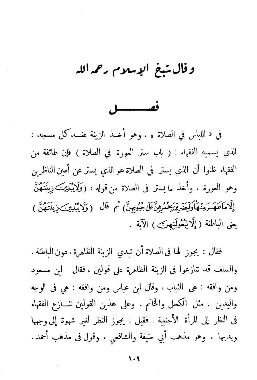 فِي " اللِّبَاسِ فِي الصَّلَاةِ " وَهُوَ أَخْذُ الزِّينَةِ عِنْدَ كُلِّ مَسْجِدٍ: الَّذِي يُسَمِّيهِ الْفُقَهَاءُ: (بَابُ سَتْرِ الْعَوْرَةِ فِي الصَّلَاةِ) فَإِنَّ طَائِفَةً مِنْ الْفُقَهَاءِ ظَنُّوا أَنَّ الَّذِي يُسْتَرُ فِي الصَّلَاةِ هُوَ الَّذِي يُسْتَرُ عَنْ أَعْيُنِ النَّاظِرِينَ وَهُوَ الْعَوْرَةُ وَأَخَذَ مَا يُسْتَرُ فِي الصَّلَاةِ مِنْ قَوْلِهِ: {وَلَا يُبْدِينَ زِينَتَهُنَّ إلَّا مَا ظَهَرَ مِنْهَا وَلْيَضْرِبْنَ بِخُمُرِهِنَّ عَلَى جُيُوبِهِنَّ} ثُمَّ قَالَ {وَلَا يُبْدِينَ زِينَتَهُنَّ} يَعْنِي الْبَاطِنَةَ {إلَّا لِبُعُولَتِهِنَّ} الْآيَةَ. فَقَالَ: يَجُوزُ لَهَا فِي الصَّلَاةِ أَنْ تُبْدِيَ الزِّينَةَ الظَّاهِرَةَ دُونَ الْبَاطِنَةِ. وَالسَّلَفُ قَدْ تَنَازَعُوا فِي الزِّينَةِ الظَّاهِرَةِ عَلَى قَوْلَيْنِ فَقَالَ: ابْنُ مَسْعُودٍ وَمَنْ وَافَقَهُ؛ هِيَ الثِّيَابُ وَقَالَ ابْنُ عَبَّاسٍ وَمَنْ وَافَقَهُ: هِيَ فِي الْوَجْهِ وَالْيَدَيْنِ مِثْلُ الْكُحْلِ وَالْخَاتَمِ. وَعَلَى هَذَيْنِ الْقَوْلَيْنِ تَنَازَعَ الْفُقَهَاءُ فِي النَّظَرِ إلَى الْمَرْأَةِ الْأَجْنَبِيَّةِ. فَقِيلَ: يَجُوزُ النَّظَرُ لِغَيْرِ شَهْوَةٍ إلَى وَجْهِهَا وَيَدَيْهَا وَهُوَ مَذْهَبُ أَبِي حَنِيفَةَ وَالشَّافِعِيِّ وَقَوْلٌ فِي مَذْهَبِ أَحْمَد.