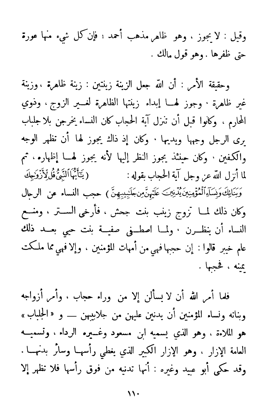 وَقِيلَ: لَا يَجُوزُ وَهُوَ ظَاهِرُ مَذْهَبِ أَحْمَد؛ فَإِنَّ كُلَّ شَيْءٍ مِنْهَا عَوْرَةٌ حَتَّى ظُفْرِهَا. وَهُوَ قَوْلُ مَالِكٍ. وَحَقِيقَةُ الْأَمْرِ: أَنَّ اللَّهَ جَعَلَ الزِّينَةَ زِينَتَيْنِ: زِينَةً ظَاهِرَةً وَزِينَةً غَيْرَ ظَاهِرَةٍ وَجَوَّزَ لَهَا إبْدَاءَ زِينَتَهَا الظَّاهِرَةَ لِغَيْرِ الزَّوْجِ وَذَوِي الْمَحَارِمِ. وَكَانُوا قَبْلَ أَنْ تَنْزِلَ آيَةُ الْحِجَابِ كَانَ النِّسَاءُ يَخْرُجْنَ بِلَا جِلْبَابٍ يَرَى الرَّجُلُ وَجْهَهَا وَيَدَيْهَا وَكَانَ إذْ ذَاكَ يَجُوزُ لَهَا أَنْ تُظْهِرَ الْوَجْهَ وَالْكَفَّيْنِ وَكَانَ حِينَئِذٍ يَجُوزُ النَّظَرُ إلَيْهَا لِأَنَّهُ يَجُوزُ لَهَا إظْهَارُهُ ثُمَّ لَمَّا أَنْزَلَ اللَّهُ عَزَّ وَجَلَّ آيَةَ الْحِجَابِ بِقَوْلِهِ: {يَا أَيُّهَا النَّبِيُّ قُلْ لِأَزْوَاجِكَ وَبَنَاتِكَ وَنِسَاءِ الْمُؤْمِنِينَ يُدْنِينَ عَلَيْهِنَّ مِنْ جَلَابِيبِهِنَّ} حَجَبَ النِّسَاءَ عَنْ الرِّجَالِ وَكَانَ ذَلِكَ لَمَّا تَزَوَّجَ زَيْنَبَ بِنْتَ جَحْشٍ فَأَرْخَى السِّتْرَ وَمَنَعَ النِّسَاءَ أَنْ يَنْظُرْنَ وَلَمَّا اصْطَفَى صَفِيَّةَ بِنْتَ حيي بَعْدَ ذَلِكَ عَامَ خَيْبَرَ قَالُوا: إنْ حَجَبَهَا فَهِيَ مِنْ أُمَّهَاتِ الْمُؤْمِنِينَ. وَإِلَّا فَهِيَ مِمَّا مَلَكَتْ يَمِينُهُ فَحَجَبَهَا. فَلَمَّا أَمَرَ اللَّهُ أَنْ لَا يَسْأَلْنَ إلَّا مِنْ وَرَاءِ حِجَابٍ وَأَمَرَ أَزْوَاجَهُ وَبَنَاتَه وَنِسَاءَ الْمُؤْمِنِينَ أَنْ يُدْنِينَ عَلَيْهِنَّ مِنْ جَلَابِيبِهِنَّ - و " الْجِلْبَابُ " هُوَ الْمُلَاءَةُ وَهُوَ الَّذِي يُسَمِّيهِ ابْنُ مَسْعُودٍ وَغَيْرُهُ الرِّدَاءَ وَتُسَمِّيهِ الْعَامَّةُ الْإِزَارَ وَهُوَ الْإِزَارُ الْكَبِيرُ الَّذِي يُغَطِّي رَأْسَهَا وَسَائِرَ بَدَنِهَا. وَقَدْ حَكَى أَبُو عَبِيدٍ وَغَيْرُهُ: أَنَّهَا تُدْنِيهِ مِنْ فَوْقِ رَأْسِهَا فَلَا تُظْهِرُ إلَّا
