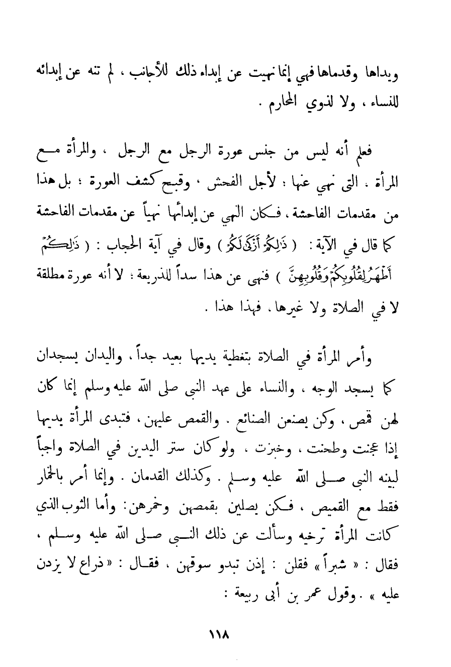 وَيَدَاهَا وَقَدَمَاهَا فَهِيَ إنَّمَا نُهِيَتْ عَنْ إبْدَاءِ ذَلِكَ لِلْأَجَانِبِ لَمْ تَنْهَ عَنْ إبْدَائِهِ لِلنِّسَاءِ وَلَا لِذَوِي الْمَحَارِمِ. فَعُلِمَ أَنَّهُ لَيْسَ مِنْ جِنْسِ عَوْرَةِ الرَّجُلِ مَعَ الرَّجُلِ وَالْمَرْأَةِ مَعَ الْمَرْأَةِ الَّتِي نُهِيَ عَنْهَا؛ لِأَجْلِ الْفُحْشِ وَقُبْحِ كَشْفِ الْعَوْرَةِ. بَلْ هَذَا مِنْ مُقَدِّمَاتِ الْفَاحِشَةِ فَكَانَ النَّهْيُ عَنْ إبْدَائِهَا نَهْيًا عَنْ مُقَدِّمَاتِ الْفَاحِشَةِ كَمَا قَالَ فِي الْآيَةِ: {ذَلِكُمْ أَزْكَى لَكُمْ} وَقَالَ فِي آيَةِ الْحِجَابِ: {ذَلِكُمْ أَطْهَرُ لِقُلُوبِكُمْ وَقُلُوبِهِنَّ} فَنَهَى عَنْ هَذَا سَدًّا لِلذَّرِيعَةِ؛ لَا أَنَّهُ عَوْرَةٌ مُطْلَقَةٌ لَا فِي الصَّلَاةِ وَلَا غَيْرِهَا فَهَذَا هَذَا. وَأَمْرُ الْمَرْأَةِ فِي الصَّلَاةِ بِتَغْطِيَةِ يَدَيْهَا بَعِيدٌ جِدًّا وَالْيَدَانِ يَسْجُدَانِ كَمَا يَسْجُدُ الْوَجْهُ وَالنِّسَاءُ عَلَى عَهْدِ النَّبِيِّ صَلَّى اللَّهُ عَلَيْهِ وَسَلَّمَ إنَّمَا كَانَ لَهُنَّ قُمَّصٌ وَكُنَّ يَصْنَعْنَ الصَّنَائِعَ والقمص عَلَيْهِنَّ فَتُبْدِي الْمَرْأَةُ يَدَيْهَا إذَا عَجَنَتْ وَطَحَنَتْ وَخَبَزَتْ وَلَوْ كَانَ سَتْرُ الْيَدَيْنِ فِي الصَّلَاةِ وَاجِبًا لَبَيَّنَهُ النَّبِيُّ صَلَّى اللَّهُ عَلَيْهِ وَسَلَّمَ. كَذَلِكَ الْقَدَمَانِ. وَإِنَّمَا أَمَرَ بِالْخِمَارِ فَقَطْ مَعَ الْقَمِيصِ فَكُنَّ يُصَلِّينَ بقمصهن وَخُمُرِهِنَّ: {وَأَمَّا الثَّوْبُ الَّتِي كَانَتْ الْمَرْأَةُ تُرْخِيهِ وَسَأَلَتْ عَنْ ذَلِكَ النَّبِيَّ صَلَّى اللَّهُ عَلَيْهِ وَسَلَّمَ فَقَالَ: شِبْرًا فَقُلْنَ: إذَنْ تَبْدُو سُوقُهُنَّ فَقَالَ: ذِرَاعٌ لَا يَزِدْنَ عَلَيْهِ} . وَقَوْلُ عُمَرَ بْنِ أَبِي رَبِيعَةَ: