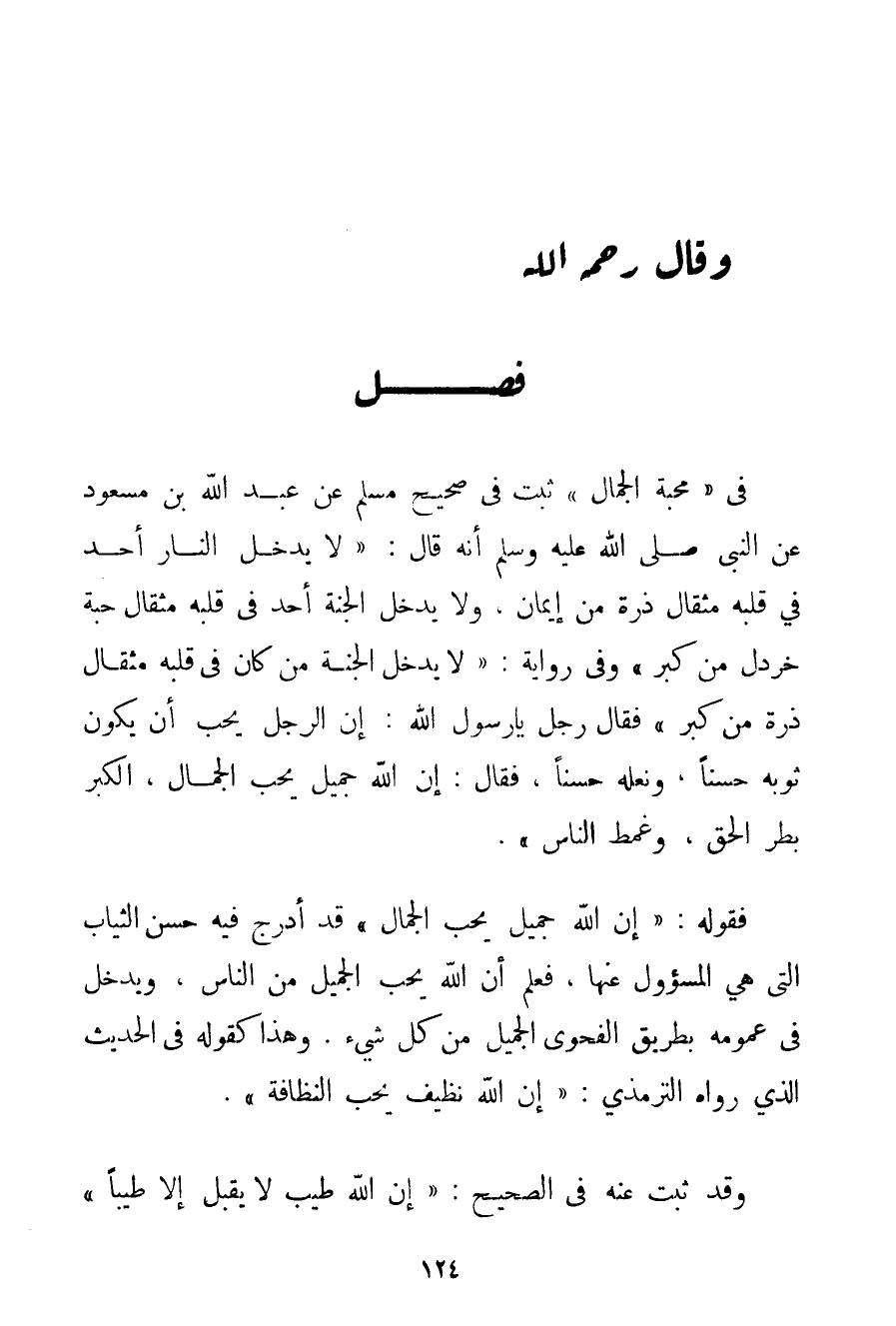 ثَبَتَ فِي صَحِيحِ مُسْلِمٍ عَنْ عَبْدِ اللَّهِ بْنِ مَسْعُودٍ عَنْ النَّبِيِّ صَلَّى اللَّهُ عَلَيْهِ وَسَلَّمَ أَنَّهُ قَالَ: " {لَا يَدْخُلُ النَّارَ أَحَدٌ فِي قَلْبِهِ مِثْقَالُ ذَرَّةٍ مِنْ إيمَانٍ وَلَا يَدْخُلُ الْجَنَّةَ أَحَدٌ فِي قَلْبِهِ مِثْقَالُ حَبَّةِ خَرْدَلٍ مِنْ كِبْرٍ وَفِي رِوَايَةٍ: لَا يَدْخُلُ الْجَنَّةَ مَنْ كَانَ فِي قَلْبِهِ مِثْقَالُ ذَرَّةٍ مِنْ كِبْرٍ فَقَالَ: رَجُلٌ يَا رَسُولَ اللَّهِ: إنَّ الرَّجُلَ يُحِبُّ أَنْ يَكُونَ ثَوْبُهُ حَسَنًا وَنَعْلُهُ حَسَنًا فَقَالَ: إنَّ اللَّهَ جَمِيلٌ يُحِبُّ الْجَمَالَ الْكِبْرُ بَطَرُ الْحَقِّ وَغَمْطُ النَّاسِ.} فَقَوْلُهُ: " {إنَّ اللَّهَ جَمِيلٌ يُحِبُّ الْجِمَالَ} " قَدْ أَدْرَجَ فِيهِ حُسْنَ الثِّيَابِ الَّتِي هِيَ الْمَسْئُولُ عَنْهَا فَعُلِمَ أَنَّ اللَّهَ يُحِبُّ الْجَمِيلَ مِنْ النَّاسِ وَيَدْخُلُ فِي عُمُومِهِ بِطَرِيقِ الْفَحْوَى الْجَمِيلُ مِنْ كُلِّ شَيْءٍ. وَهَذَا كَقَوْلِهِ فِي الْحَدِيثِ الَّذِي رَوَاهُ التِّرْمِذِيُّ: " {إنَّ اللَّهَ نَظِيفٌ يُحِبُّ النَّظَافَةَ} ". وَقَدْ ثَبَتَ عَنْهُ فِي الصَّحِيحِ: " {إنَّ اللَّهَ طَيِّبٌ لَا يَقْبَلُ إلَّا طَيِّبًا} "