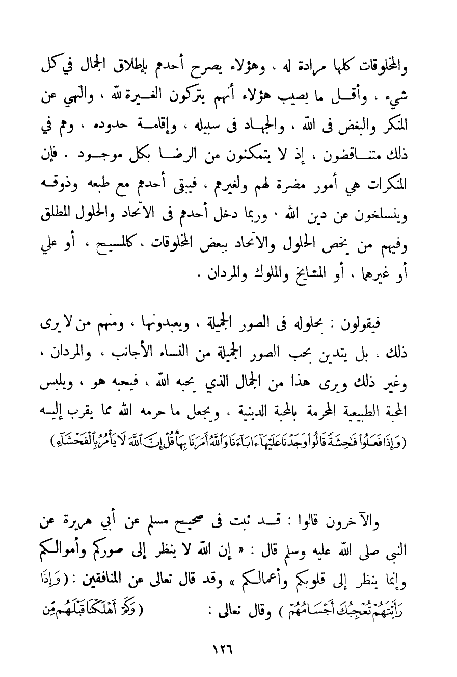 وَالْمَخْلُوقَاتُ كُلُّهَا مُرَادَةٌ لَهُ وَهَؤُلَاءِ يُصَرِّحُ أَحَدُهُمْ بِإِطْلَاقِ الْجَمَالِ فِي كُلِّ شَيْءٍ وَأَقَلُّ مَا يُصِيبُ هَؤُلَاءِ أَنَّهُمْ يَتْرُكُونَ الْغِيرَةَ لِلَّهِ وَالنَّهْيَ عَنْ الْمُنْكَرِ وَالْبُغْضِ فِي اللَّهِ وَالْجِهَادِ فِي سَبِيلِهِ وَإِقَامَةِ حُدُودِهِ وَهُمْ فِي ذَلِكَ مُتَنَاقِضُونَ إذْ لَا يَتَمَكَّنُونَ مِنْ الرِّضَا بِكُلِّ مَوْجُودٍ. فَإِنَّ الْمُنْكَرَاتِ هِيَ أُمُورٌ مُضِرَّةٌ لَهُمْ وَلِغَيْرِهِمْ فَيَبْقَى أَحَدُهُمْ مَعَ طَبْعِهِ وَذَوْقِهِ وَيَنْسَلِخُونَ عَنْ دِينِ اللَّهِ وَرُبَّمَا دَخَلَ أَحَدُهُمْ فِي الِاتِّحَادِ وَالْحُلُولِ الْمُطْلَقِ وَفِيهِمْ مَنْ يَخُصُّ الْحُلُولَ وَالِاتِّحَادَ بِبَعْضِ الْمَخْلُوقَاتِ كَالْمَسِيحِ أَوْ عَلِيٍّ أَوْ غَيْرِهِمَا أَوْ الْمَشَايِخِ وَالْمُلُوكِ والمردان. فَيَقُولُونَ: بِحُلُولِهِ فِي الصُّوَرِ الْجَمِيلَةِ وَيَعْبُدُونَهَا وَمِنْهُمْ مَنْ لَا يَرَى ذَلِكَ بَلْ يَتَدَيَّنُ بِحُبِّ الصُّوَرِ الْجَمِيلَةِ مِنْ النِّسَاءِ الْأَجَانِبِ والمردان وَغَيْرِ ذَلِكَ وَيَرَى هَذَا مِنْ الْجَمَالِ الَّذِي يُحِبُّهُ اللَّهُ فَيُحِبُّهُ هُوَ وَيُلْبِسُ الْمَحَبَّةَ الطَّبِيعِيَّةَ الْمُحَرَّمَةَ بِالْمَحَبَّةِ الدِّينِيَّةِ وَيَجْعَلُ مَا حَرَّمَهُ اللَّهُ مِمَّا يُقَرِّبُ إلَيْهِ {وَإِذَا فَعَلُوا فَاحِشَةً قَالُوا وَجَدْنَا عَلَيْهَا آبَاءَنَا وَاللَّهُ أَمَرَنَا بِهَا قُلْ إنَّ اللَّهَ لَا يَأْمُرُ بِالْفَحْشَاءِ} وَالْآخَرُونَ قَالُوا: قَدْ ثَبَتَ فِي صَحِيحِ مُسْلِمٍ عَنْ أَبِي هُرَيْرَةَ عَنْ النَّبِيِّ صَلَّى اللَّهُ عَلَيْهِ وَسَلَّمَ قَالَ: {إنَّ اللَّهَ لَا يَنْظُرُ إلَى صُوَرِكُمْ وَأَمْوَالِكُمْ وَإِنَّمَا يَنْظُرُ إلَى قُلُوبِكُمْ وَأَعْمَالِكُمْ} وَقَدْ قَالَ تَعَالَى عَنْ الْمُنَافِقِينَ: {وَإِذَا رَأَيْتَهُمْ تُعْجِبُكَ أَجْسَامُهُمْ} وَقَالَ تَعَالَى: {وَكَمْ أَهْلَكْنَا قَبْلَهُمْ مِنْ قَرْنٍ