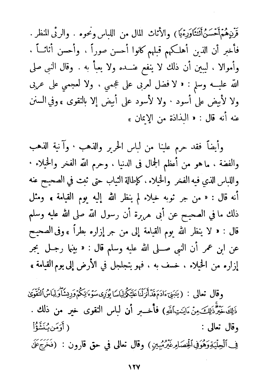 هُمْ أَحْسَنُ أَثَاثًا وَرِئْيًا} وَالْأَثَاثُ الْمَالُ مِنْ اللِّبَاسِ وَنَحْوِهِ. وَالرِّئْيُ الْمَنْظَرُ. فَأَخْبَرَ أَنَّ الَّذِينَ أَهْلَكَهُمْ قَبْلَهُمْ كَانُوا أَحْسَنَ صُوَرًا وَأَحْسَنَ أَثَاثًا وَأَمْوَالًا لِيُبَيِّنَ أَنَّ ذَلِكَ لَا يَنْفَعُ عِنْدَهُ وَلَا يَعْبَأُ بِهِ. وَقَالَ النَّبِيُّ صَلَّى اللَّهُ عَلَيْهِ وَسَلَّمَ " {لَا فَضْلَ لِعَرَبِيٍّ عَلَى عَجَمِيٍّ وَلَا لِعَجَمِيٍّ عَلَى عَرَبِيٍّ وَلَا لِأَبْيَضَ عَلَى أَسْوَدَ وَلَا لِأَسْوَدَ عَلَى أَبْيَضَ إلَّا بِالتَّقْوَى} وَفِي السُّنَنِ عَنْهُ أَنَّهُ قَالَ: {الْبَذَاذَةُ مِنْ الْإِيمَانِ} وَأَيْضًا فَقَدْ حَرَّمَ عَلَيْنَا مِنْ لِبَاسِ الْحَرِيرِ وَالذَّهَبِ وَآنِيَةِ الذَّهَبِ وَالْفِضَّةِ مَا هُوَ مِنْ أَعْظَمَ الْجَمَالِ فِي الدُّنْيَا وَحَرَّمَ اللَّهُ الْفَخْرَ وَالْخُيَلَاءَ وَاللِّبَاسَ الَّذِي فِيهِ الْفَخْرُ وَالْخُيَلَاءُ كَإِطَالَةِ الثِّيَابِ حَتَّى ثَبَتَ فِي الصَّحِيحِ عَنْهُ أَنَّهُ قَالَ: " {مَنْ جَرَّ ثَوْبَهُ خُيَلَاءَ لَمْ يَنْظُرْ اللَّهُ إلَيْهِ يَوْمَ الْقِيَامَةِ} وَمِثْلُ ذَلِكَ مَا فِي الصَّحِيحِ عَنْ أَبِي هُرَيْرَةَ {أَنَّ رَسُولَ اللَّهِ صَلَّى اللَّهُ عَلَيْهِ وَسَلَّمَ قَالَ: لَا يَنْظُرُ اللَّهُ يَوْمَ الْقِيَامَةِ إلَى مَنْ جَرَّ إزَارَهُ بَطَرًا} " وَفِي الصَّحِيحِ عَنْ ابْنِ عُمَرَ أَنَّ النَّبِيَّ صَلَّى اللَّهُ عَلَيْهِ وَسَلَّمَ قَالَ: {بَيْنَمَا رَجُلٌ يَجُرُّ إزَارَهُ مِنْ الْخُيَلَاءِ خُسِفَ بِهِ فَهُوَ يَتَجَلْجَلُ فِي الْأَرْضِ إلَى يَوْمِ الْقِيَامَةِ} وَقَالَ تَعَالَى: {يَا بَنِي آدَمَ قَدْ أَنْزَلْنَا عَلَيْكُمْ لِبَاسًا يُوَارِي سَوْآتِكُمْ وَرِيشًا وَلِبَاسُ التَّقْوَى ذَلِكَ خَيْرٌ ذَلِكَ مِنْ آيَاتِ اللَّهِ} فَأَخْبَرَ أَنَّ لِبَاسَ التَّقْوَى خَيْرٌ مِنْ ذَلِكَ. وَقَالَ تَعَالَى: {أَوَمَنْ يُنَشَّأُ فِي الْحِلْيَةِ وَهُوَ فِي الْخِصَامِ غَيْرُ مُبِينٍ} وَقَالَ تَعَالَى فِي حَقِّ قَارُونَ: {فَخَرَجَ عَلَى