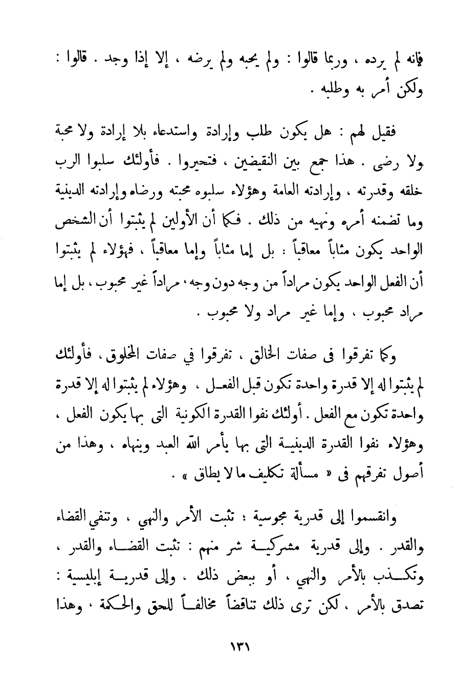 فَإِنَّهُ لَمْ يُرِدْهُ وَرُبَّمَا قَالُوا: وَلَمْ يُحِبَّهُ وَلَمْ يَرْضَهُ إلَّا إذَا وُجِدَ. قَالُوا. وَلَكِنْ أَمَرَ بِهِ وَطَلَبَهُ. فَقِيلَ لَهُمْ: هَلْ يَكُونُ طَلَبٌ وَإِرَادَةٌ وَاسْتِدْعَاءٌ بِلَا إرَادَةٍ وَلَا مَحَبَّةٍ وَلَا رِضًى. هَذَا جَمْعٌ بَيْنَ النَّقِيضَيْنِ فَتَحَيَّرُوا. فَأُولَئِكَ سَلَبُوا الرَّبَّ خَلْقَهُ وَقُدْرَتَهُ وَإِرَادَتَهُ الْعَامَّةَ وَهَؤُلَاءِ سَلَبُوهُ مَحَبَّتَهُ وَرِضَاهُ وَإِرَادَتَهُ الدِّينِيَّةَ وَمَا تَضَمَّنَهُ أَمْرُهُ وَنَهْيُهُ مِنْ ذَلِكَ. فَكَمَا أَنَّ الْأَوَّلِينَ لَمْ يُثْبِتُوا أَنَّ الشَّخْصَ الْوَاحِدَ يَكُونُ مُثَابًا مُعَاقَبًا: بَلْ إمَّا مُثَابًا وَإِمَّا مُعَاقَبًا فَهَؤُلَاءِ لَمْ يُثْبِتُوا أَنَّ الْفِعْلَ الْوَاحِدَ يَكُونُ مُرَادًا مِنْ وَجْهٍ دُونَ وَجْهٍ مُرَادًا غَيْرَ مَحْبُوبٍ بَلْ إمَّا مُرَادٌ مَحْبُوبٌ وَإِمَّا غَيْرُ مُرَادٍ وَلَا مَحْبُوبٍ. وَكَمَا تَفَرَّقُوا فِي صِفَاتِ الْخَالِقِ تَفَرَّقُوا فِي صِفَاتِ الْمَخْلُوقِ فَأُولَئِكَ لَمْ يُثْبِتُوا إلَّا قُدْرَةً وَاحِدَةً تَكُونُ قَبْلَ الْفِعْلِ وَهَؤُلَاءِ لَمْ يُثْبِتُوا لَهُ إلَّا قُدْرَةً وَاحِدَةً تَكُونُ مَعَ الْفِعْلِ. أُولَئِكَ نَفَوْا الْقُدْرَةَ الْكَوْنِيَّةَ الَّتِي بِهَا يَكُونُ الْفِعْلُ وَهَؤُلَاءِ نَفَوْا الْقُدْرَةَ الدِّينِيَّةَ الَّتِي بِهَا يَأْمُرُ اللَّهُ الْعَبْدَ وَيَنْهَاهُ وَهَذَا مِنْ أُصُولِ تُفَرِّقْهُمْ فِي " مَسْأَلَةِ تَكْلِيفِ مَا لَا يُطَاقُ ". وَانْقَسَمُوا إلَى قَدَرِيَّةٍ مَجُوسِيَّةٍ؛ تُثْبِتُ الْأَمْرَ وَالنَّهْيَ وَتَنْفِي الْقَضَاءَ وَالْقَدْرَ. وَإِلَى قَدَرِيَّةٍ مشركية شَرٍّ مِنْهُمْ: تُثْبِتُ الْقَضَاءَ وَالْقَدَرَ وَتُكَذِّبُ بِالْأَمْرِ وَالنَّهْيِ أَوْ بِبَعْضِ ذَلِكَ وَإِلَى قَدَرِيَّةٍ إبليسية: تُصَدِّقُ بِالْأَمْرِ لَكِنْ تَرَى ذَلِكَ تَنَاقُضًا مُخَالِفًا لِلْحَقِّ وَالْحِكْمَةِ وَهَذَا