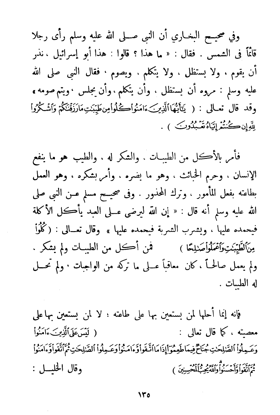 وَفِي صَحِيحِ الْبُخَارِيِّ {أَنَّ النَّبِيَّ صَلَّى اللَّهُ عَلَيْهِ وَسَلَّمَ رَأَى رَجُلًا قَائِمًا فِي الشَّمْسِ. فَقَالَ: مَا هَذَا؟ قَالُوا: هَذَا أَبُو إسْرَائِيلَ نَذَرَ أَنْ يَقُومَ وَلَا يَسْتَظِلَّ وَلَا يَتَكَلَّمَ وَيَصُومَ فَقَالَ النَّبِيُّ صَلَّى اللَّهُ عَلَيْهِ وَسَلَّمَ مُرُوهُ أَنْ يَسْتَظِلَّ وَأَنْ يَتَكَلَّمَ وَأَنْ يَجْلِسَ وَيُتِمَّ صَوْمَهُ} وَقَدْ قَالَ تَعَالَى: {يَا أَيُّهَا الَّذِينَ آمَنُوا كُلُوا مِنْ طَيِّبَاتِ مَا رَزَقْنَاكُمْ وَاشْكُرُوا لِلَّهِ إنْ كُنْتُمْ إيَّاهُ تَعْبُدُونَ} . فَأَمَرَ بِالْأَكْلِ مِنْ الطَّيِّبَاتِ وَالشُّكْرِ لَهُ وَالطَّيِّبُ هُوَ مَا يَنْفَعُ الْإِنْسَانَ وَحَرَّمَ الْخَبَائِثَ وَهُوَ مَا يَضُرُّهُ وَأَمَرَ بِشُكْرِهِ وَهُوَ الْعَمَلُ بِطَاعَتِهِ بِفِعْلِ الْمَأْمُورِ وَتَرْكِ الْمَحْذُورِ. وَفِي صَحِيحِ مُسْلِمٍ عَنْ النَّبِيِّ صَلَّى اللَّهُ عَلَيْهِ وَسَلَّمَ أَنَّهُ قَالَ: " {إنَّ اللَّهَ لَيَرْضَى عَلَى الْعَبْدِ يَأْكُلُ الْأَكْلَةَ فَيَحْمَدُهُ عَلَيْهَا وَيَشْرَبُ الشَّرْبَةَ فَيَحْمَدُهُ عَلَيْهَا} وَقَالَ تَعَالَى: {كُلُوا مِنَ الطَّيِّبَاتِ وَاعْمَلُوا صَالِحًا} فَمَنْ أَكَلَ مِنْ الطَّيِّبَاتِ وَلَمْ يَشْكُرْ وَلَمْ يَعْمَلْ صَالِحًا كَانَ مُعَاقَبًا عَلَى مَا تَرَكَهُ مِنْ الْوَاجِبَاتِ وَلَمْ تَحِلَّ لَهُ الطَّيِّبَاتُ. فَإِنَّهُ إنَّمَا أَحَلَّهَا لِمَنْ يَسْتَعِينُ بِهَا عَلَى طَاعَتِهِ؛ لَا لِمَنْ يَسْتَعِينُ بِهَا عَلَى مَعْصِيَتِهِ كَمَا قَالَ تَعَالَى: {لَيْسَ عَلَى الَّذِينَ آمَنُوا وَعَمِلُوا الصَّالِحَاتِ جُنَاحٌ فِيمَا طَعِمُوا إذَا مَا اتَّقَوْا وَآمَنُوا وَعَمِلُوا الصَّالِحَاتِ ثُمَّ اتَّقَوْا وَآمَنُوا ثُمَّ اتَّقَوْا وَأَحْسَنُوا وَاللَّهُ يُحِبُّ الْمُحْسِنِينَ} وَقَالَ الْخَلِيلُ: