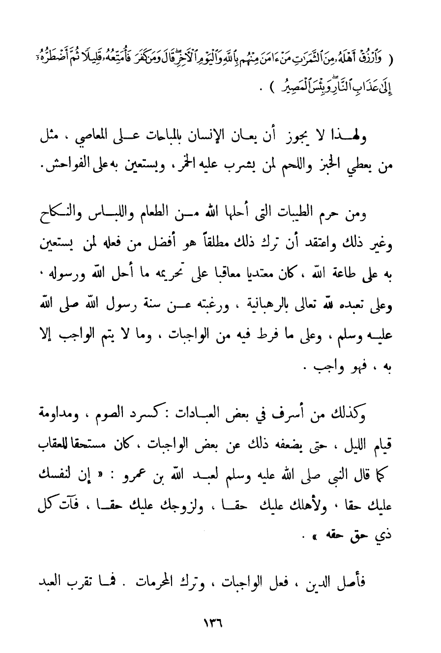 {وَارْزُقْ أَهْلَهُ مِنَ الثَّمَرَاتِ مَنْ آمَنَ مِنْهُمْ بِاللَّهِ وَالْيَوْمِ الْآخِرِ قَالَ وَمَنْ كَفَرَ فَأُمَتِّعُهُ قَلِيلًا ثُمَّ أَضْطَرُّهُ إلَى عَذَابِ النَّارِ وَبِئْسَ الْمَصِيرُ} . وَلِهَذَا لَا يَجُوزُ أَنْ يُعَانَ الْإِنْسَانُ بِالْمُبَاحَاتِ عَلَى الْمَعَاصِي مِثْلَ مَنْ يُعْطِي الْخُبْزَ وَاللَّحْمَ لِمَنْ يَشْرَبُ عَلَيْهِ الْخَمْرَ وَيَسْتَعِينُ بِهِ عَلَى الْفَوَاحِشِ. وَمَنْ حَرَّمَ الطَّيِّبَاتِ الَّتِي أَحَلَّهَا اللَّهُ مِنْ الطَّعَامِ وَاللِّبَاسِ وَالنِّكَاحِ وَغَيْرِ ذَلِكَ وَاعْتَقَدَ أَنَّ تَرْكَ ذَلِكَ مُطْلَقًا هُوَ أَفْضَلُ مِنْ فِعْلِهِ لِمَنْ يَسْتَعِينُ بِهِ عَلَى طَاعَةِ اللَّهِ كَانَ مُعْتَدِيًا مُعَاقَبًا عَلَى تَحْرِيمِهِ مَا أَحَلَّ اللَّهُ وَرَسُولُهُ وَعَلَى تَعَبُّدِهِ لِلَّهِ تَعَالَى بالرهبانية وَرَغْبَتِهِ عَنْ سُنَّةِ رَسُولِ اللَّهِ صَلَّى اللَّهُ عَلَيْهِ وَسَلَّمَ وَعَلَى مَا فَرَّطَ فِيهِ مِنْ الْوَاجِبَاتِ وَمَا لَا يَتِمُّ الْوَاجِبُ إلَّا بِهِ فَهُوَ وَاجِبٌ. كَذَلِكَ مَنْ أَسْرَفَ فِي بَعْضِ الْعِبَادَاتِ: كَسَرْدِ الصَّوْمِ وَمُدَاوَمَةِ قِيَامِ اللَّيْلِ حَتَّى يُضْعِفَهُ ذَلِكَ عَنْ بَعْضِ الْوَاجِبَاتِ كَانَ مُسْتَحِقًّا لِلْعِقَابِ كَمَا قَالَ النَّبِيُّ صَلَّى اللَّهُ عَلَيْهِ وَسَلَّمَ لِعَبْدِ اللَّهِ بْنِ عَمْرٍو: " {إنَّ لِنَفْسِك عَلَيْك حَقًّا وَلِأَهْلِك عَلَيْك حَقًّا وَلِزَوْجِك عَلَيْك حَقًّا فَآتِ كُلَّ ذِي حَقٍّ حَقَّهُ} .